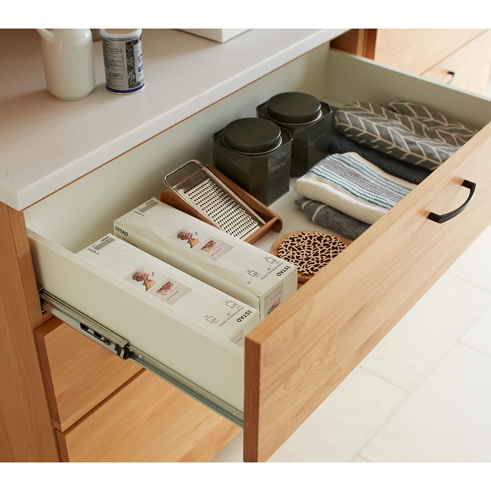設置場所を選ばない省スペース設計ながらおしゃれなデザインとアルダー無垢材、人工大理石などを贅沢に使用したハイクオリティな北欧風キッチンボード。限られた空間で最大限に心地よく素敵に暮らす“コンパクト・リッチ”を叶えます。コンパクトさとハイクオリティを兼ね備えて ピッピコンパクトキッチン シリーズ無垢材を贅沢に使用した前板と人工大理石が、上質感たっぷりなキッチン収納シリーズ。木の質感だけでなく、光をはじいてキッチンをより明るく見せてくれるクロスガラスや持ちやすく機能的でデザインのアクセントにもなる取っ手など、大人の遊び心を感じさせるビジュアルも魅力。全体的にコンパクトなサイズ感に抑え、昨今の日本の住宅事情に合わせた設計で憧れの北欧風キッチンを簡単に再現できるシリーズです。熱に強くお手入れ簡単な、人工大理石を使用したキッチン収納◆清潔感漂うホワイト系の天板は熱や汚れに強い人工大理石でできています。◆耐荷重30kgで大型レンジの家電収納としてはもちろん、調理台としてもご使用いただけます。◆パン生地をこねるなどの本格的な趣味の料理から、ちょっとした調理の際にも便利です。◆人工大理石に傷がついても、サンドペーパーでやさしく磨けば元通りになるので、家電ラック、レンジラックとして安心してお使いいただけます。◆人工大理石は傷や手垢が目立たない、扱いやすい素材です。天然木でもお手入れ簡単、水周りでも安心なウレタン塗装◆優しい風合いと存在感が魅力の天然木だけれど、お手入れが面倒…?そんなことはありません。◆天然木部分にはウレタン塗装を施し、水や汚れに配慮。さっと拭き取れば元通りの美しさに。◆ウレタン塗装は一般的なダイニングテーブルにも使用されるものです。◆天然木の表情がまるで憧れの輸入キッチンのような雰囲気を感じさせてくれるレンジ台です。光を弾くクロスガラスは美しいだけでなく、キッチンにふさわしい機能的な素材。◆前面に使用されたクロスガラスは、光を反射して美しい素材。◆きれいなだけでなく、収納物をうっすらと目隠しして雑多な印象を与えない効果も。◆内部に色や柄付きの食器をたくさん収納しても、すっきりとした印象を与えてくれます。◆クロスガラスは光を優しく反射して、キッチンを明るい印象にしてくれる点も魅力。収納ボリュームもたっぷり、収納力が自慢のキッチンボード◆引出しには全段フルスライドレールを採用。奥までスムーズに引き出せるので出し入れが楽々。◆カトラリーから小皿、散らばりがちなキッチンアイテムまで安心して収納できる食品ストッカー・キッチンストッカーとしても重宝します。◆開き戸部分には可動棚板をセット。たっぷり収納できるので、食器などを収納してカップボード、キッチンボードとしても。◆脚部が8cm空いているのでお掃除もラクラク。いつでも清潔に保つことが出来ます。信頼と安心の国内工場で生産された、日本製のキッチン収納◆国内の職人がひとつずつ丁寧に仕上げたキッチンラック・ダイニングボードです。◆細部の丁寧な仕上がりなど、国産品ならではの高品質を台所でお楽しみください。◆素材はグレードの高い「F☆☆☆☆」材を使用しました!! ※「F☆☆☆☆」材とは…JISにより定められている安全性の高い規格であり、人にも環境にもやさしい素材を使用しています。