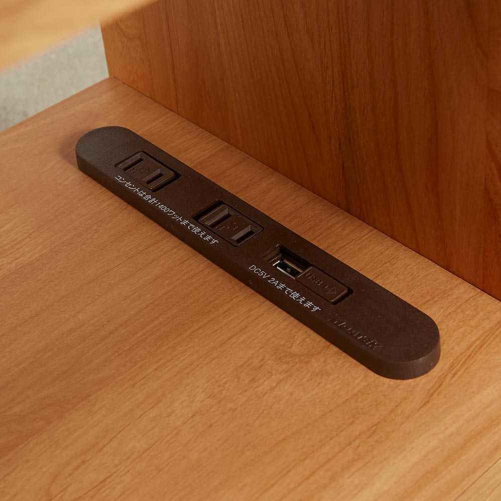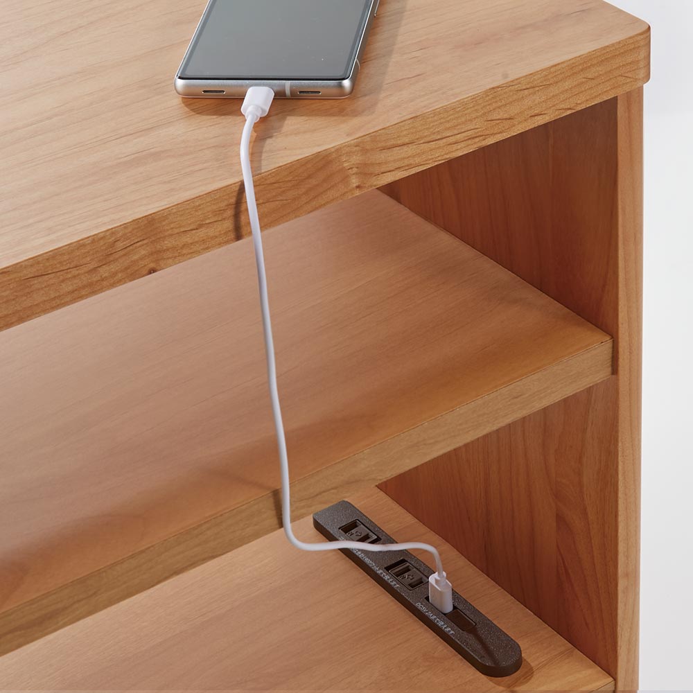 アームシェルフにUSB付きコンセントがあり充電などに重宝。