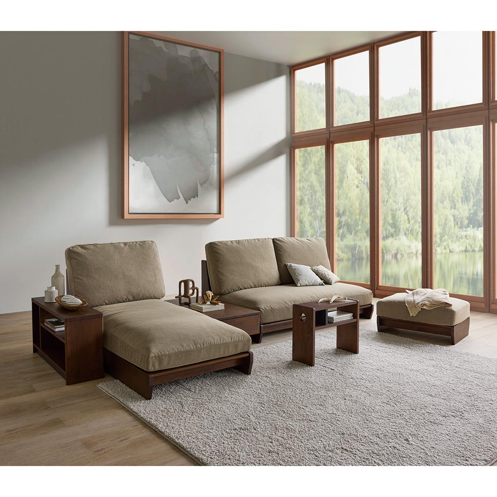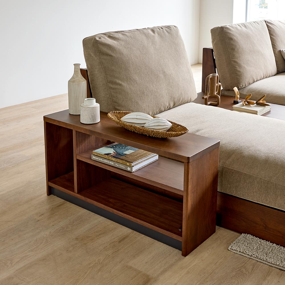 Arietta/アリエッタソファシリーズに取り入れたいアームシェルフ。肘掛けとして、本棚として、サイドテーブルとして。2口コンセント付きで、テーブルランプやオーディオ、充電などに便利です。ソファの肘置きにもなるアームシェルフ。日々の使いやすさを叶えるプラス機能をソファまわりに。