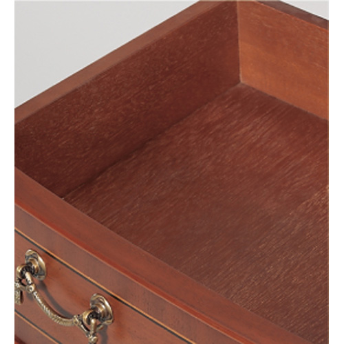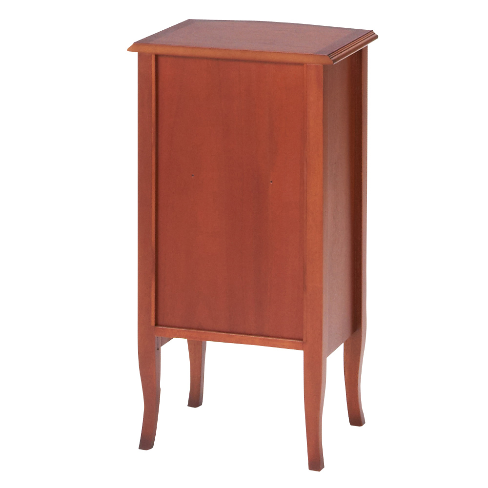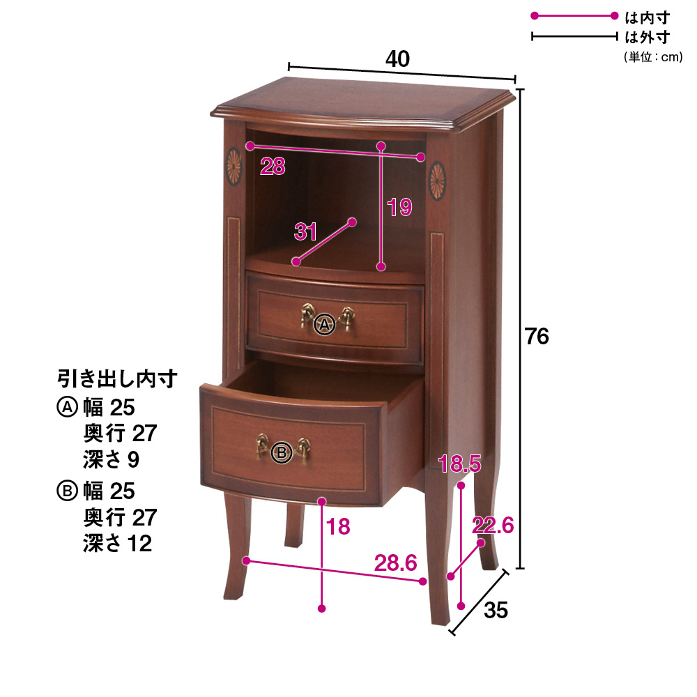 前面を描く繊細な曲線と、緻密な象がん装飾美に彩られたベネチアン調家具。コンパクトながら存在感と高級感漂う電話台・FAX台です。1点置くだけで玄関やリビングの顔になり、おしゃれなコンソールとしてもお使いいただけます。緻密な象がん装飾美に彩られたベネチアン調象がんシリーズ。優美な曲線を描くフロントラインと装飾的な引き手が魅力。精巧な象がんが格調高い存在感を演出します。ひとつひとつの象がん細工は、職人の手仕事による小さな芸術。引き出しの内装にも丁寧な塗装を施した贅沢な仕上がりです。スマートでシンプルなフォルムで場所を選びません。【デザインコンセプト】繊細な木肌のマホガニー材を17世紀中期の「ネオクラシックスタイル」を基本とした、コンパクトタイプのアクセント家具の提案です。卓越した職人の「技」による象がん細工の繊細さと、緩やかな曲線のフロントラインを活かしたデザインに、落ち着いたアンティーク仕上げの装いは、伝統的なヨーロッパの格式と優美さを醸し出し、クラシカルな魅力に溢れたインテリアを充実させます。【ポイント】1.インレイ《象がん細工》熟練の職人の手作業により、厚さ0.55mmほどの単板(木をスライスしたもの)を模様に合わせて切り取り、表面を「焼き砂」で焦がして影の表情をつけ、丹念に貼り合せて形にします。その飾りの本体の表面に埋め込んで、優美な模様に仕上げる細工で、ヨーロッパ家具の伝統ある技法を用いています。2.異種木目による模様貼り天板、扉、引出しの表面には、異なる杢の表情を活かした帯状の模様貼りを施し、繊細さとシックな印象を高めました。3.グレージング塗装着色塗料の拭き残しによる技法で、木目や細かい面の窪みに塗料を拭き残すことにより、アンティーク調のイメージをより印象的にしました。木目の表情を活かしたウレタン塗装です。※注意:熱いものを直に置くことは避けて下さい4.スパッタリング塗装アンティーク家具で、使い古した味わいを出すための「汚し」の技法で、細かい塗料の粒を散りばめて、温かみと味わい深さを強調しました。5.柔らかい曲面のフロントライン薄い単板を幾層にも貼り合わせた成形技法を活かし、トラディショナルな中にも量感とエレガンスさを表現しました。6.スマートな表情に仕上げた「猫脚」のライン本来の「猫脚」はボリュームのある曲線美を持たせますが、ベネチアシリーズは緩やかでさり気ないキュートなラインをアクセントにしました。7.繊細なリブライン扉のまわりに細いリブラインをまわし、繊細なイメージを強調しました。8.オール塗装仕上げコンパクトなシリーズですが、各アイテムの裏面と引出しの中まで塗装を施し、清潔感と高級感を高めました。9.タッセル模様の引手扉と引出しの引手には、ヨーロッパ調のタッセル模様(カーテンの飾りふさ)のデザインのものを採用し、クラシカルな装いを強調しました。【世界3大銘木とうたわれる高級材「マホガニー天然木」を使用した上質家具】卓越した職人の「技」による象がん細工の繊細さと、緩やかな曲線のフロントラインを活かしたデザイン。落ち着いたアンティーク仕上げの装いは、伝統的なヨーロッパの格式と優美さを醸し出し、クラシカルな魅力に溢れたインテリアを充実させます。【現代の住宅に合わせたコンパクトな設計だからお部屋のアクセントに】マンションなどの住まいを考慮し、限られた空間に無理なく設置できるコンパクトな設計です。リビング・ダイニング・玄関・寝室など場所を選ばずお気に入りのスペースを作れます。同じシリーズの家具を揃えて、おしゃれなクラシック風のコーディネートが楽しめます。