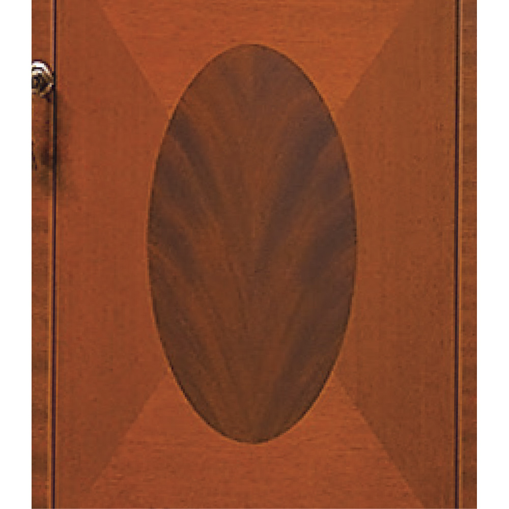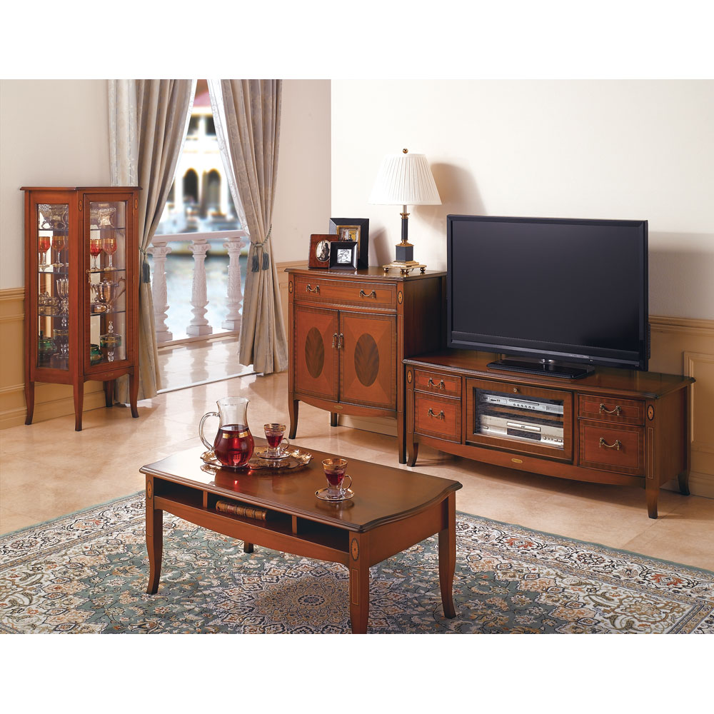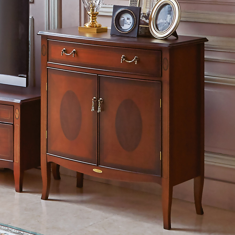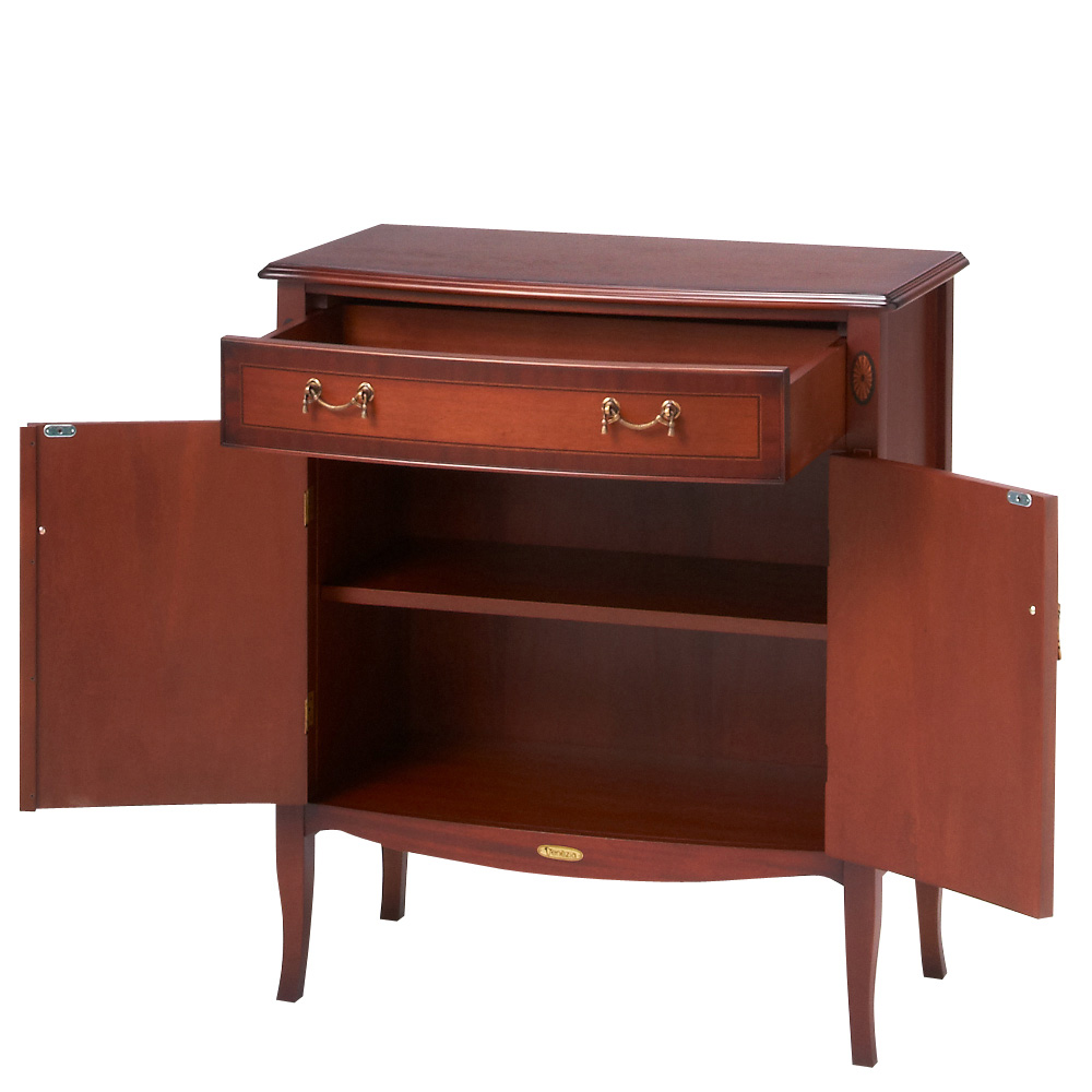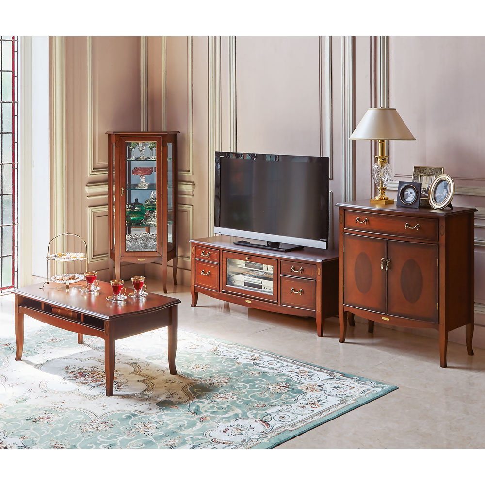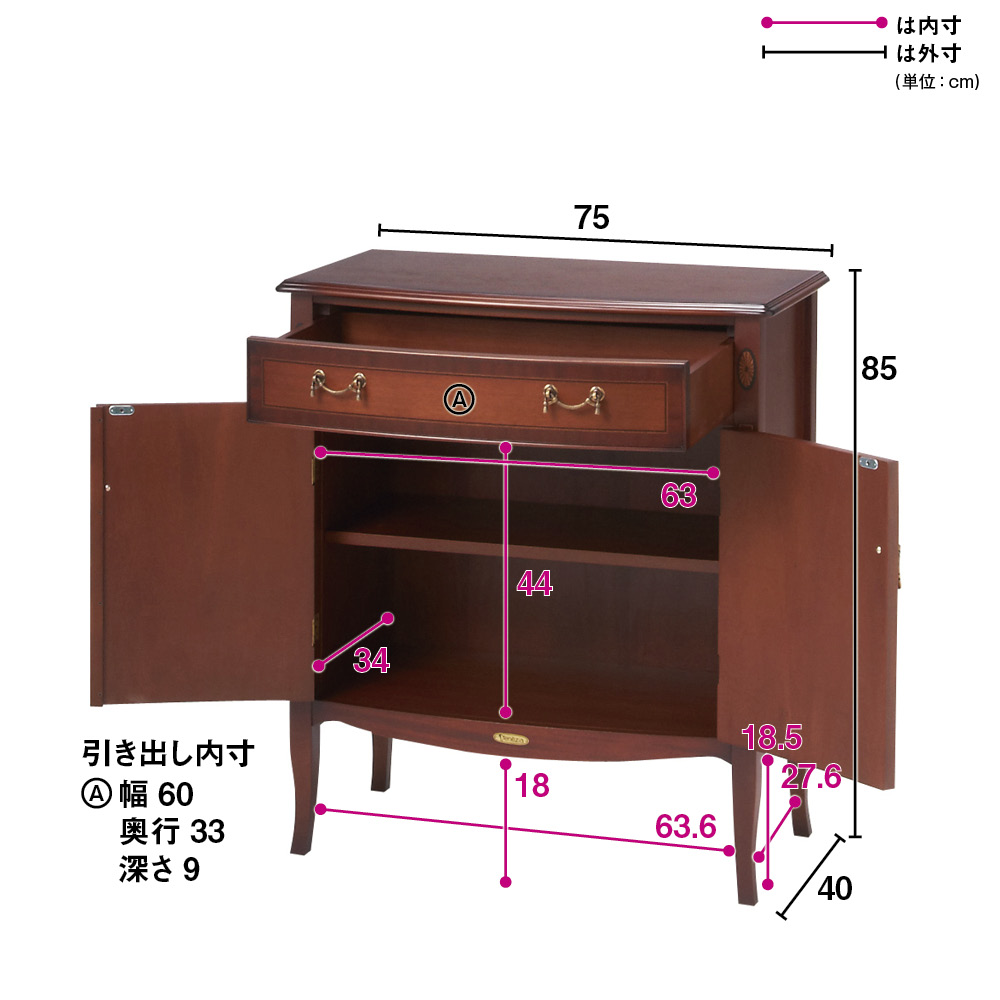 前面を描く繊細な象がん装飾美に彩られたベネチアン調象がんシリーズのコンソールキャビネット。高級感漂うコンソールキャビネットは、置くだけリビングルームの主役になるクラシック家具です。緻密な象がん装飾美に彩られたベネチアン調象がんシリーズ。優美な曲線を描くフロントラインと装飾的な引き手が魅力。精巧な象がんが格調高い存在感を演出します。ひとつひとつの象がん細工は、職人の手仕事による小さな芸術。内装にも丁寧な塗装を施した贅沢な仕上がりです。スマートでシンプルなフォルムで場所を選びません。おしゃれな電話台としてもお使いいただけます。【デザインコンセプト】繊細な木肌のマホガニー材を17世紀中期の「ネオクラシックスタイル」を基本とした、コンパクトタイプのアクセント家具の提案です。卓越した職人の「技」による象がん細工の繊細さと、緩やかな曲線のフロントラインを活かしたデザインに、落ち着いたアンティーク仕上げの装いは、伝統的なヨーロッパの格式と優美さを醸し出し、クラシカルな魅力に溢れたインテリアを充実させます。【ポイント】1.インレイ《象がん細工》熟練の職人の手作業により、厚さ0.55mmほどの単板(木をスライスしたもの)を模様に合わせて切り取り、表面を「焼き砂」で焦がして影の表情をつけ、丹念に貼り合せて形にします。その飾りの本体の表面に埋め込んで、優美な模様に仕上げる細工で、ヨーロッパ家具の伝統ある技法を用いています。2.異種木目による模様貼り天板、扉、引出しの表面には、異なる杢の表情を活かした帯状の模様貼りを施し、繊細さとシックな印象を高めました。3.グレージング塗装着色塗料の拭き残しによる技法で、木目や細かい面の窪みに塗料を拭き残すことにより、アンティーク調のイメージをより印象的にしました。木目の表情を活かしたウレタン塗装です。※注意:熱いものを直に置くことは避けて下さい4.スパッタリング塗装アンティーク家具で、使い古した味わいを出すための「汚し」の技法で、細かい塗料の粒を散りばめて、温かみと味わい深さを強調しました。5.柔らかい曲面のフロントライン薄い単板を幾層にも貼り合わせた成形技法を活かし、トラディショナルな中にも量感とエレガンスさを表現しました。6.スマートな表情に仕上げた「猫脚」のライン本来の「猫脚」はボリュームのある曲線美を持たせますが、ベネチアシリーズは緩やかでさり気ないキュートなラインをアクセントにしました。7.繊細なリブライン扉のまわりに細いリブラインをまわし、繊細なイメージを強調しました。8.オール塗装仕上げコンパクトなシリーズですが、各アイテムの裏面と引出しの中まで塗装を施し、清潔感と高級感を高めました。9.タッセル模様の引手扉と引出しの引手には、ヨーロッパ調のタッセル模様(カーテンの飾りふさ)のデザインのものを採用し、クラシカルな装いを強調しました。【世界3大銘木とうたわれる高級材「マホガニー天然木」を使用した上質家具】卓越した職人の「技」による象がん細工の繊細さと、緩やかな曲線のフロントラインを活かしたデザイン。落ち着いたアンティーク仕上げの装いは、伝統的なヨーロッパの格式と優美さを醸し出し、クラシカルな魅力に溢れたインテリアを充実させます。【現代の住宅に合わせたコンパクトな設計だからお部屋のアクセントに】マンションなどの住まいを考慮し、限られた空間に無理なく設置できるコンパクトな設計です。リビング・ダイニング・玄関・寝室など場所を選ばずお気に入りのスペースを作れます。同じシリーズの家具を揃えて、おしゃれなクラシック風のコーディネートが楽しめます。〜アンティーク家具の特集はこちら〜アンティーク家具の世界