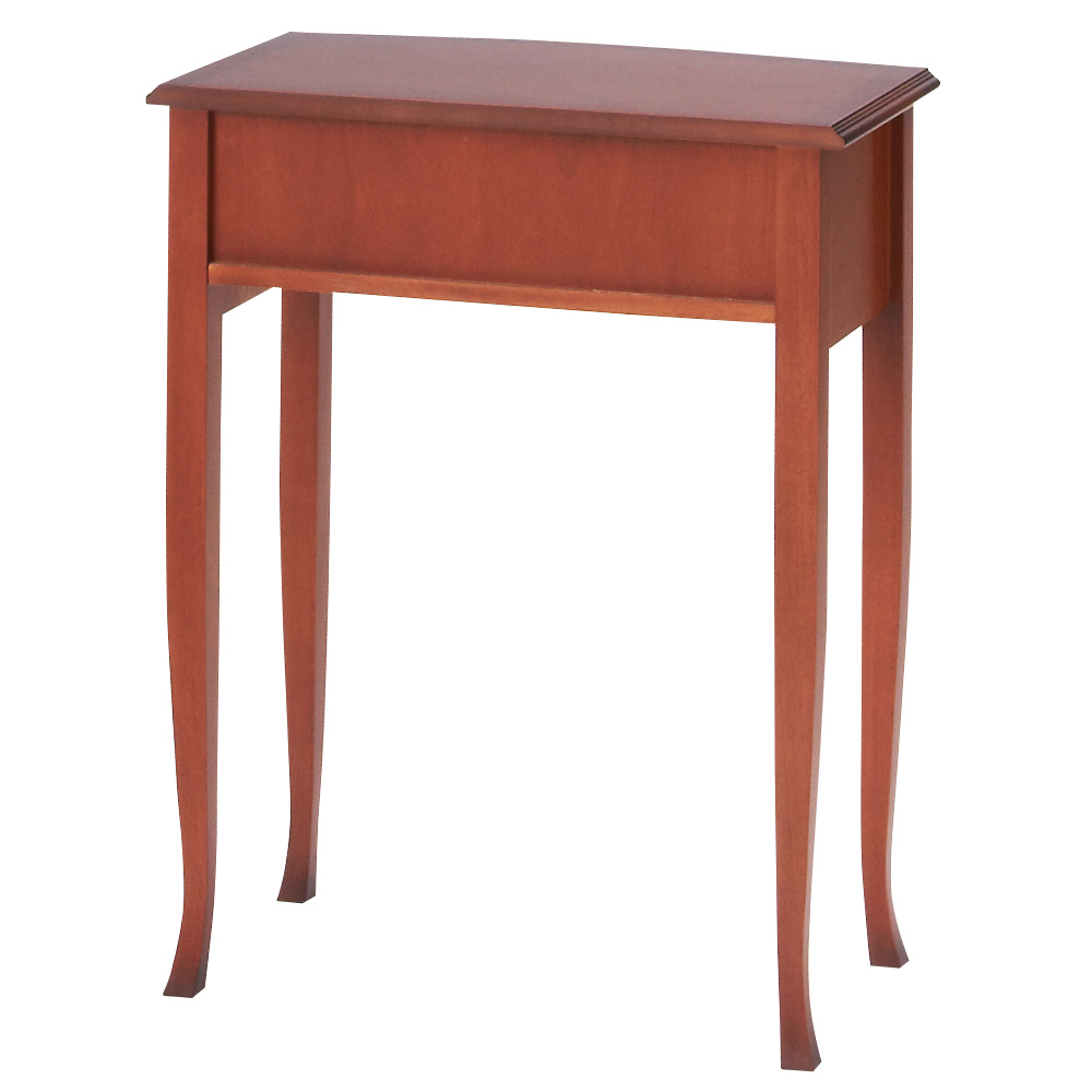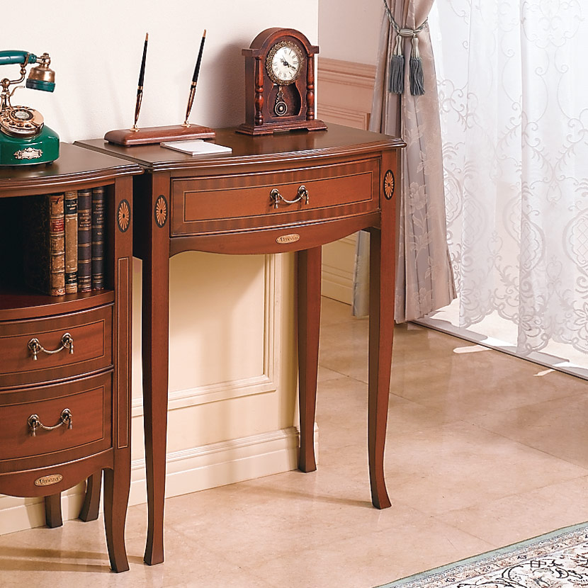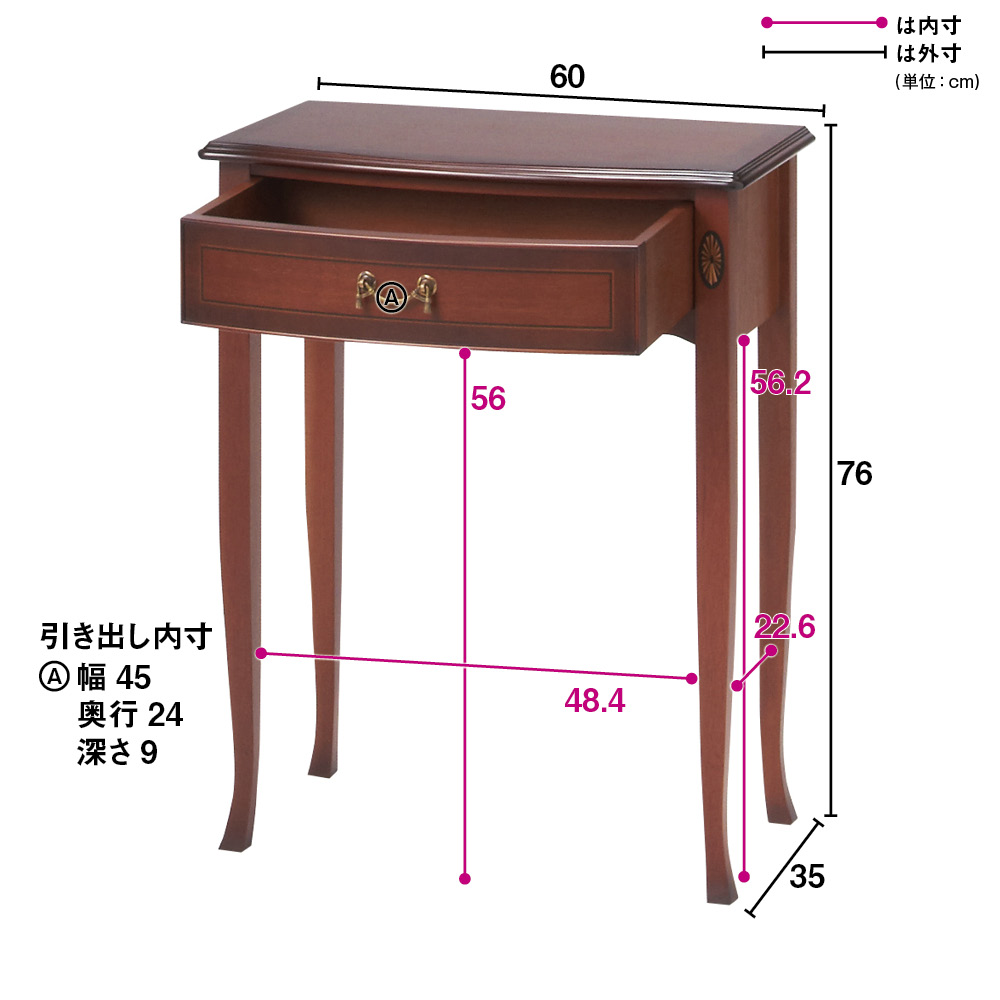 前面を描く繊細な象がん装飾美に彩られたベネチアン調象がんシリーズ。細部に魅せる秀麗なこだわりが自慢のクラッシック家具。1点置くだけで玄関やリビングの顔になるコンソールテーブルは、おしゃれな電話台・FAX台やフラワースタンドとしてもお使いいただけます。緻密な象がん装飾美に彩られたベネチアン調象がんシリーズ。優美な曲線を描くフロントラインと装飾的な引き手が魅力。精巧な象がんが格調高い存在感を演出します。ひとつひとつの象がん細工は、職人の手仕事による小さな芸術。内装にも丁寧な塗装を施した贅沢な仕上がりです。引き出しの内装まで塗装を施した上質のコンソールテーブル。スマートでシンプルなフォルムで場所を選びません。【デザインコンセプト】繊細な木肌のマホガニー材を17世紀中期の「ネオクラシックスタイル」を基本とした、コンパクトタイプのアクセント家具の提案です。卓越した職人の「技」による象がん細工の繊細さと、緩やかな曲線のフロントラインを活かしたデザインに、落ち着いたアンティーク仕上げの装いは、伝統的なヨーロッパの格式と優美さを醸し出し、クラシカルな魅力に溢れたインテリアを充実させます。【ポイント】1.インレイ《象がん細工》熟練の職人の手作業により、厚さ0.55mmほどの単板(木をスライスしたもの)を模様に合わせて切り取り、表面を「焼き砂」で焦がして影の表情をつけ、丹念に貼り合せて形にします。その飾りの本体の表面に埋め込んで、優美な模様に仕上げる細工で、ヨーロッパ家具の伝統ある技法を用いています。2.異種木目による模様貼り天板、扉、引出しの表面には、異なる杢の表情を活かした帯状の模様貼りを施し、繊細さとシックな印象を高めました。3.グレージング塗装着色塗料の拭き残しによる技法で、木目や細かい面の窪みに塗料を拭き残すことにより、アンティーク調のイメージをより印象的にしました。木目の表情を活かしたウレタン塗装です。※注意:熱いものを直に置くことは避けて下さい4.スパッタリング塗装アンティーク家具で、使い古した味わいを出すための「汚し」の技法で、細かい塗料の粒を散りばめて、温かみと味わい深さを強調しました。5.柔らかい曲面のフロントライン薄い単板を幾層にも貼り合わせた成形技法を活かし、トラディショナルな中にも量感とエレガンスさを表現しました。6.スマートな表情に仕上げた「猫脚」のライン本来の「猫脚」はボリュームのある曲線美を持たせますが、ベネチアシリーズは緩やかでさり気ないキュートなラインをアクセントにしました。7.繊細なリブライン扉のまわりに細いリブラインをまわし、繊細なイメージを強調しました。8.オール塗装仕上げコンパクトなシリーズですが、各アイテムの裏面と引出しの中まで塗装を施し、清潔感と高級感を高めました。9.タッセル模様の引手扉と引出しの引手には、ヨーロッパ調のタッセル模様(カーテンの飾りふさ)のデザインのものを採用し、クラシカルな装いを強調しました。【世界3大銘木とうたわれる高級材「マホガニー天然木」を使用した上質家具】卓越した職人の「技」による象がん細工の繊細さと、緩やかな曲線のフロントラインを活かしたデザイン。落ち着いたアンティーク仕上げの装いは、伝統的なヨーロッパの格式と優美さを醸し出し、クラシカルな魅力に溢れたインテリアを充実させます。【現代の住宅に合わせたコンパクトな設計だからお部屋のアクセントに】マンションなどの住まいを考慮し、限られた空間に無理なく設置できるコンパクトな設計です。リビング・ダイニング・玄関・寝室など場所を選ばずお気に入りのスペースを作れます。同じシリーズの家具を揃えて、おしゃれなクラシック風のコーディネートが楽しめます。〜アンティーク家具の特集はこちら〜アンティーク家具の世界