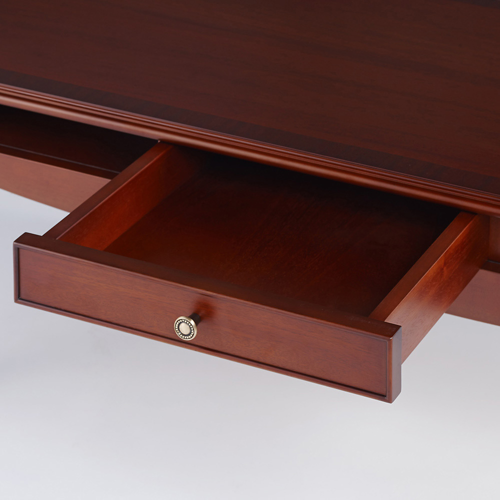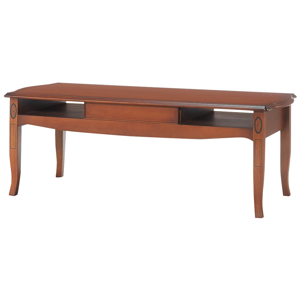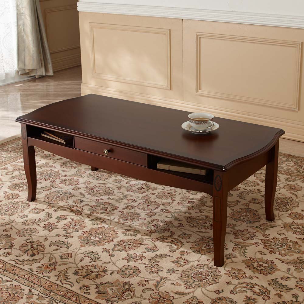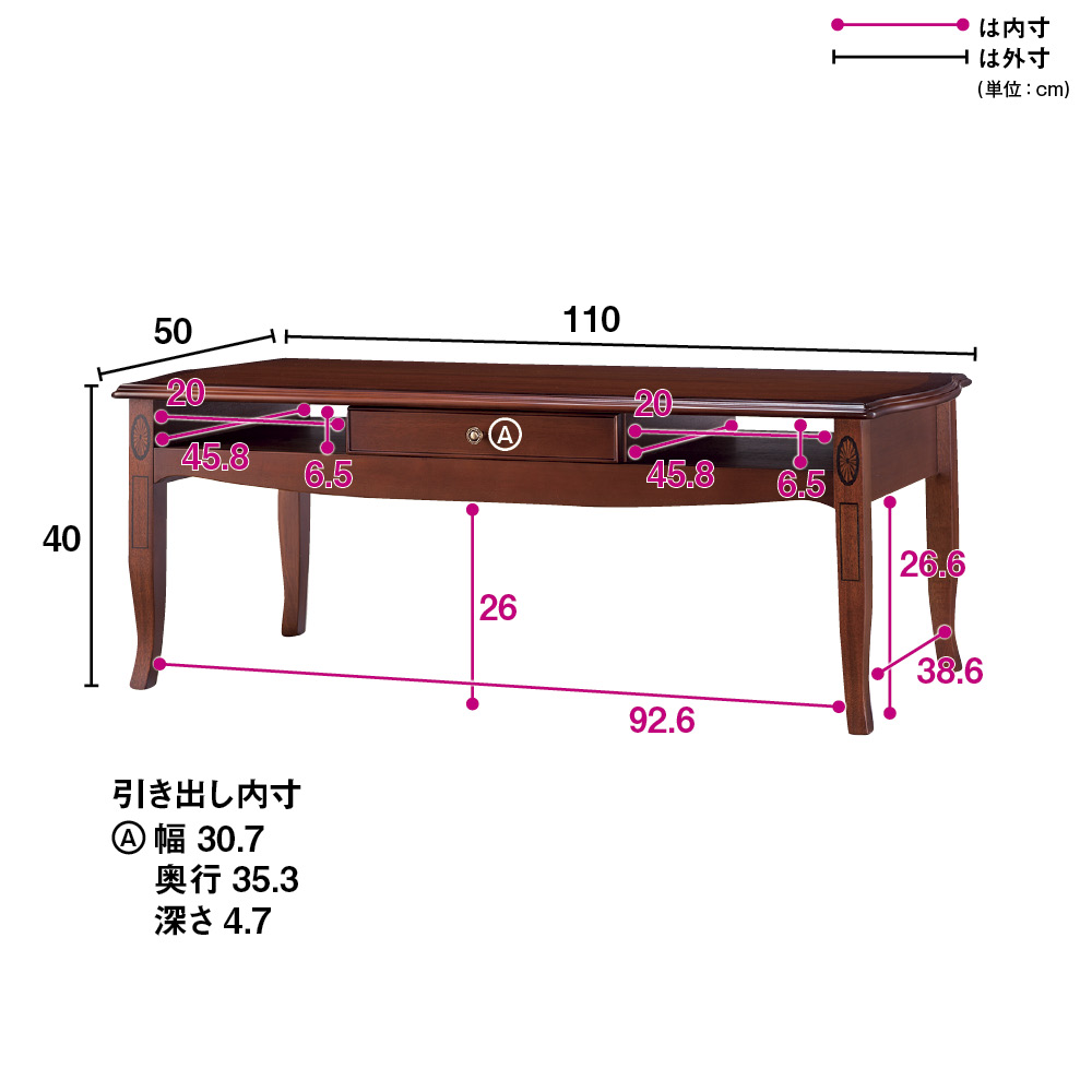 前面を描く繊細な曲線と、緻密な象がん装飾美に彩られたベネチアン調象がんシリーズ。細部に魅せる秀麗なこだわりが自慢の、存在感と高級感漂うセンターテーブルです。緻密な象がん装飾美に彩られたベネチアン調象がんシリーズ。優美な曲線を描くフロントラインと装飾的な引き手が魅力。精巧な象がんが格調高い存在感を演出します。ひとつひとつの象がん細工は、職人の手仕事による小さな芸術。引き出しの内装にも丁寧な塗装を施した贅沢な仕上がりです。天板下に小物の収納に便利な引き出し付き。リビングのコーヒーテーブルとしてもオススメです。【デザインコンセプト】繊細な木肌のマホガニー材を17世紀中期の「ネオクラシックスタイル」を基本とした、コンパクトタイプのアクセント家具の提案です。卓越した職人の「技」による象がん細工の繊細さと、緩やかな曲線のフロントラインを活かしたデザインに、落ち着いたアンティーク仕上げの装いは、伝統的なヨーロッパの格式と優美さを醸し出し、クラシカルな魅力に溢れたインテリアを充実させます。【ポイント】1.インレイ《象がん細工》熟練の職人の手作業により、厚さ0.55mmほどの単板(木をスライスしたもの)を模様に合わせて切り取り、表面を「焼き砂」で焦がして影の表情をつけ、丹念に貼り合せて形にします。その飾りの本体の表面に埋め込んで、優美な模様に仕上げる細工で、ヨーロッパ家具の伝統ある技法を用いています。2.異種木目による模様貼り天板、扉、引出しの表面には、異なる杢の表情を活かした帯状の模様貼りを施し、繊細さとシックな印象を高めました。3.グレージング塗装着色塗料の拭き残しによる技法で、木目や細かい面の窪みに塗料を拭き残すことにより、アンティーク調のイメージをより印象的にしました。木目の表情を活かしたウレタン塗装です。※注意:熱いものを直に置くことは避けて下さい4.スパッタリング塗装アンティーク家具で、使い古した味わいを出すための「汚し」の技法で、細かい塗料の粒を散りばめて、温かみと味わい深さを強調しました。5.柔らかい曲面のフロントライン薄い単板を幾層にも貼り合わせた成形技法を活かし、トラディショナルな中にも量感とエレガンスさを表現しました。6.スマートな表情に仕上げた「猫脚」のライン本来の「猫脚」はボリュームのある曲線美を持たせますが、ベネチアシリーズは緩やかでさり気ないキュートなラインをアクセントにしました。7.繊細なリブライン扉のまわりに細いリブラインをまわし、繊細なイメージを強調しました。8.オール塗装仕上げコンパクトなシリーズですが、各アイテムの裏面と引出しの中まで塗装を施し、清潔感と高級感を高めました。9.タッセル模様の引手扉と引出しの引手には、ヨーロッパ調のタッセル模様(カーテンの飾りふさ)のデザインのものを採用し、クラシカルな装いを強調しました。【世界3大銘木とうたわれる高級材「マホガニー天然木」を使用した上質家具】卓越した職人の「技」による象がん細工の繊細さと、緩やかな曲線のフロントラインを活かしたデザイン。落ち着いたアンティーク仕上げの装いは、伝統的なヨーロッパの格式と優美さを醸し出し、クラシカルな魅力に溢れたインテリアを充実させます。【現代の住宅に合わせたコンパクトな設計だからお部屋のアクセントに】マンションなどの住まいを考慮し、限られた空間に無理なく設置できるコンパクトな設計です。同じシリーズの家具を揃えて、おしゃれなクラシック風のコーディネートが楽しめます。〜アンティーク家具の特集はこちら〜アンティーク家具の世界