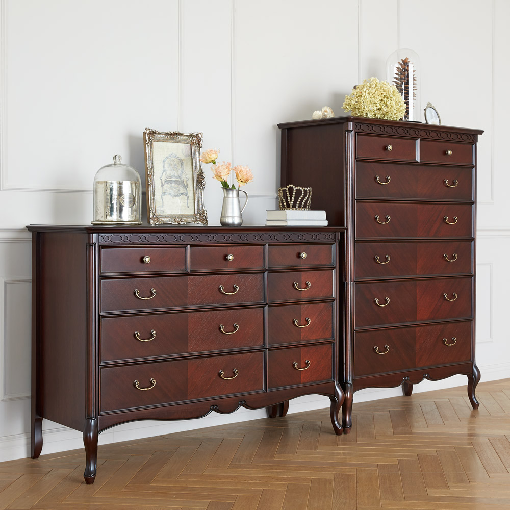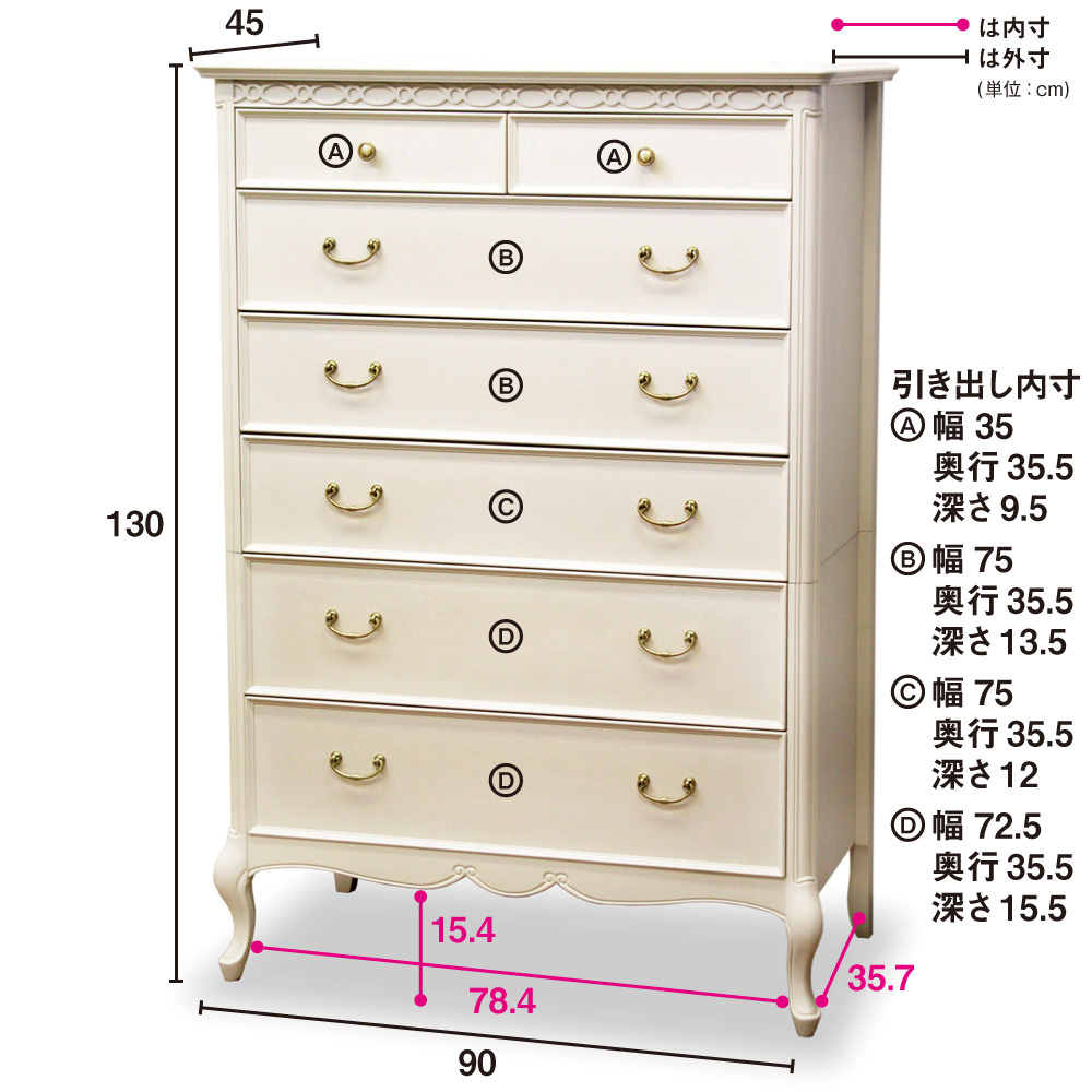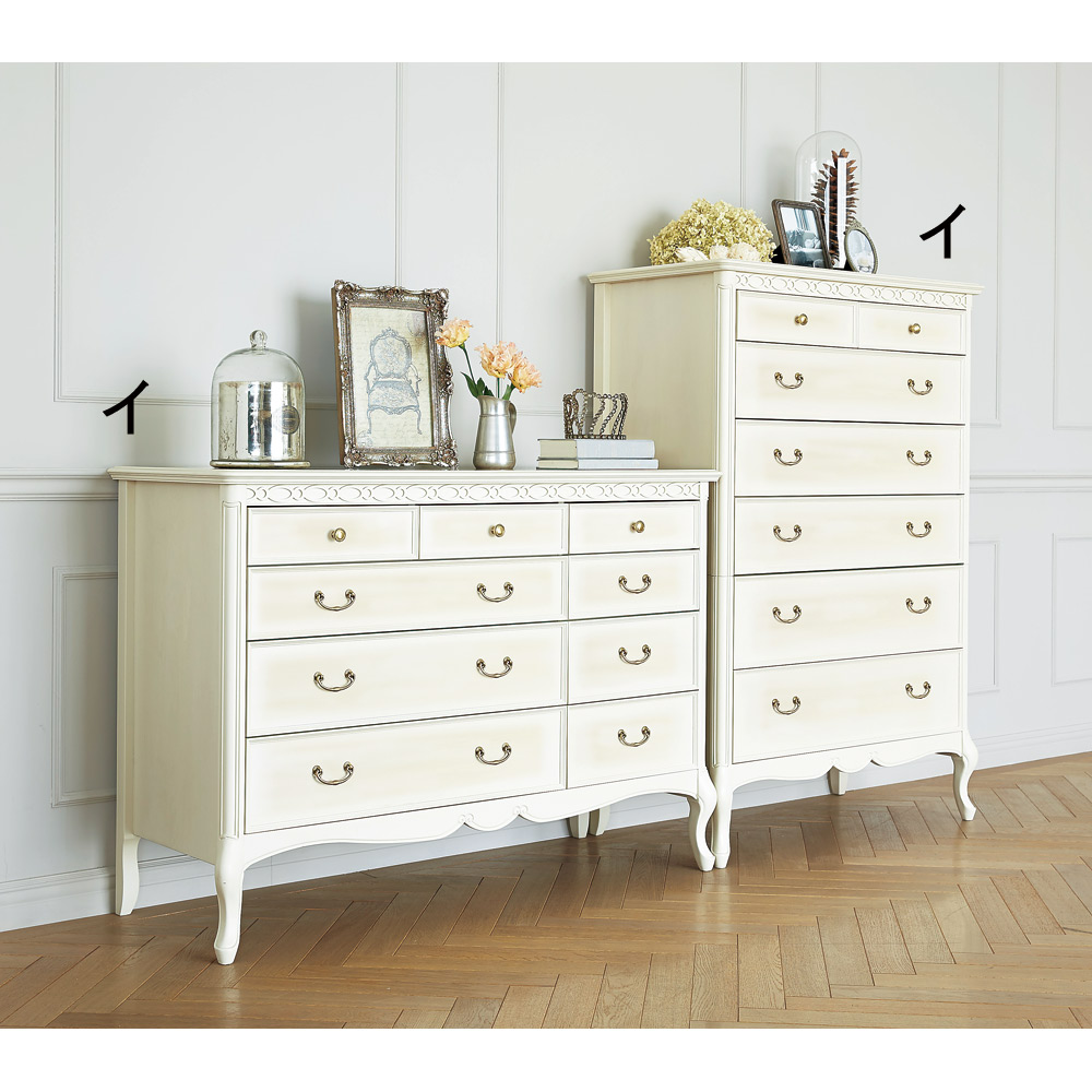 優雅さ薫る人気のクラシックデザインの引き出しチェスト。映画にでてくるようなヨーロピアン調のインテリア空間が叶う収納家具です。職人技が光る矢羽模様のダークブラウンとフレンチ風のお部屋コーディネートができるホワイトの2色をご用意。ヨーロッパの伝統的なデザインに魅せられる収納チェスト■アンティークな雰囲気を演出するおしゃれな収納家具です。■高級家具の代名詞的な素材:マホガニーの特徴を生かした格調の高い仕上がりになっています。■天板と前面はクラシック伝統の矢羽模様デザイン。現代でも色あせる事なく輝きます。■ご自宅でのくつろぎの時間を彩るトラディショナルなインテリア家具です。■リビングの収納家具やクローゼットでの衣類収納としてお使い頂けます。■取っ手の装飾ひとつにもこだわりました。アンティークなひと時をお楽しみください。ヨーロピアンアンティーク調家具の特徴■伝統的で落ち着いた深い色合いと重厚感が特徴的なスタイルです。■素材にはマホガニーなど銘木といわれるものを使用するのも特徴です。■特に流行に左右される事なく、使えば使うほどに味わい深くなるのでアンティーク家具としても有名です。■古いものになると何十万という価値がつくアンティーク家具も存在します。デザインだけでなく使い心地もよいクラシック家具を目指しました■引き出しは箱組仕様のしっかりとした強度のあるつくりです。■衣類を収納するのに適した大きな引き出しと小物収納に便利な小引き出しをもうけた設計。■引き出しにはストッパーがついていますので、安心してお使い頂けます。本物志向のあなたに送る匠の逸品をお楽しみください■熟練の職人たちがひとつずつ、丁寧に仕上げました。■ヨーロッパ家具やアンティーク家具とのコーディネートのでお部屋の雰囲気もヨーロピアンに。■ディノスが自信を持ってお勧めするクラシック家具・輸入インテリアをお楽しみください。