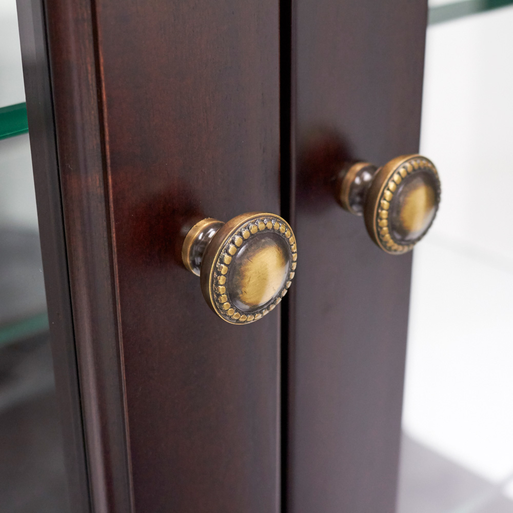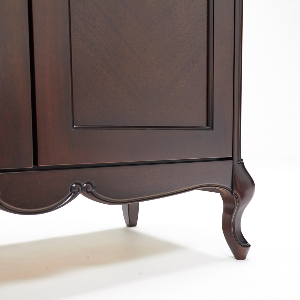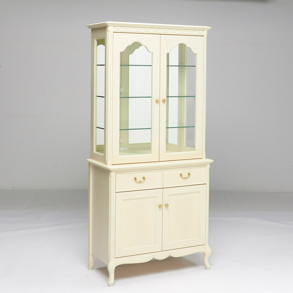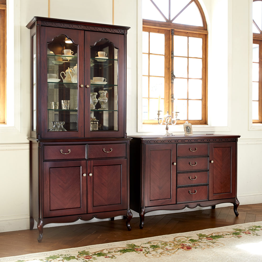 優雅さ薫る人気のクラシック家具シリーズの食器棚キャビネットが登場。映画にでてくるようなヨーロピアン調のインテリア空間が叶うダイニングボード。矢羽模様のダークブラウンとフレンチ風のお部屋コーディネートができるホワイトの2色をご用意しました。ヨーロッパの伝統的なデザインに魅せられるコレクションキャビネット■アンティークな雰囲気を演出するおしゃれな飾り棚です。■高級家具の代名詞的な素材:マホガニーの特徴を生かした格調の高い仕上がりになっています。■天板と前面はクラシック伝統の矢羽模様デザイン。現代でも色あせる事なく輝きます。◆ご自宅でのくつろぎの時間を彩るトラディショナルなインテリア家具です。■リビングの収納家具や食器棚として、大事なコレクションを飾る飾り棚としてもお使い頂けます。◆取っ手の装飾ひとつにもこだわりました。アンティークなひと時をお楽しみください。ヨーロピアンアンティーク調家具の特徴■伝統的で落ち着いた深い色合いと重厚感が特徴的なスタイルです。■素材にはマホガニーなど銘木といわれるものを使用するのも特徴です。■特に流行に左右される事なく、使えば使うほどに味わい深くなるのでアンティーク家具としても有名です。■古いものになると何十万という価値がつくアンティーク家具も存在します。デザインだけでなく使い心地もよいクラシック家具を目指しました■ガラス扉部は背面ミラー&ガラス棚仕様でコレクションを美しく飾れる仕様です。■また長寿命のLED照明で美しく装飾品を照らすことができます。■下扉内部の収納棚板は高さを調整できます。■引き出しにはストッパーがついていますので、安心してお使い頂けます。本物志向のあなたに送る匠の逸品をお楽しみください■熟練の職人たちがひとつずつ、丁寧に仕上げました。■ヨーロッパ家具やアンティーク家具とのコーディネートのでお部屋の雰囲気もヨーロピアンに。■ディノスが自信を持ってお勧めするクラシック家具・輸入インテリアをお楽しみください。