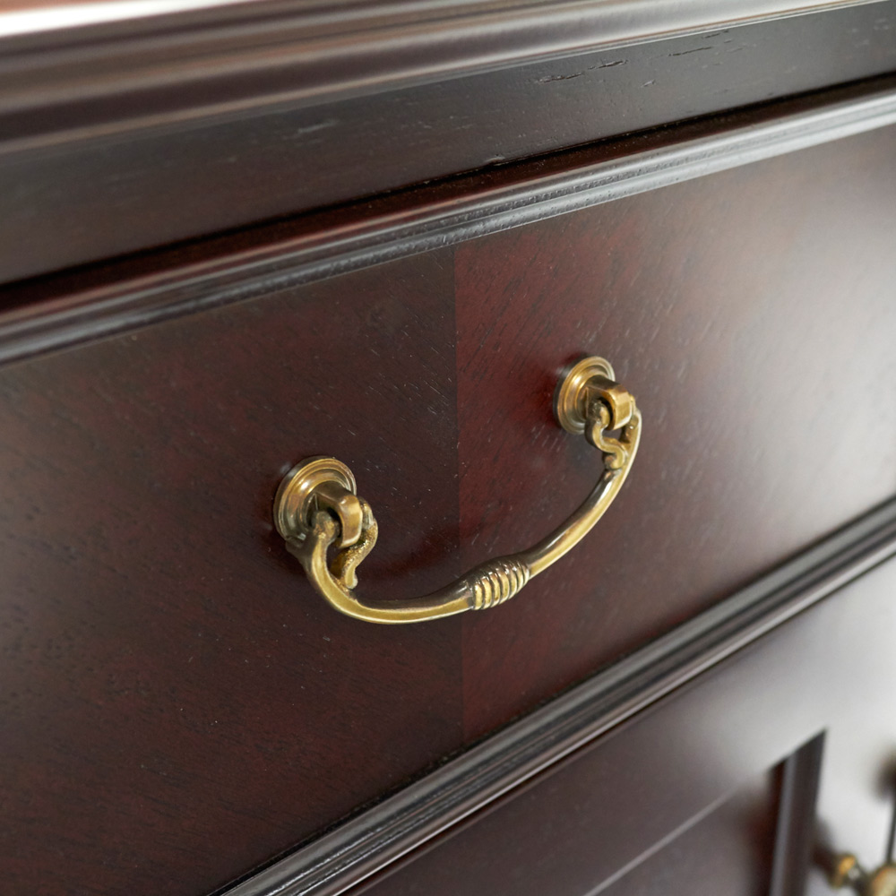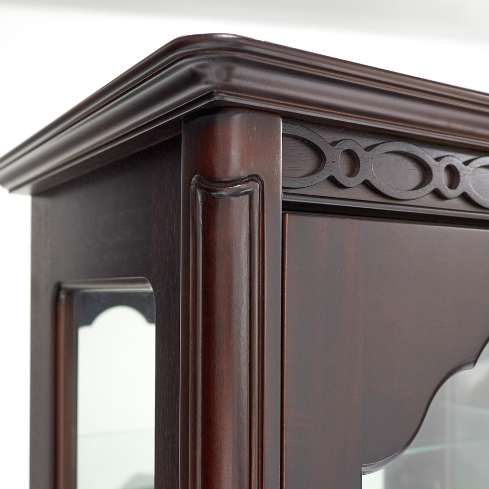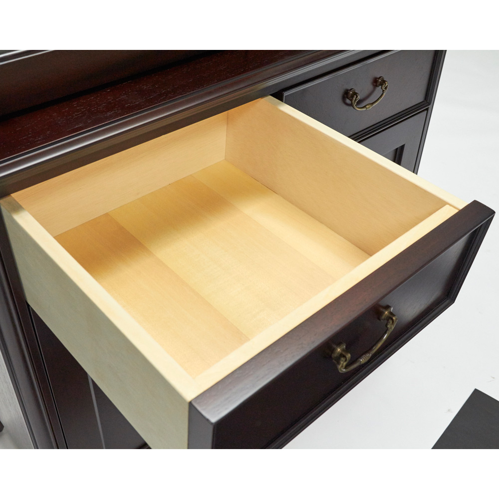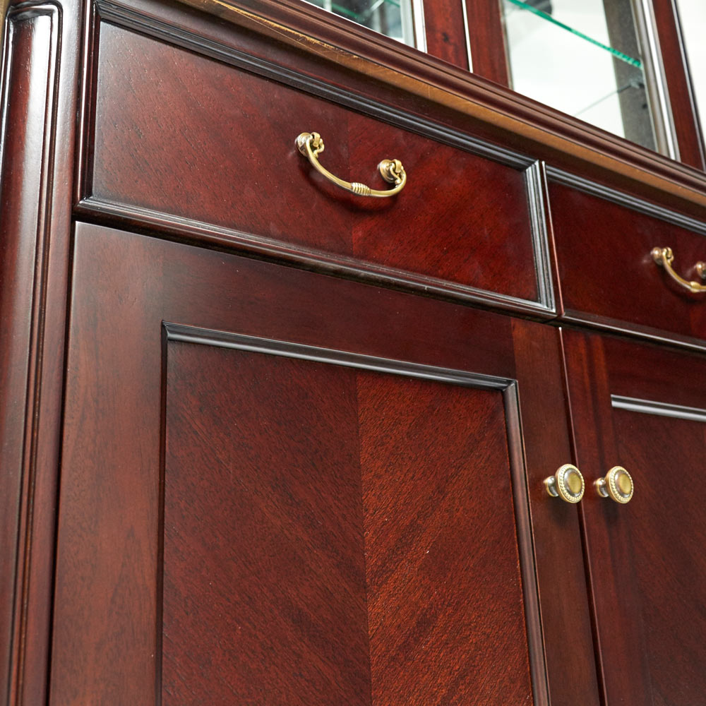 優雅さ薫る人気のクラシック家具シリーズの食器棚キャビネットが登場。映画にでてくるようなヨーロピアン調のインテリア空間が叶うダイニングボード。矢羽模様のダークブラウンとフレンチ風のお部屋コーディネートができるホワイトの2色をご用意しました。ヨーロッパの伝統的なデザインに魅せられるコレクションキャビネット■アンティークな雰囲気を演出するおしゃれな飾り棚です。■高級家具の代名詞的な素材:マホガニーの特徴を生かした格調の高い仕上がりになっています。■天板と前面はクラシック伝統の矢羽模様デザイン。現代でも色あせる事なく輝きます。◆ご自宅でのくつろぎの時間を彩るトラディショナルなインテリア家具です。■リビングの収納家具や食器棚として、大事なコレクションを飾る飾り棚としてもお使い頂けます。◆取っ手の装飾ひとつにもこだわりました。アンティークなひと時をお楽しみください。ヨーロピアンアンティーク調家具の特徴■伝統的で落ち着いた深い色合いと重厚感が特徴的なスタイルです。■素材にはマホガニーなど銘木といわれるものを使用するのも特徴です。■特に流行に左右される事なく、使えば使うほどに味わい深くなるのでアンティーク家具としても有名です。■古いものになると何十万という価値がつくアンティーク家具も存在します。デザインだけでなく使い心地もよいクラシック家具を目指しました■ガラス扉部は背面ミラー&ガラス棚仕様でコレクションを美しく飾れる仕様です。■また長寿命のLED照明で美しく装飾品を照らすことができます。■下扉内部の収納棚板は高さを調整できます。■引き出しにはストッパーがついていますので、安心してお使い頂けます。本物志向のあなたに送る匠の逸品をお楽しみください■熟練の職人たちがひとつずつ、丁寧に仕上げました。■ヨーロッパ家具やアンティーク家具とのコーディネートのでお部屋の雰囲気もヨーロピアンに。■ディノスが自信を持ってお勧めするクラシック家具・輸入インテリアをお楽しみください。
