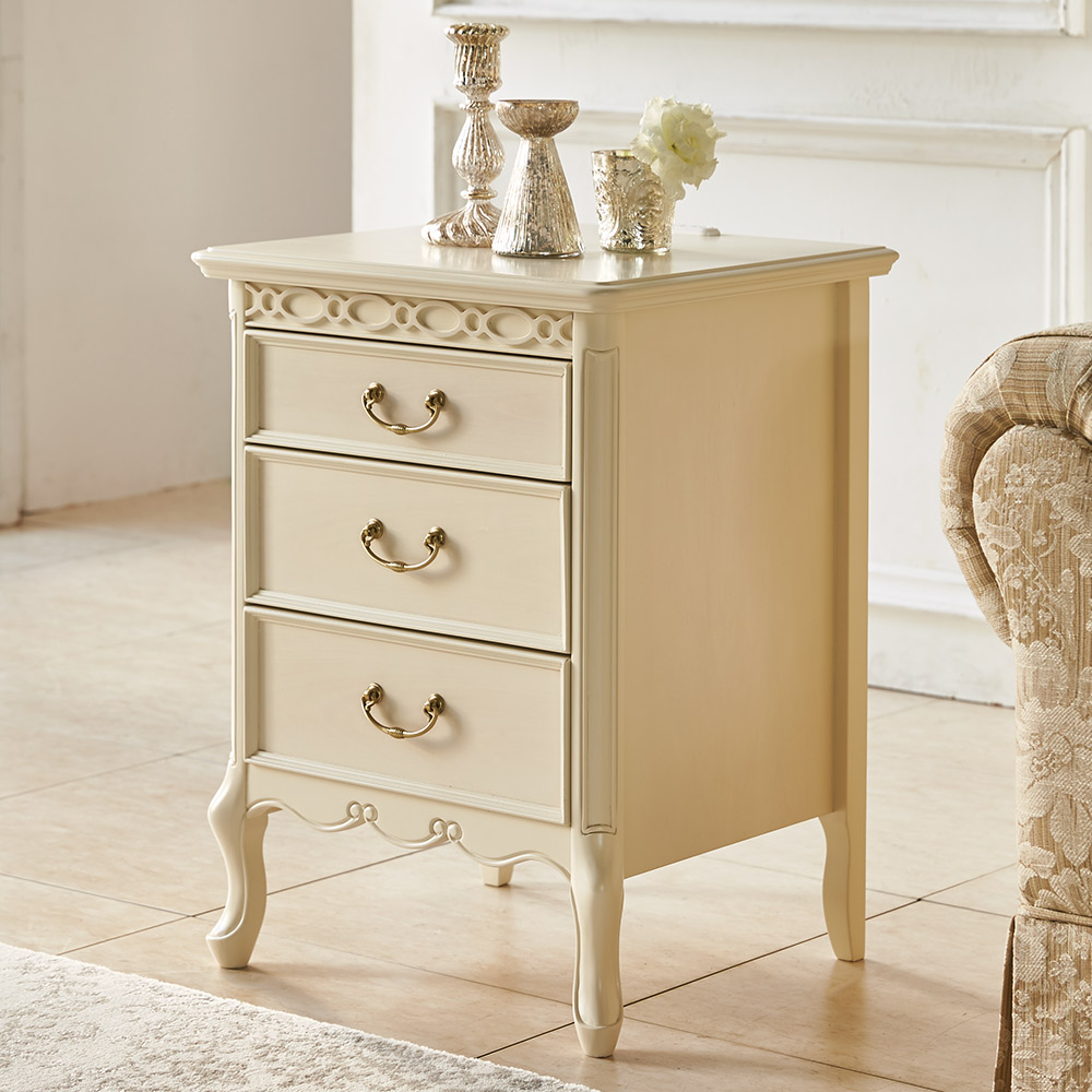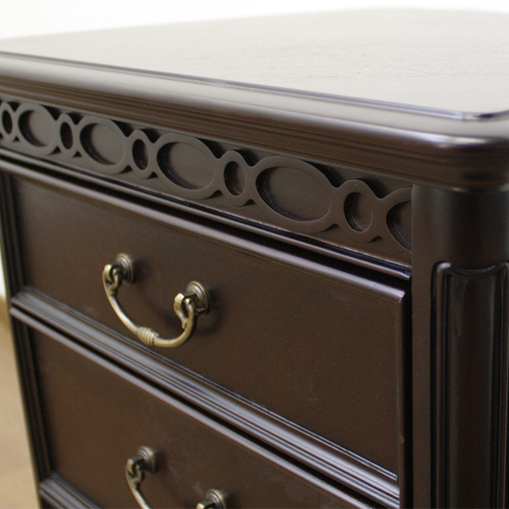 優雅さ薫る人気のクラシックデザインのベッドサイドチェスト(ナイトスタンド)。映画にでてくるようなヨーロピアン調のインテリアが叶うクラシック家具。職人技が光る矢羽模様のダークブラウンとフレンチ風のお部屋コーディネートができるホワイトの2色をご用意。ヨーロッパの伝統的なデザインに魅せられるサイドテーブル■アンティークな雰囲気を演出するおしゃれな収納家具です。■高級家具の代名詞的な素材:マホガニーの特徴を生かした格調の高い仕上がりになっています。■天板と前面はクラシック伝統の矢羽模様デザイン。現代でも色あせる事なく輝きます。■ご自宅でのくつろぎの時間を彩るトラディショナルなインテリア家具です。■ソファサイドやベッドサイドでお使い頂けます。■取っ手の装飾ひとつにもこだわりました。アンティークなひと時をお楽しみください。ヨーロピアンアンティーク調家具の特徴■伝統的で落ち着いた深い色合いと重厚感が特徴的なスタイルです。■素材にはマホガニーなど銘木といわれるものを使用するのも特徴です。■特に流行に左右される事なく、使えば使うほどに味わい深くなるのでアンティーク家具としても有名です。■古いものになると何十万という価値がつくアンティーク家具も存在します。デザインだけでなく使い心地もよいクラシック家具を目指しました■天板には2口コンセントを搭載。家電を置いたり充電に便利な仕様です。■引き出しにはストッパーがついていますので、安心してお使い頂けます。本物志向のあなたに送る匠の逸品をお楽しみください■熟練の職人たちがひとつずつ、丁寧に仕上げました。■ヨーロッパ家具やアンティーク家具とのコーディネートのでお部屋の雰囲気もヨーロピアンに。■ディノスが自信を持ってお勧めするクラシック家具・輸入インテリアをお楽しみください。