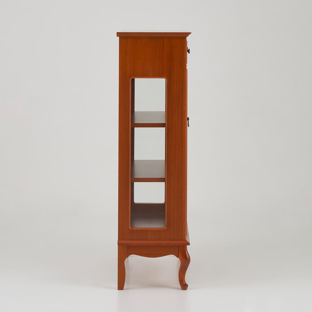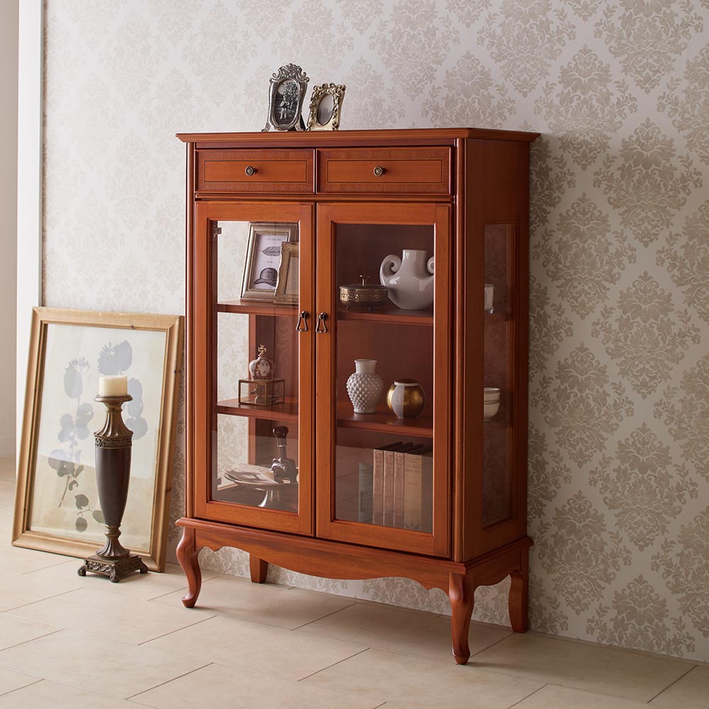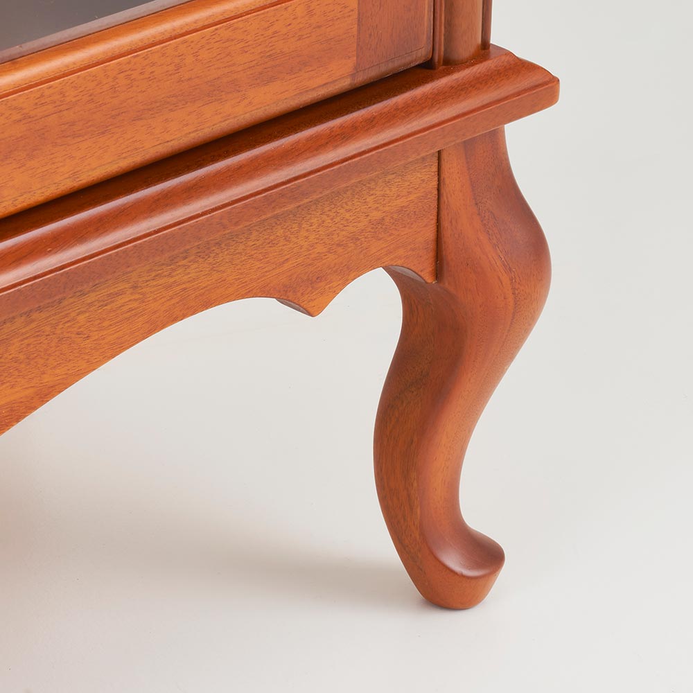 程よい装飾性で甘さも添えたエレガントなデザイン。小ぶりながら美しい存在感はコンパクトスペースのアクセントに。イギリスのクイーンアン様式を基調とした、ミディアムブラウンの明るく上品なフォルムのクラシカルシリーズ。クイーンアン様式の特徴はカブリオールレッグ(カーブした脚部)。膝部分が膨らみ、足先が猫のつま先のような形をしたデザインです。優雅な曲線を活かした猫脚スタイルのリビングキャビネットです。