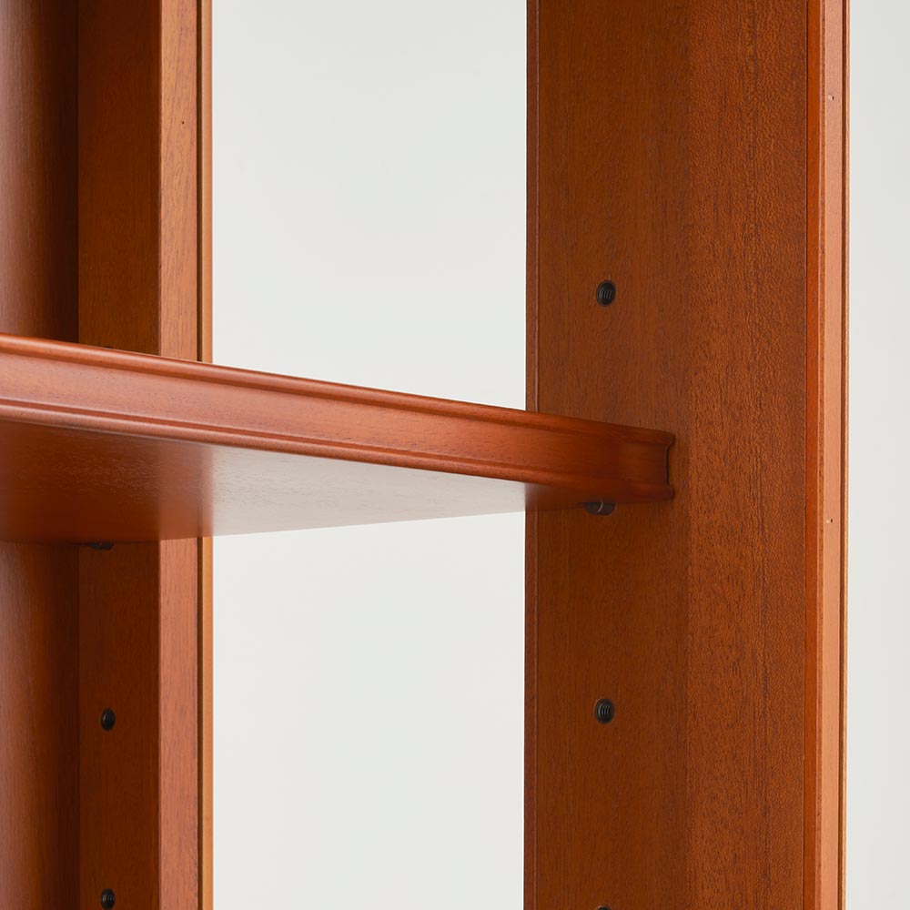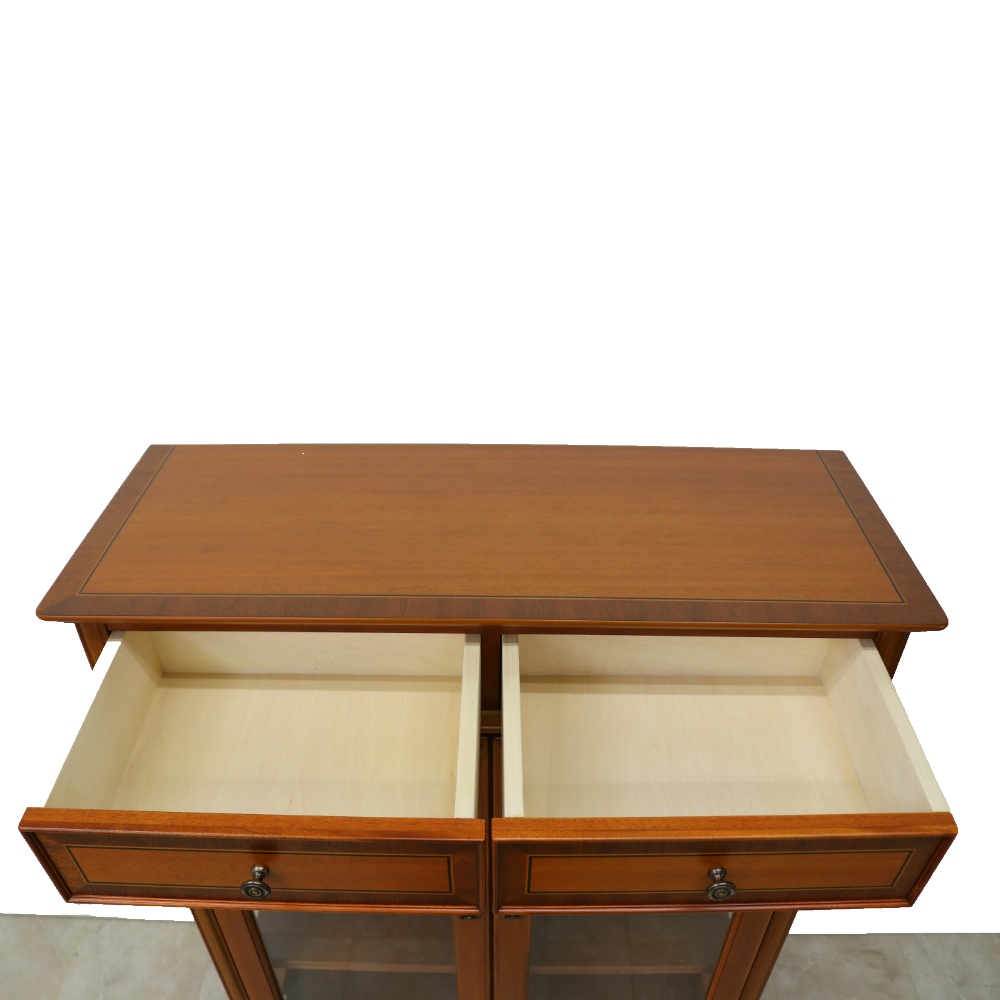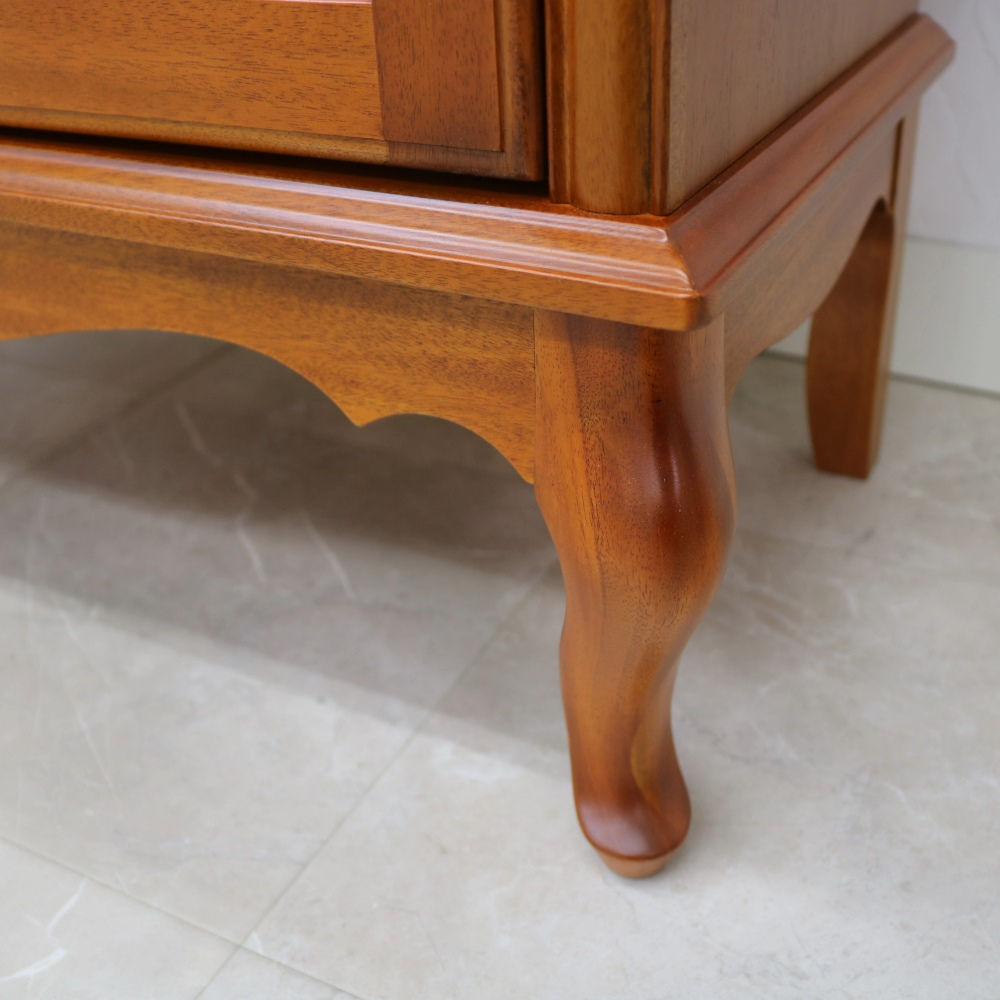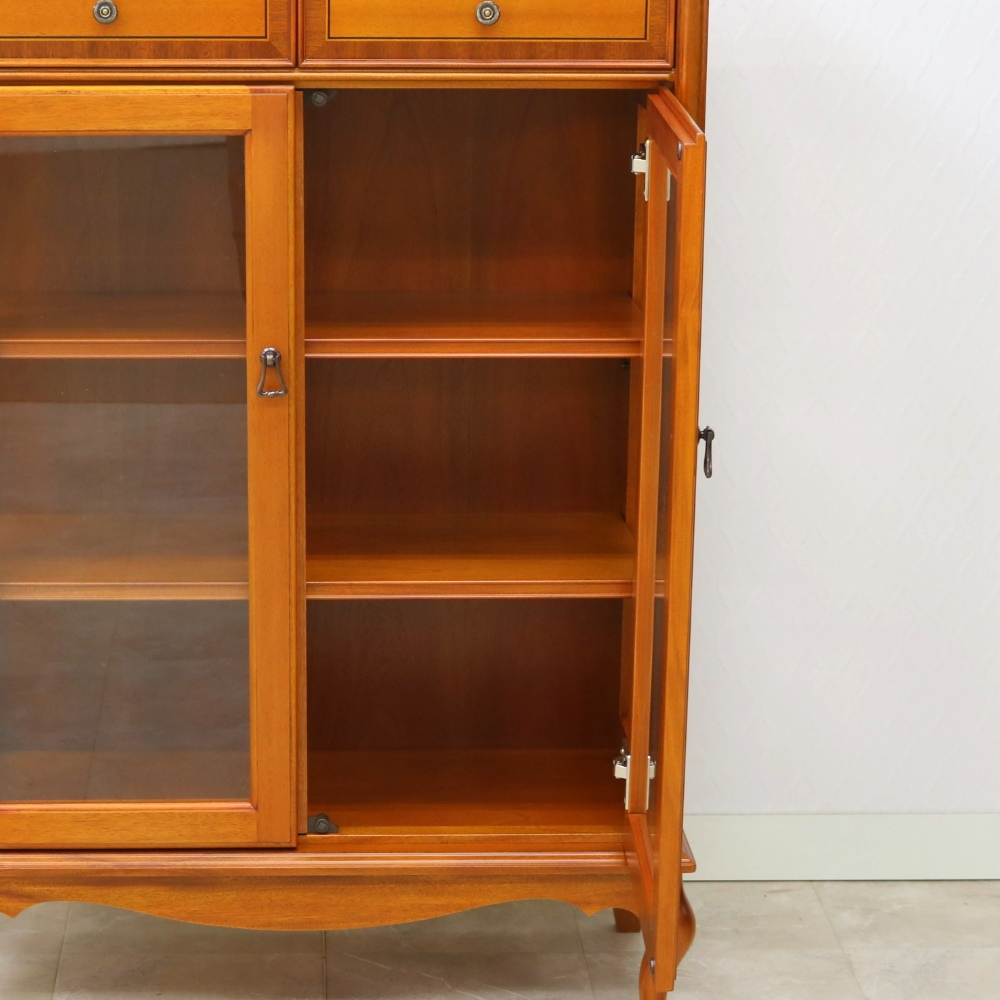 程よい装飾性で甘さも添えたエレガントなデザイン。小ぶりながら美しい存在感はコンパクトスペースのアクセントに。イギリスのクイーンアン様式を基調とした、ミディアムブラウンの明るく上品なフォルムのクラシカルシリーズ。クイーンアン様式の特徴はカブリオールレッグ(カーブした脚部)。膝部分が膨らみ、足先が猫のつま先のような形をしたデザインです。優雅な曲線を活かした猫脚スタイルのリビングキャビネットです。