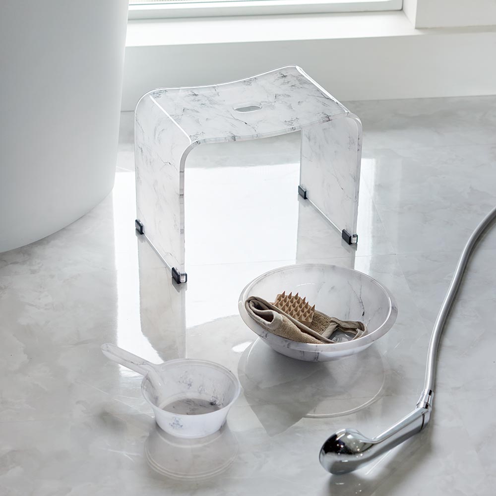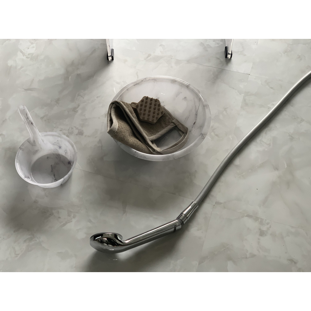 トレンドの大理石調デザインでバスルームをホテルライクな上質空間に。くつろぎのスペースが品よくクラスアップする、人気のマーブル柄の手湯桶です。美しい大理石調の、高級感あふれるバスシリーズ■人気の大理石柄を、透明感のある素材でつややかに表現しました。■美しいマーブル調の柄は飽きが来ず、長くお使いいただけます。■置くだけでバスルームを上品に演出します。■ホワイトマーブル調のホワイト系とシックな空間に仕上がるブラックをご用意。シリーズでコーディネートすれば、統一感のある上質空間にマーブル調シリーズは、下記のラインナップをご用意しております。【バスチェア】 高さの違う3サイズ展開。立ち座りしやすいLLサイズが人気です。【ウォッシュボウル】 高級感があり、置くだけで絵になるウォッシュボウルです。【手湯桶】 コンパクトで使いやすい、持ち手付きの桶です。