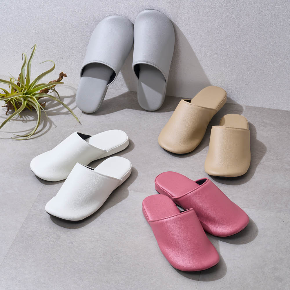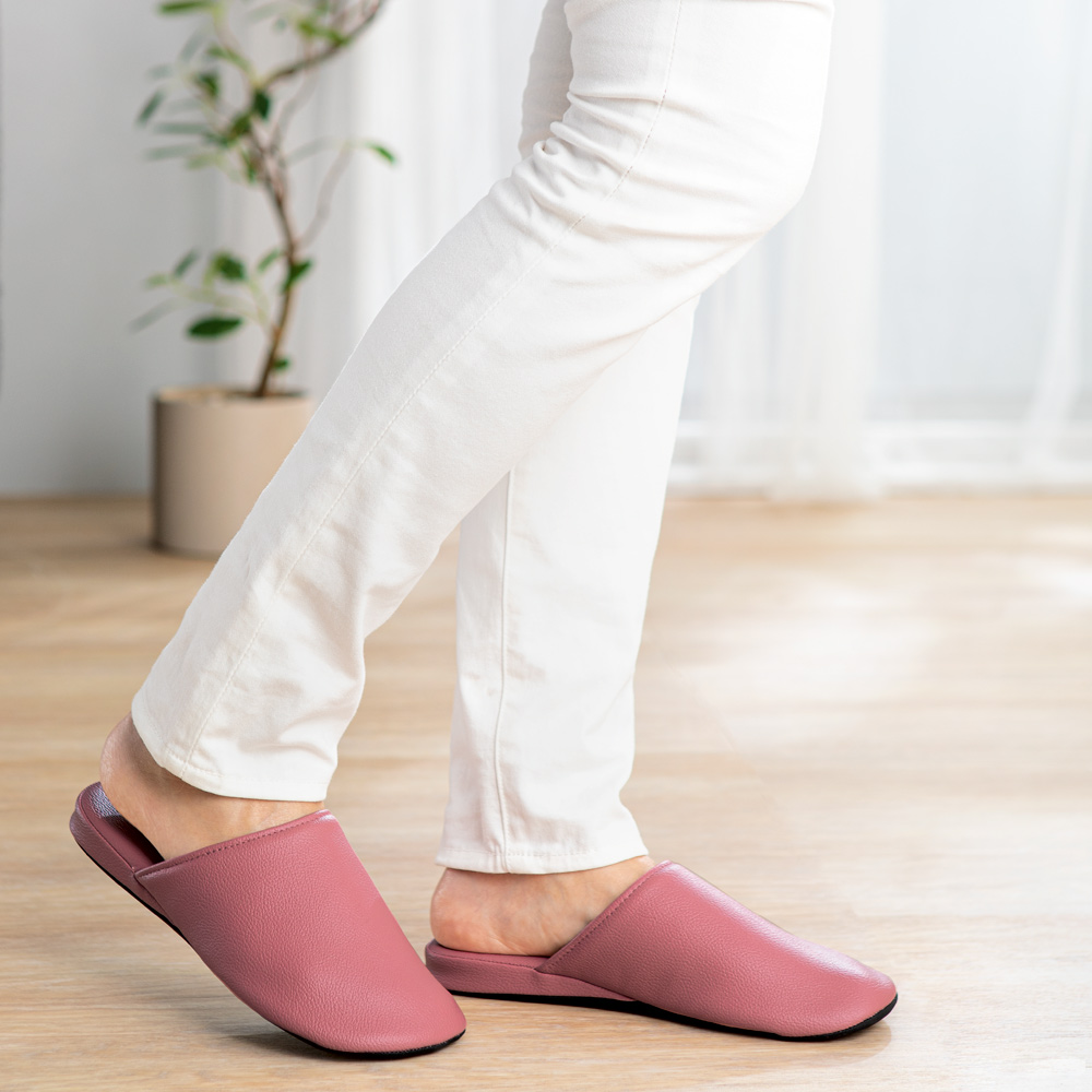 高級感のあるエンボス調のフェイクレザー。足裏に心地よくフィットし、キッチンやリビングでの立ち仕事の負担を軽減。汚れたらサッと拭き取れ、アルコールや次亜塩素酸系の消毒液にも対応。抗菌加工で清潔効果が持続します。高級感のあるリビングスリッパ。エンボス調の合成皮革で、汚れたらサッと水拭きできお手入れも簡単。汚れが気になったら、耐薬品機能なので、アルコールや次亜塩素酸系の消毒液での除菌が可能です。さらに、Ag系の抗菌剤を使用しているので高い抗菌作用があり、その効果が持続。2つの清潔機能でキレイをキープしてくれるスリッパです。中板は高反発ウレタン入りで、へたりにくく、クッション性があり、やさしい履き心地。ソール部分は足裏に快適にフィットする立体形状で足への負担を軽減。長時間履いていても疲れにくく、キッキンなどの立ち仕事にもおすすめ。裏面は音がしにくい素材を使用し、履きこみも深くフィット感のいいフォルムなのでバタバタ音がしにくいのもポイント。4色からお選びください。家族やゲストスリッパに、色が選べるお得な2足組もご用意しています。●高反発ウレタン入り中板部は、高反発ウレタン入りなので、クッション性がよくへたりにくいのが特徴。踵部は足裏にやさしくなじむカップ形状になっていて安定感があります。長時間履いていても疲れにくく、快適な履き心地です。●耐薬品機能でお手入れも簡単!ポリ塩化ビニル素材で、汚れが付着してもサッと水拭きできます。アルコールや次亜塩素酸系の消毒液に対応し、いつも清潔に使えます。●Ag系抗菌機能で衛生Ag+(銀イオン)系の肌にやさしい抗菌剤を使用しているので、抗菌作用が持続します。