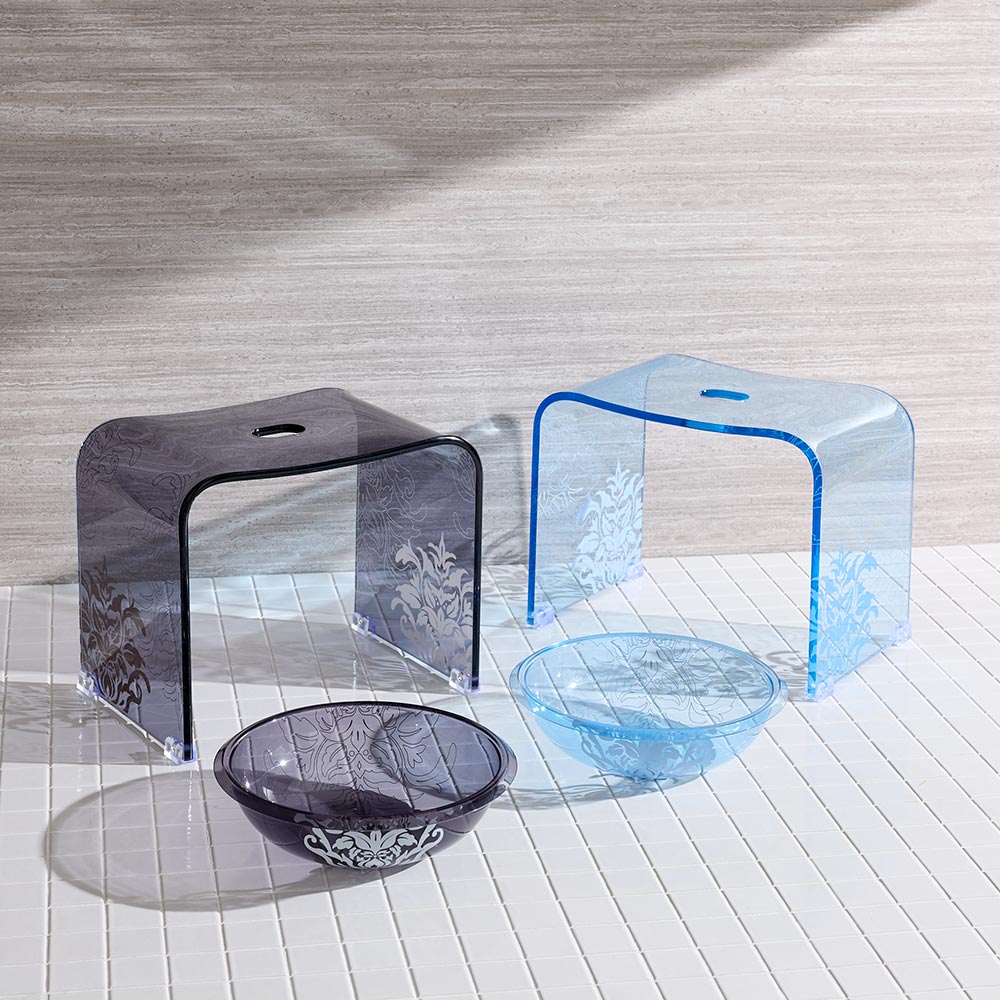 装飾的なダマスク柄をベースにして、花のモチーフを散りばめた北欧風のフラワーオーナメント柄。バスルームが華やかでモダンな雰囲気に。美しい装飾のダマスク柄のバスシリーズ花のモチーフが散りばめられた北欧風のフラワーオーナメント柄。透き通るアクリルと相まってバスルームを上品に演出します。ブルー、ブラウン(ブラウングレー)、クリアカラーの3色からお選びいただけます。シリーズでコーディネートすれば、統一感のある上質空間に。サミーラシリーズは、下記のラインナップをご用意しております。【バスチェア】高さの違う3サイズ展開。立ち座りしやすいLLサイズが人気です。【バスボウル】高級感があり、置くだけで絵になるウォッシュボウルです。【手湯桶】コンパクトで使いやすい、持ち手付の桶です。