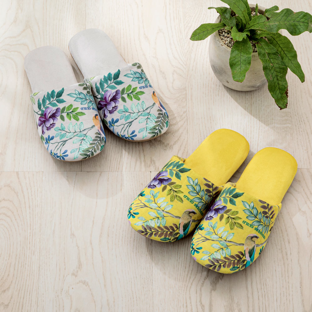 花鳥をモチーフにした、デザイナーズギルド〈ポーセリン〉。アンティークの陶磁器からインスピレーション得たシリーズのスリッパセット。やさしい履き心地と鮮やかな発色で足元を華やかに。ギルド独特のタッチと色彩で描くポーセリンアートが足元華やぐスリッパにアンティークの陶磁器(ポーセリン)からインスピレーションを得た花鳥の絵画を、鮮やかな発色で表現したデザイナーズ・ギルドのスリッパ<ポーセリン>花鳥柄の甲部分と、無地とのコントラストがクラシカルでモダンなデザイン。甲部分はロゴ刺しゅう入り。ふんわり心地よい踏み心地で、裏面は滑りにくい素材を使用。洗濯機で洗えるのも◎。深みを感じるイエローと、シックな色合いにあでやかさが優るグレーの個性的な2色。ギルドの新たな世界が広がります。※こちらは【スリッパ1足】のページです。以下のシリーズ品は関連商品からお求めいただけます。トイレマット単品/フタカバー・マットセット/タオル・ぺーパーホルダーカバーセット/タオル(同色2枚セット)/マット【ポイント1】英国発トータルライフスタイルブランド「デザイナーズ・ギルド」■DESIGNERSGUILD「デザイナーズ・ギルド」デザイナーズ・ギルドは、暮らしを彩る楽しさを発信し続ける、英国発トータルライフスタイルブランドです。1970年、トリシア・ギルドによりロンドンで設立され、以来、デザイナーズ・ギルド社は、ホームライフスタイル商品の幅広いバラエティによって世界的評価が高まっているブランドです。【ポイント2】なめらかでやさしい履き心地なめらかな肌触りで、クッション性のあるやわらかな履き心地。裏面は滑りにくい素材なので、パタパタ音もなく快適。トイレタリーだけでなく、キッチンやリビングにも。●洗濯機で丸洗いOK!汚れたら洗濯機で丸洗いできるので、清潔に使えます。※洗濯機でお洗濯する場合は必ずネットをご使用ください。※乾燥機・ドラム式洗濯機は使用できません。