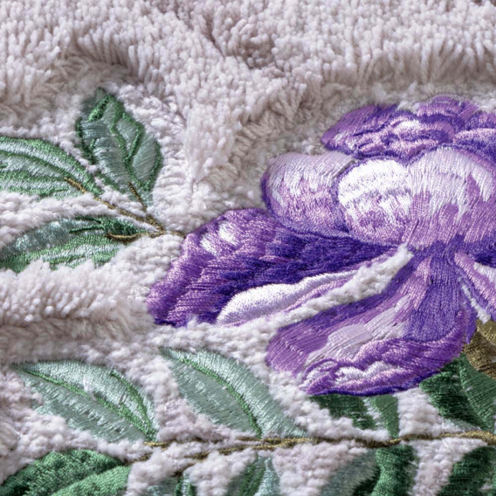 (イ)グレーシシュウ(写真は約50×240cm、同シリーズのスリッパをコーディネート) のびやかに浮き上がるラインシルエットのリーフ柄に、鮮やかな花刺しゅうがポイント。 ※お届けはキッチンマットのみになります。
