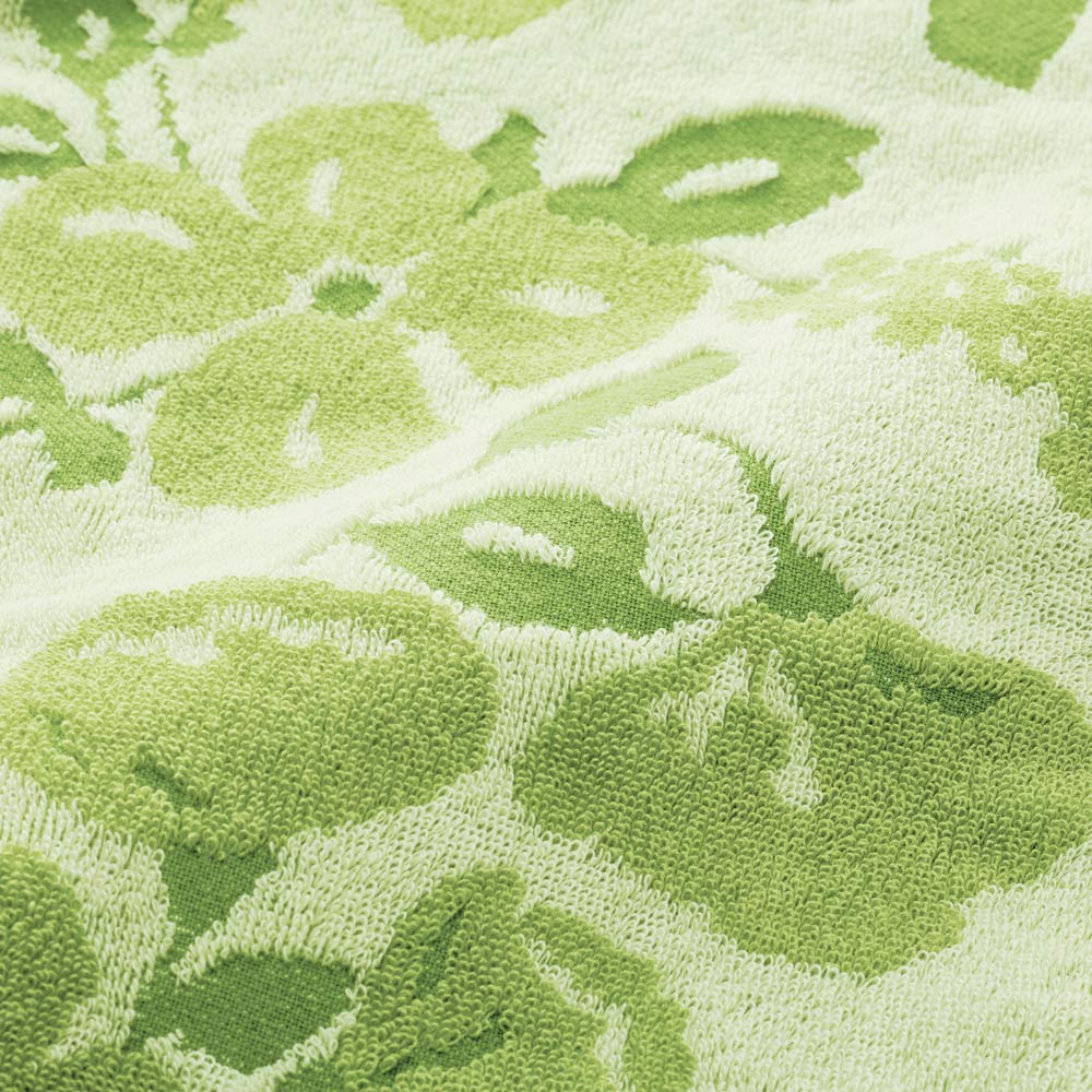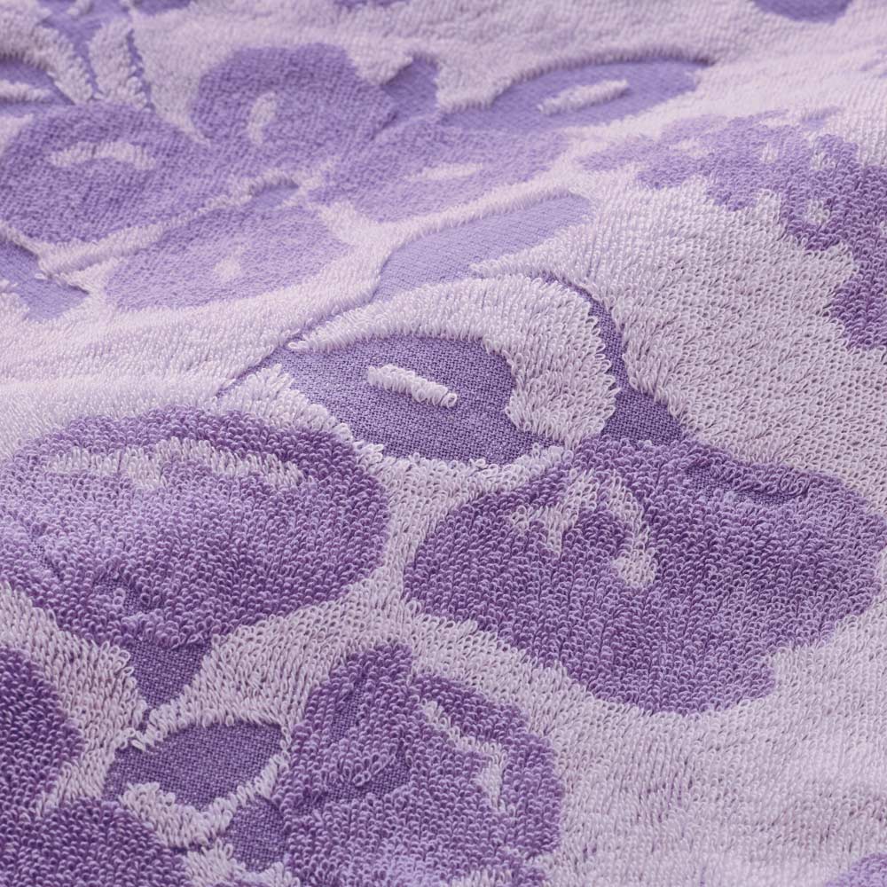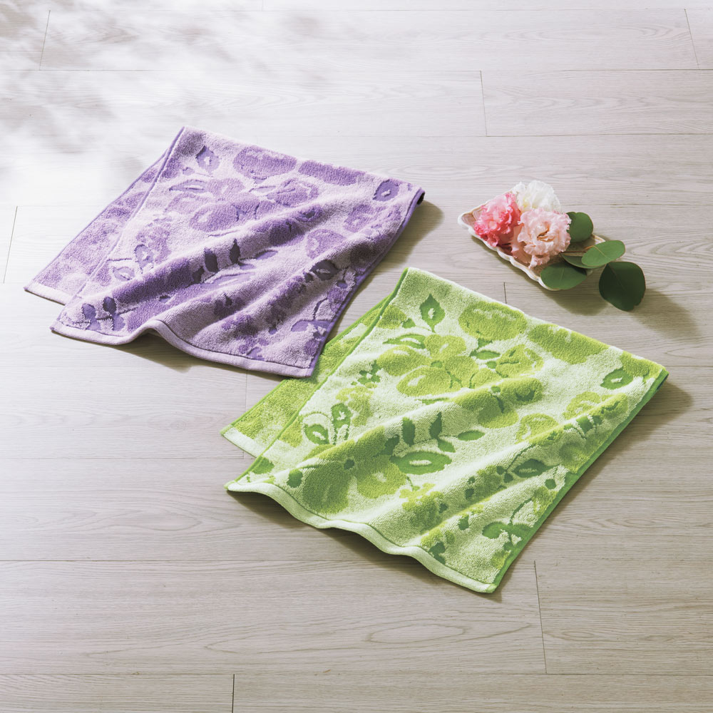 (ア)パープル(写真は大判マットとのコーディネート) 大胆な植物柄をジャカード織で表現したタオルと、繊細なワンポイント刺しゅうが美しいペーパーホルダーカバーの2点セット。 ※お届けはタオル・ペーパーホルダーカバーのセットのみになります。