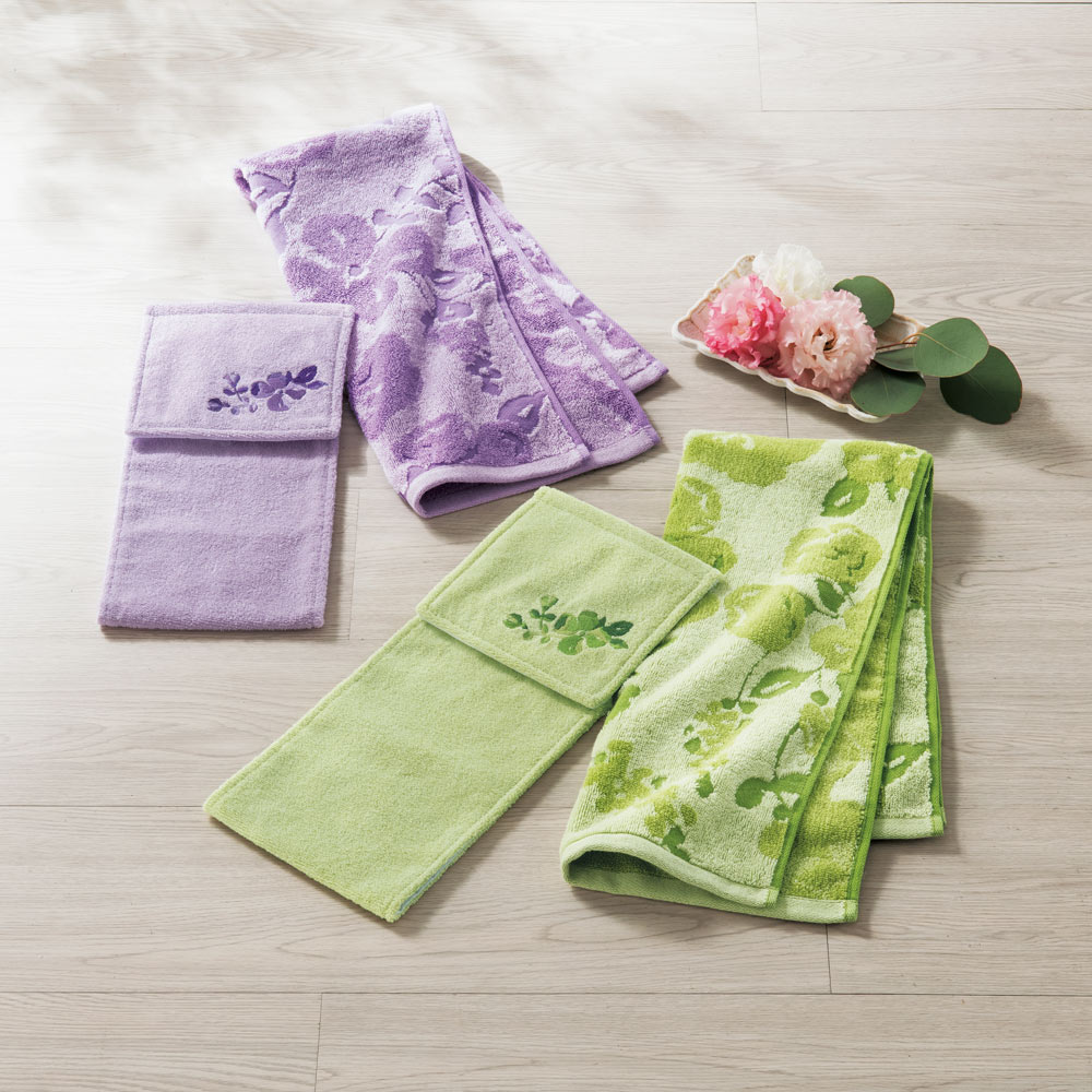 左から(ア) パープル (イ) グリーン(写真はタオル) ※お届けはタオル・ペーパーホルダーカバーのセットになります。