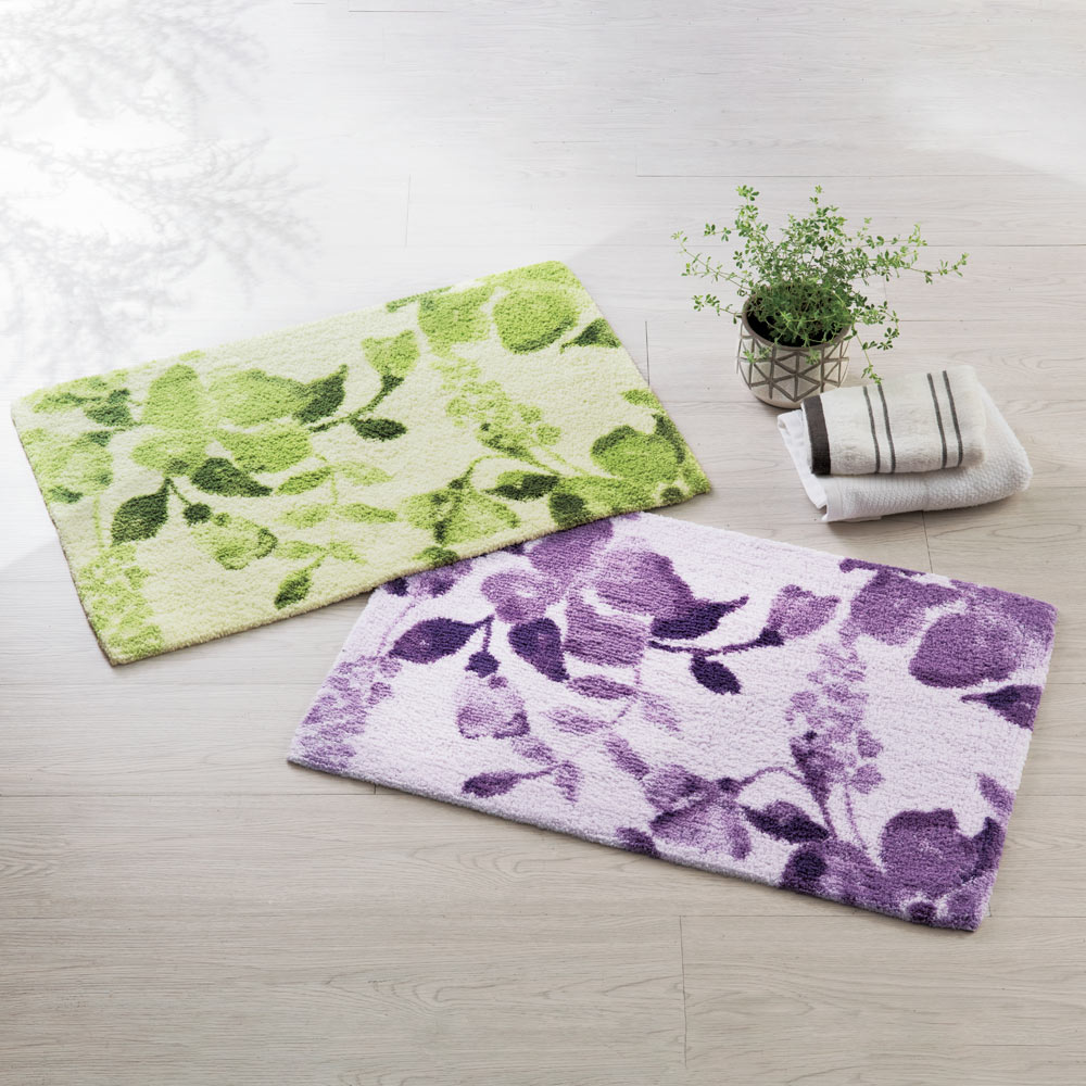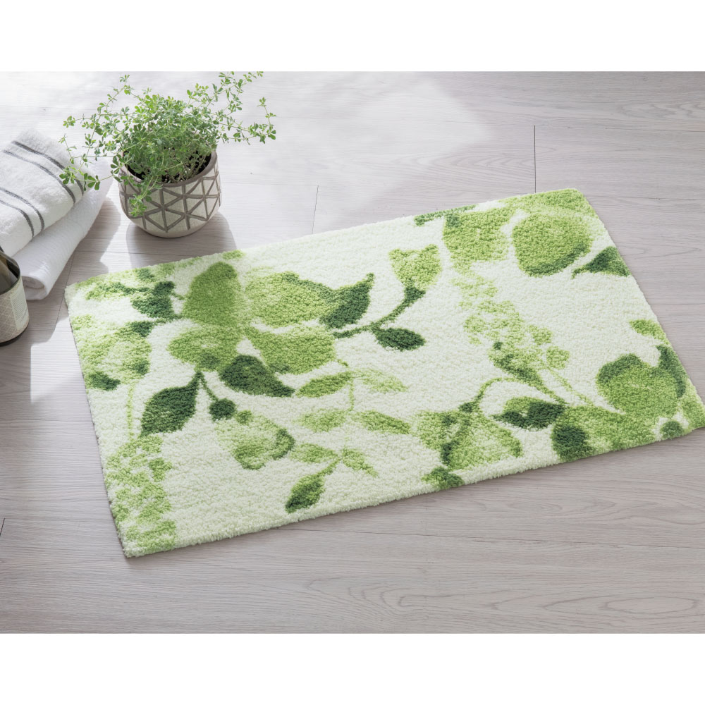 (イ)グリーン 水彩タッチの大胆な植物柄。グラデーションのシビラカラーが美しいエレガントなフロアマット。優しい踏み心地も魅力です。