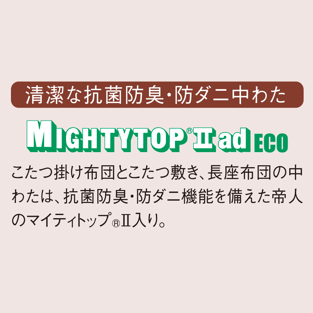 清潔な抗菌防臭・防ダニ中わたこたつ掛け布団とこたつ敷き、長座布団の中わたは、抗菌防臭・防ダニ機能を備えた帝人のマイティトップ(R)II入り。