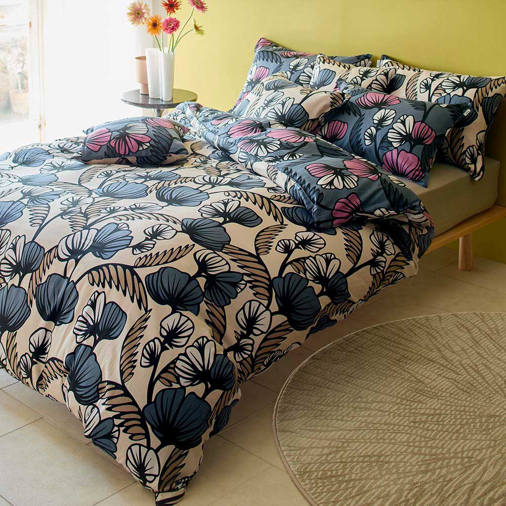 熱帯に咲く花をイメージして描かれたDECO。ディノス限定色のカバーリングは、大人っぽいピンクとブルーの花のリバーシブル仕様で表裏で寝室のイメージを楽しく変えてくれます。素材は綿100%のサテン生地で、美しい光沢と滑らかな肌触りです。DECO(デコ)熱帯に咲く花をイメージして描かれたDECO。ディノス限定色のカバーリングは、大人っぽいピンクとブルーの花のリバーシブル仕様で表裏で寝室のイメージを楽しく変えてくれます。リバーシブル仕様の掛けカバーは、シングルロングからクイーンロングまでご用意しています。季節の花や、インテリア小物に合わせて模様替えを楽しんで。印象的な一枚に仕上がります。素材は綿100%のサテン生地で、美しい光沢と滑らかな肌触りです。Finlayson/フィンレイソン「FINLAYSON(フィンレイソン)」は、1820年に創業され、2020年に200周年を迎えた、北欧フィンランド最古のテキスタイルブランドです。スコットランド出身の「ジェームス・フィンレイソン」がフィンランドの第2の都市、タンペレに紡績工場を設立したことから始まり、その優れた経営手腕により、広大な工場の敷地内には、学校や図書館、病院、教会などの施設が作られ、タンペレはフィンランド最大の工業都市として発展を遂げました。フィンランド国民にとって「フィンレイソン」は単なる一企業ではなく、国の発展に長く貢献してきた大切な存在でもあり、伝統を守りながらも常に新しいものを創り出そうとする変わらぬ企業姿勢は、フィンランドの誇りでもあります。 1860年台には、フィンランドで初めて女性を雇用。1951年にはデザインアトリエを設立。その後も、長く愛され続けている人気のクラシック柄はもちろん、シーズンごとにトレンドのカラーやモチーフを取り入れた新鮮なデザインを発信し続け、北欧の自然や植物、四季の移り変わり、アートなどからインスピレーションを受けて生まれるテキスタイルは、フィンランドを超えて世界の人々を魅了しています。使う人の肌に触れて安心感を与えるもの。毎日の生活に存在すること、高品質のテキスタイルデザイン。楽しく元気で居心地のよい生活のために!世界をすこしでも住みやすくするために行動しよう!『We are connected!』ものごとも人々も、人生も愛も、みんな繋がっている。忘れがちな大切な繋がりを思い起こそう。フィンレイソンは、2020年に創業200周年を迎えました。