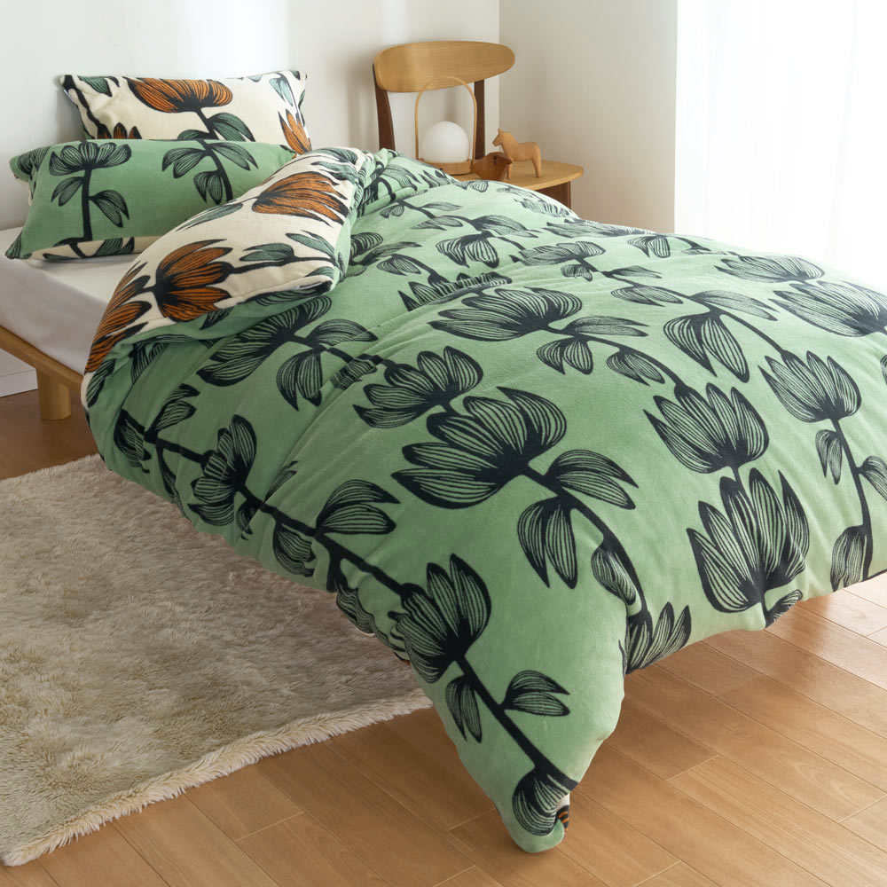 モダンな北欧テキスタイルを発信するフィンレイソン×寝具のnishikawaの、おしゃれで高品質な掛けカバーです。力強く咲く花をモチーフにした人気柄「アルマ」を、大人っぽい配色で仕上げたデザインが、冬の寝室を明るく温かく彩ります。なめらかでぬくもりのあるフランネル生地なので、冷え込む夜もひんやりしにくく快適。 Design by Sami Vulli【フィンレイソン寝具 ご購入先着200名様に「フィンレイソンミニトートバッグ」プレゼントキャンペーン実施中!】----------------------------------------------対象のフィンレイソン寝具※1をご購入いただいた先着200名様に、「フィンレイソンミニトートバッグ」をプレゼント!※2 なくなり次第終了いたしますのであらかじめご了承ください。※1 ■プレゼント対象商品はこちら※2 1回のご注文につき、複数購入の場合でもプレゼントは1点のみのお届けになります。発送手続きの関係上、ご購入の先着順は前後することがございます。-----------------------------------------------------------------------------------------------------寝室を温かく華やかに彩る、フランネルの掛けカバーモダンな北欧スタイルを発信する、フィンレイソン × 寝具のnishikawaによるおしゃれで高品質な掛けカバー。力強く咲く花をモチーフにした人気柄「アルマ」は、寝室のアクセントにぴったりのデザインです。素材には、なめらかでぬくもりのあるフランネル調の珊瑚マイヤー生地を使用。ふわふわで軽い肌ざわりが特長で、心地よい眠りをサポートします。さらに、表側と裏側でカラーが異なるリバーシブル仕様になっており、気分やインテリアに合わせて使い分けることができます。Design by Sami Vulli表面はアイボリー、裏面はグリーンのリバーシブル仕様です。 ※お届けは掛け布団カバーのみとなります。生地アップ