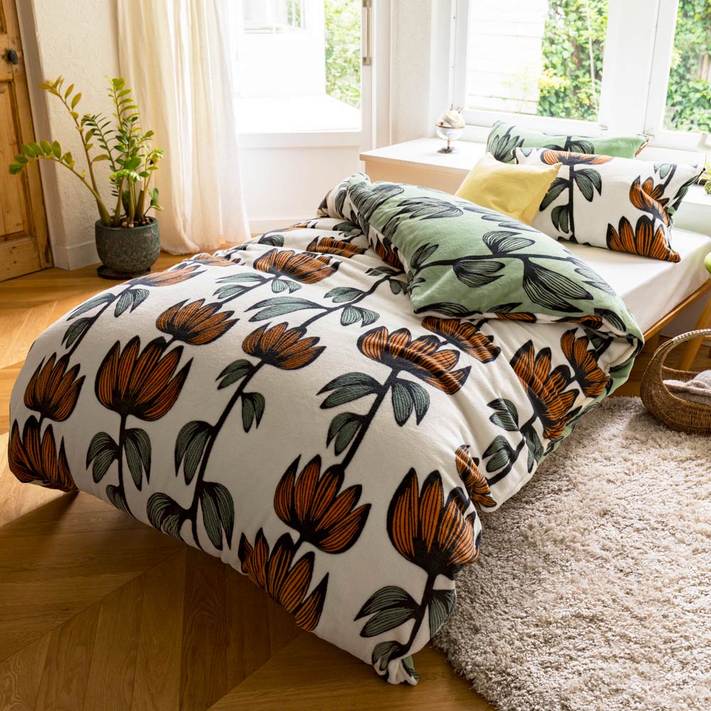 モダンな北欧テキスタイルを発信するフィンレイソン×寝具のnishikawaの、おしゃれで高品質な枕カバーです。力強く咲く花をモチーフにした人気柄「アルマ」を大人っぽい配色で仕上げたデザインは、寝室のアクセントにもぴったり。なめらかでぬくもりのあるフランネル生地なので、冷え込む夜もひんやりしにくく快適です。 Design by Sami Vulli【フィンレイソン寝具 ご購入先着200名様に「フィンレイソンミニトートバッグ」プレゼントキャンペーン実施中!】----------------------------------------------対象のフィンレイソン寝具※1をご購入いただいた先着200名様に、「フィンレイソンミニトートバッグ」をプレゼント!※2 なくなり次第終了いたしますのであらかじめご了承ください。※1 ■プレゼント対象商品はこちら※2 1回のご注文につき、複数購入の場合でもプレゼントは1点のみのお届けになります。発送手続きの関係上、ご購入の先着順は前後することがございます。-----------------------------------------------------------------------------------------------------寝室を温かく華やかに彩る、フランネルの枕カバーモダンな北欧スタイルを発信する、フィンレイソン × 寝具のnishikawaによるおしゃれで高品質な枕カバー。力強く咲く花をモチーフにした人気柄「アルマ」は、寝室のアクセントにぴったりのデザインです。素材には、なめらかでぬくもりのあるフランネル調の珊瑚マイヤー生地を使用。ふわふわで軽い肌ざわりが特長で、心地よい眠りをサポートします。さらに、表側と裏側でカラーが異なるリバーシブル仕様になっており、気分やインテリアに合わせて使い分けることができます。Design by Sami Vulli表面はアイボリー、裏面はグリーンのリバーシブル仕様です。 ※お届けはピローケースのみとなります。表面はアイボリー、裏面はグリーンのリバーシブル仕様です。 ※お届けはピローケースのみとなります。生地アップ
