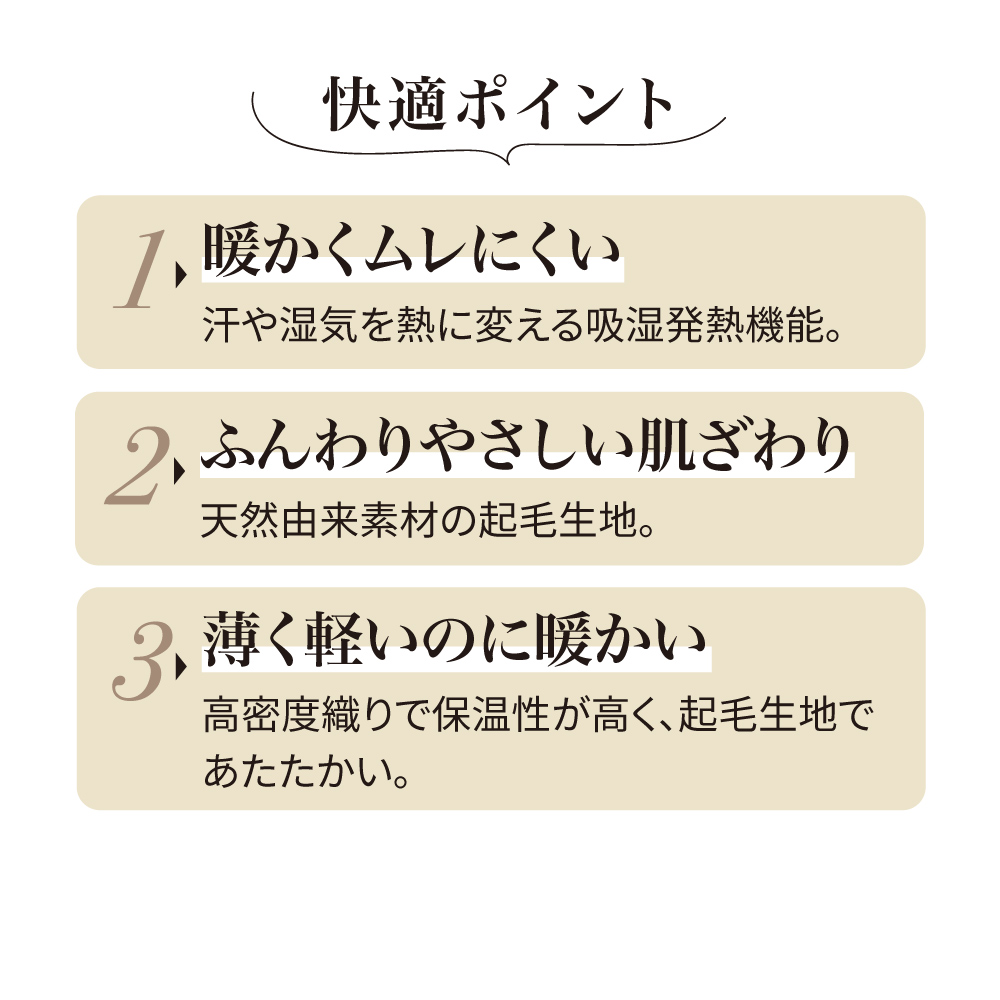 高密度生地が暖かさを閉じ込める地糸の密度が高く、暖かい空気を溜め込むことで優れた保温力を発揮。なめらかなシルキータッチの風合いです。