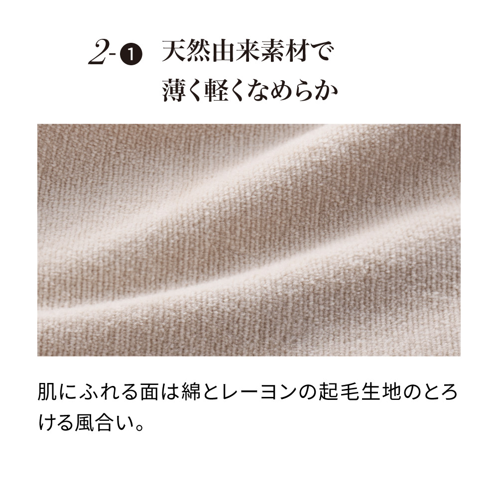 肌面はぬくもりのあるなめらか起毛生地綿とレーヨンのやわらかな肌触りは、「暖かく眠りたいけれど合繊が苦手」「肌に触れるものはやさしい素材を選びたい」という方にぴったり。触れた瞬間のひんやり感がなく、とろけるようななめらかな肌ざわりが特徴です。