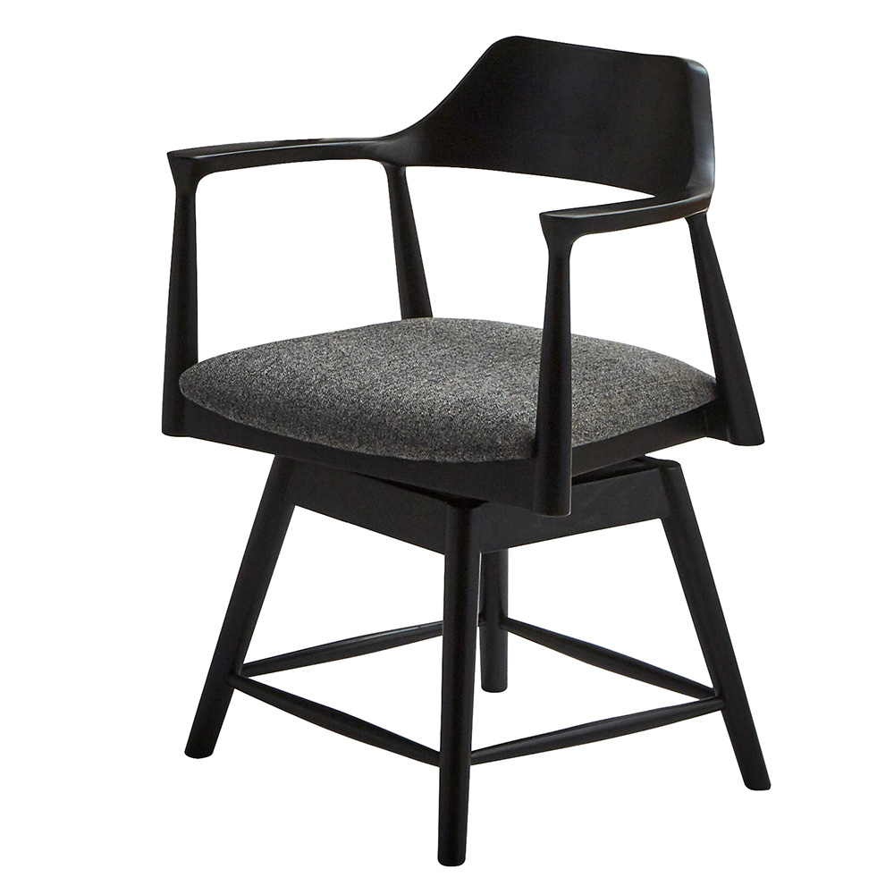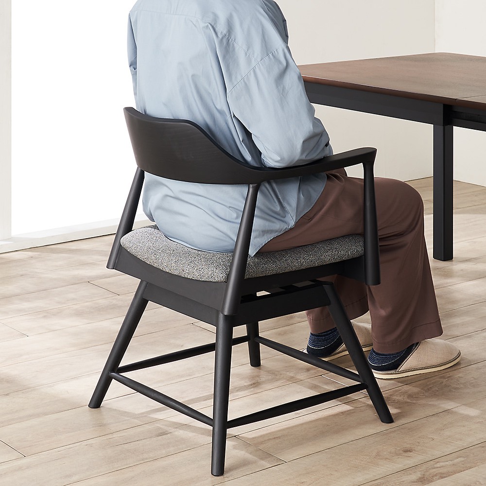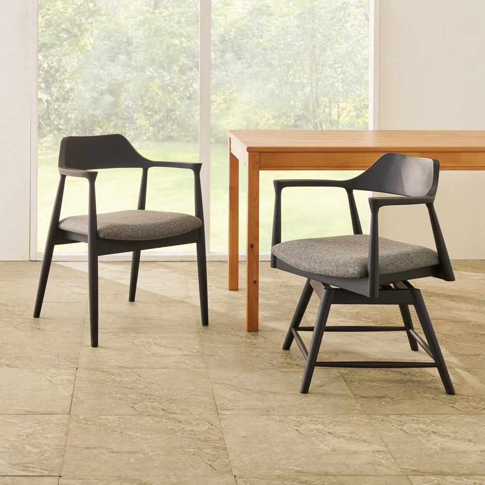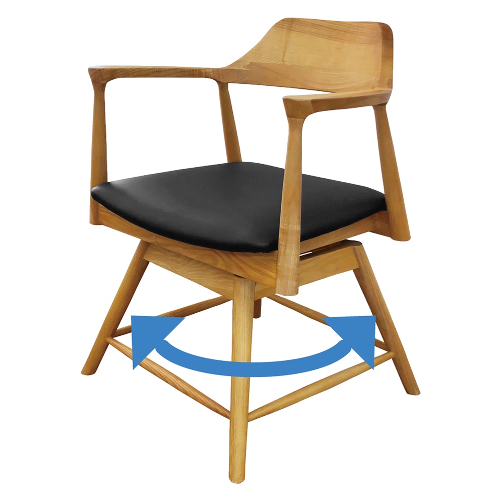 食事にも仕事にもゆったりアームチェア。ダイニングでもデスクでもお使いいただける天然木のチェア。回転式で肘掛け付きなので立ち座りも楽。座面の奥行きも広いので、ゆったりと座ることができます。背もたれから肘に掛けて滑らかな曲線が美しいひじつきの回転チェアーです。背もたれから肘に掛けて滑らかな曲線が美しいアームチェア。ダイニングでもデスクでも、どちらでもお使いいただける天然木のチェアです。回転式で肘掛け付きのチェアは、立ち座りも楽にできます。座面の奥行きも広いので、ゆったりと座ることができます。