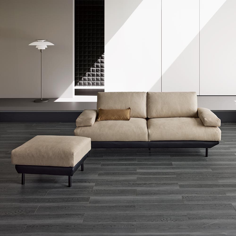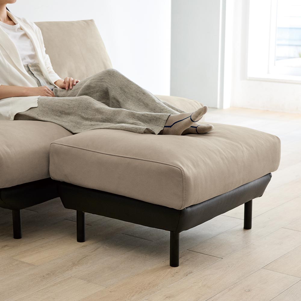 イタリア発の優美なフォルムに、ベースがブラックのツートン張りのオットマン。クッションはヌバックのような質感で、お部屋を上品な印象に装います。エレガントな空間を創造するソファ。上質な素材と独創的なデザインが融合し、快適なリラックスタイムを約束します。イタリア人デザイナーのモダンなデザインに異素材ツートン張りを採用し、クッション部分にはレザーテックス(ポリエステル布)を、フレームにはユーロテック(合成皮革)を使用。フレームに施した船底のデザインが、上品で洗練された印象を与えます。フェザー入りのクッションが上質ソファの座り心地を実現し、長時間ゆったりと過ごすことができます。LEATHERTEX(レザーテックス)■唯一無二のテキスタイルデザイン色合いの濃淡や艶感、厚革のしぼ(立体)感など、細部にまでこだわり見事に再現しました。本革のようにナチュラルでエレガントな雰囲気を演出します。■美しい発色インテリアに自然に馴染む美しい発色が、ソファのデザインを引き立て、気品あふれるモダンな雰囲気を演出します。■しなやかなテクスチャー柔らかくしなやかで、どんなソファのデザインにも良く馴染みます。シルエットを美しく仕上げ、座る人を包みこみます。■心地よい肌ざわり少し起毛感のある、なめらかな肌ざわりです。さらりとしてべたつかず、不快感なく長時間快適に過ごせます。■快適な温度感合皮にはない通気性の良さと熱のこもりにくさで、夏はさらっと、冬はひんやりしない快適な温度感が魅力です。