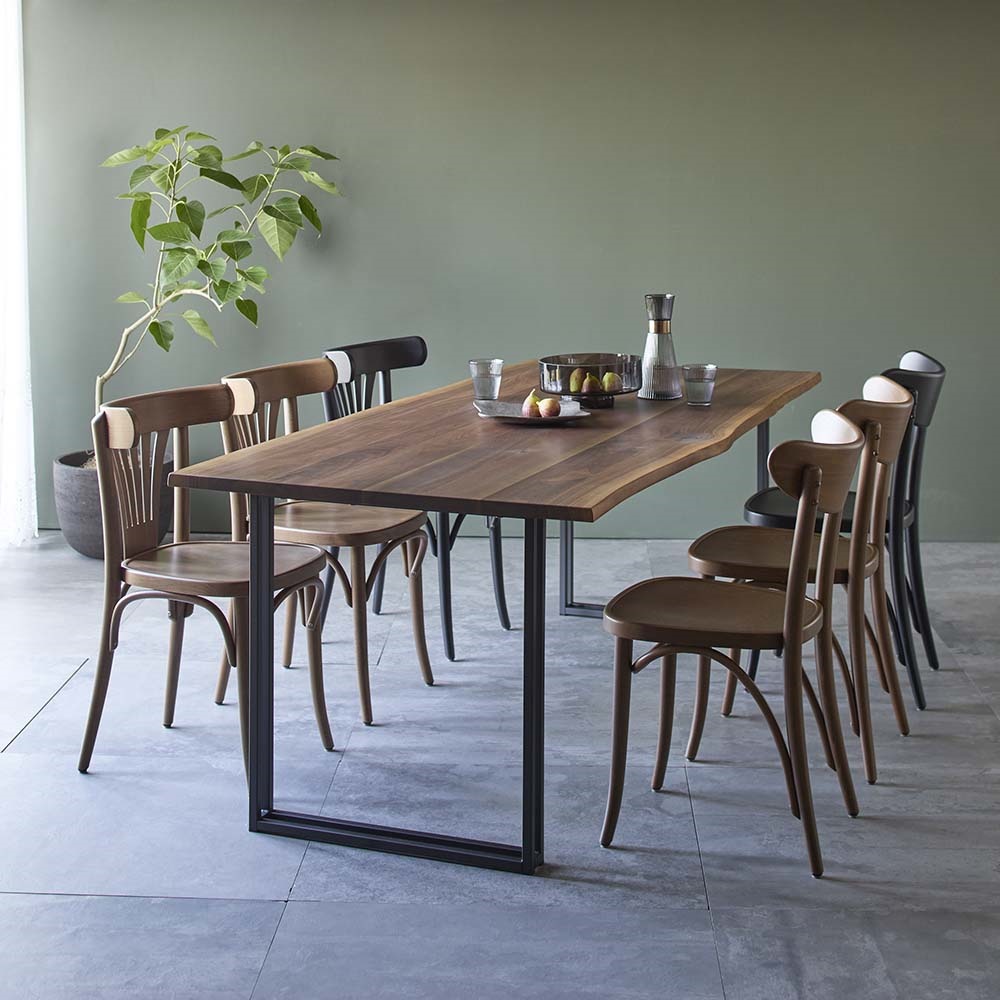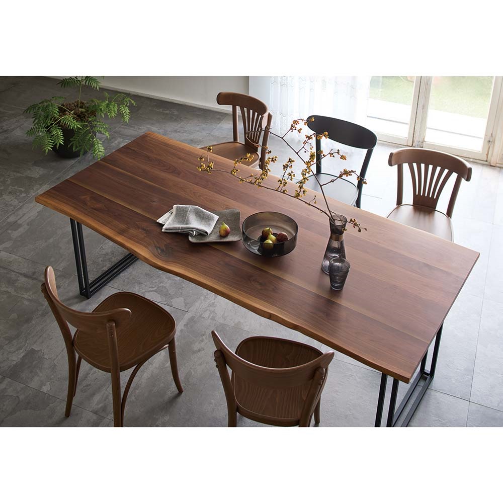 無垢材を使用した天板に、スチールレッグを組み合わせ。異なる表情がそれぞれの味になる一点ものの風格あるテーブル。一枚板のような迫力をより手の届きやすい価格で実現しました。天然木の耳付き材を贅沢に使用天然木の耳付き材を贅沢に使用した、一枚板風ダイニングテーブルです。「耳」とは丸太の一番外周部にあたる材料のこと。本物の一枚板となると高価になりがちですが、耳付き材と無垢材とを組み合わせて作ることで、一枚板のような迫力をより手の届きやすい価格で実現しました。※天然素材のため個体差があります。天板は素材はウォルナット天然木とオーク天然木をご用意【ウォルナット天然木】重く硬い性質を持ち、高級材として大変人気が高い材料です。ウォルナットの持つ節の良さを生かしています。【オーク天然木】ウィスキーやワインを貯蔵する樽にも使われる、重く強靭な性質をもった木材。よりナチュラルな風合いをお楽しみいただけます。お手入れしやすいウレタン塗装表面にウレタン樹脂塗膜を形成する塗装で、オイルに比べて傷に強く、水によるシミなどもおきにくいです。お手入れも楽にしていただけます。天然木×スチールレッグが一点ものの風格に抜け感のあるスチール脚を組み合わせることで、スタイリッシュなデザインに。さらに重量面もカバーしています。軽量化により模様替えや掃除の際に動かしやすい作りになっています。