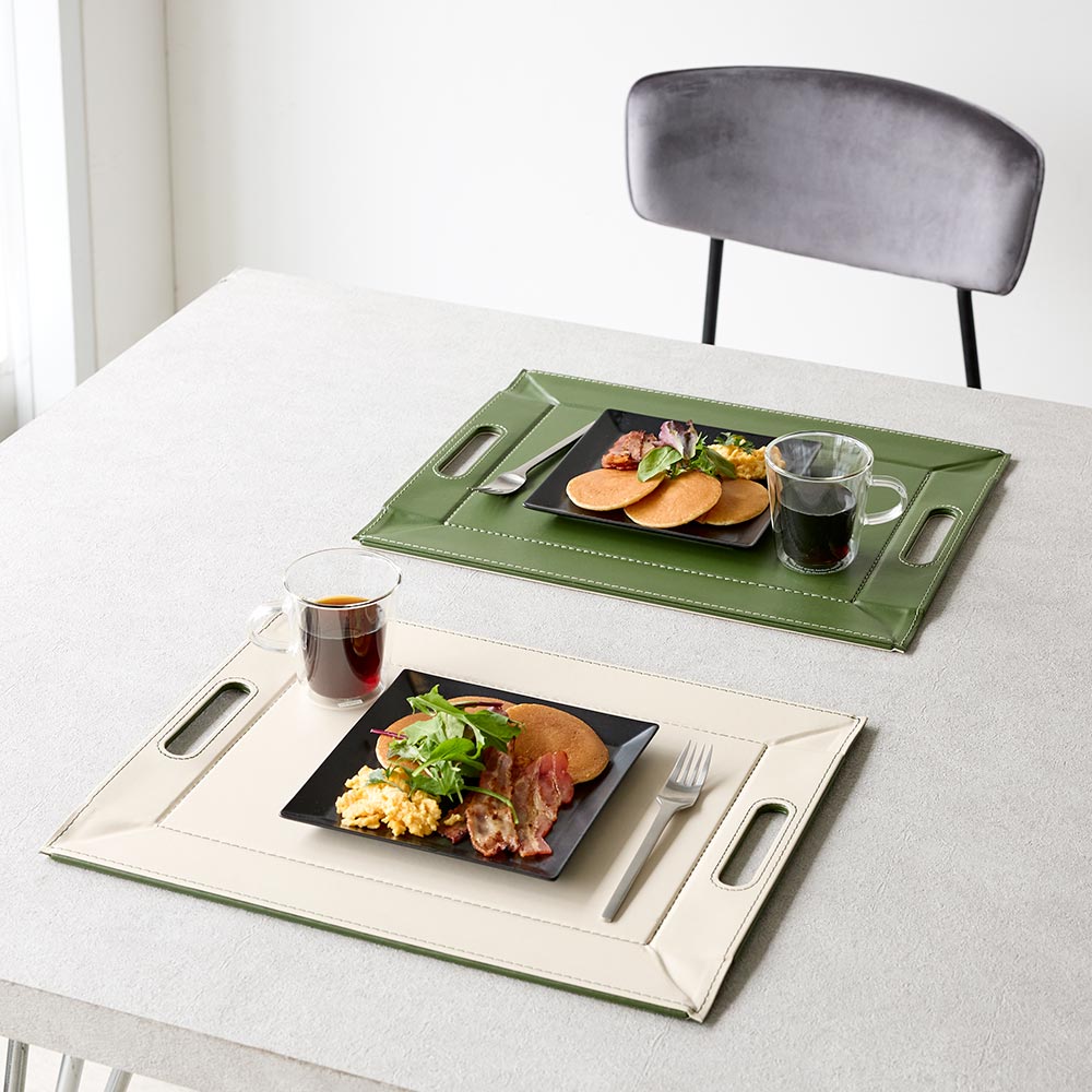 持ち上げるとトレーに、テーブルに置くとそのままランチョンマットになる2WAYアイテム。調料理のセッティングから後片付けまで、これ一つ両端を持ち上げるとトレーになり、テーブルに置き手を離すとトレーの四隅が自然に開き、フラットなランチョンマットになる便利なアイテム。小サイズは45×35cm(トレー時の有効内寸は34.5×24.5cm)で、メインのお皿とドリンクが置けるサイズです。来客時のティーセットを運ぶのにも十分な大きさです。お食事後はそのまま運べて後片付けもスムーズに行えます。豊富なサイズやデザインで、あなたにぴったりな1枚を両面でカラーが違うのでリバーシブルでお使いいただけます。インテリアやその日の気分に合わせてカラーをチェンジするのがおすすめです。サイズは朝食プレートを乗せて運べる小サイズの2枚組/4枚組、大皿も安心して乗せられる大サイズの2枚組/4枚組をラインアップ。ご自宅ではもちろん、お引越し祝いや結婚祝い、母の日などのギフトにもお薦めです。滑りにくいから使いやすいノンスリップ加工表面に滑りにくいノンスリップ加工が施されており、ストレスなくテーブルへ運ぶことができます。軽量ながら食器やカトラリーを乗せても安定感があるので、お子様の手伝いや接客時、年配の方でも安心してお使いいただけます。高い収納性とお手入れしやすい扱いやすすさが魅力的薄いのでサイズ違いや家族分揃えても場所を取らず、すっきりと収納することができます。さらに、水をはじく素材なので、飲み物をこぼしてしまっても安心です。食後にサッと拭くだけでお手入れできます。※汚れた場合は、固く絞った布巾で水拭きをして下さい。※中性洗剤のご使用は、商品を傷める場合がございますのでお避け下さい。