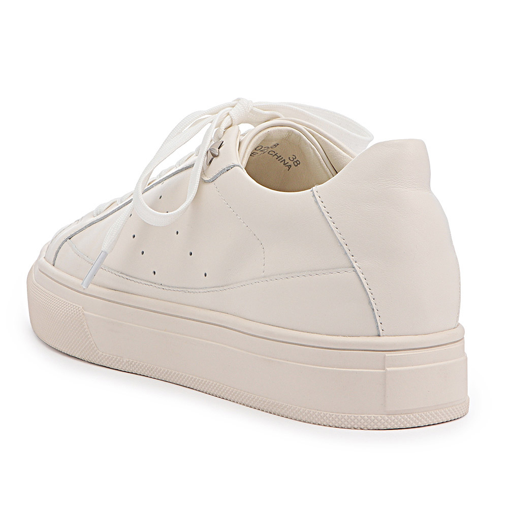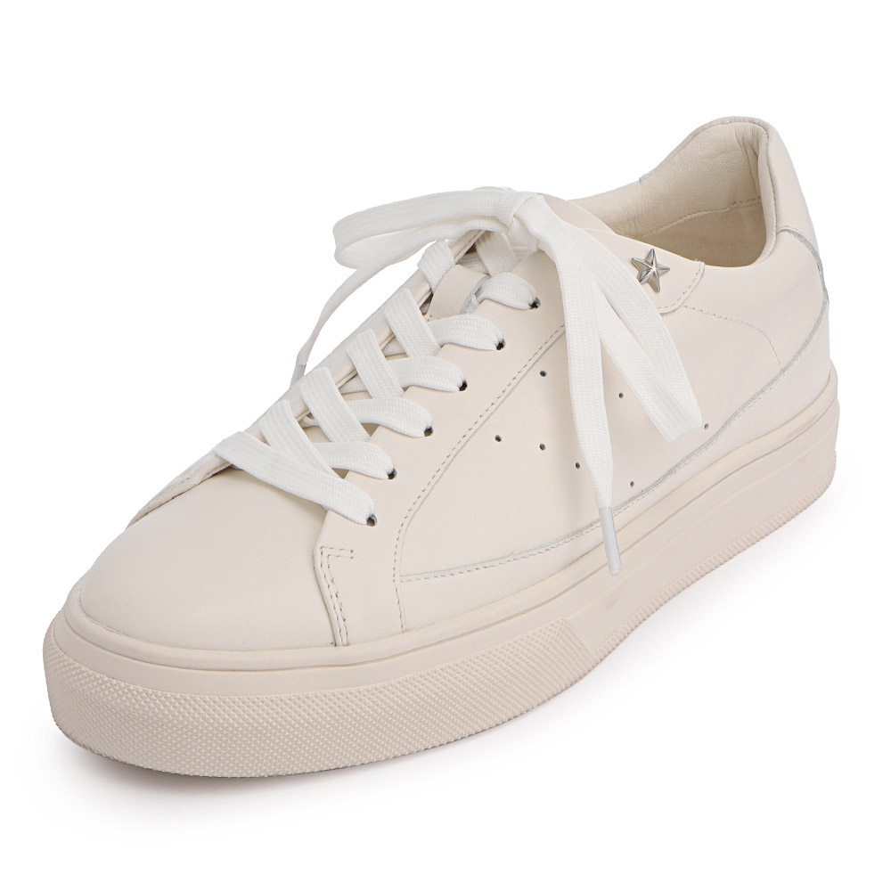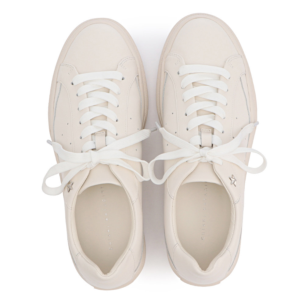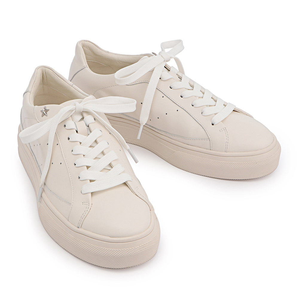 柔らかな牛革を使用したレザースニーカー。アッパーはソールを同系色に仕上げることによって、カジュアルなスニーカーをきれいめスタイルにもピッタリの印象に。星形のスタッズがポイントのレースアップタイプのスニーカーは、足を包み込む形状のカップインソール仕様でホールド感も◎。