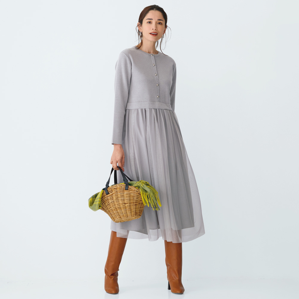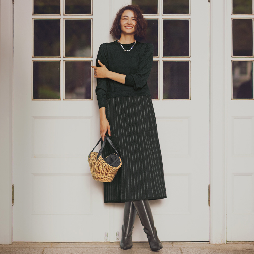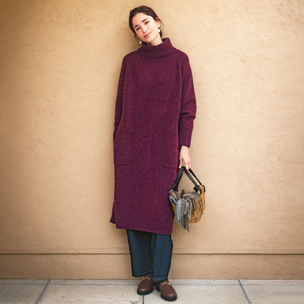 コーディネート例 /アルパカ混ワンピースにカゴバッグの抜け感が映える