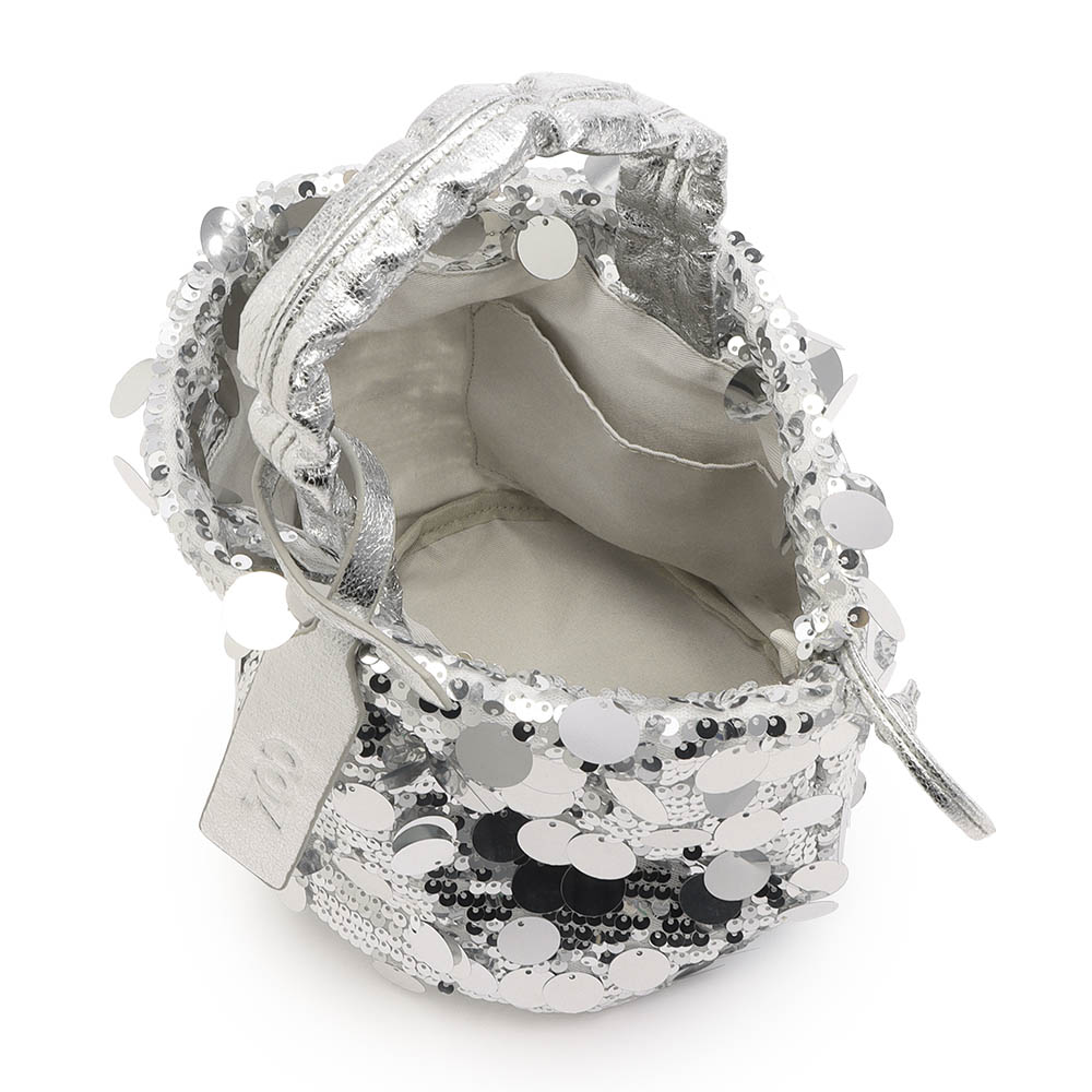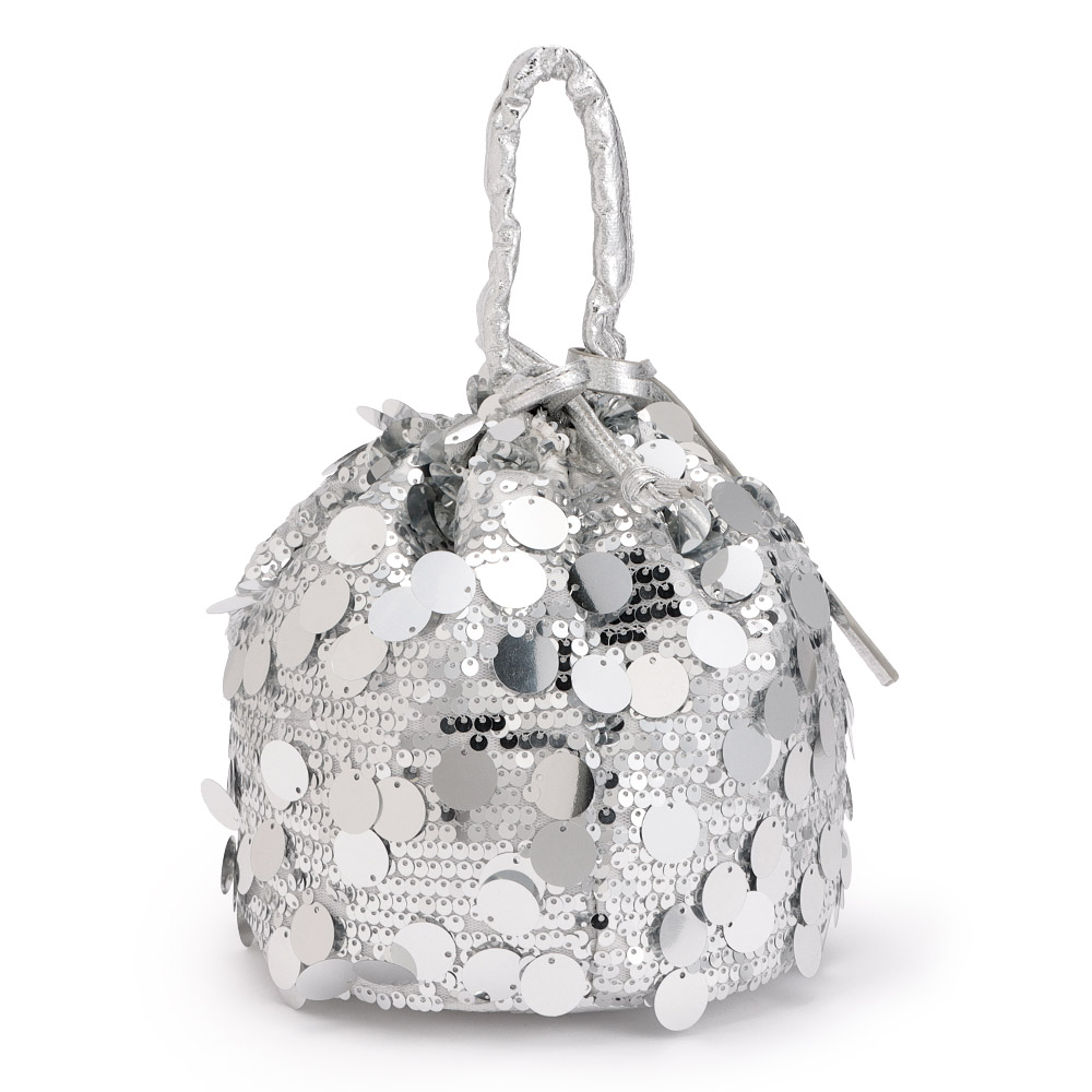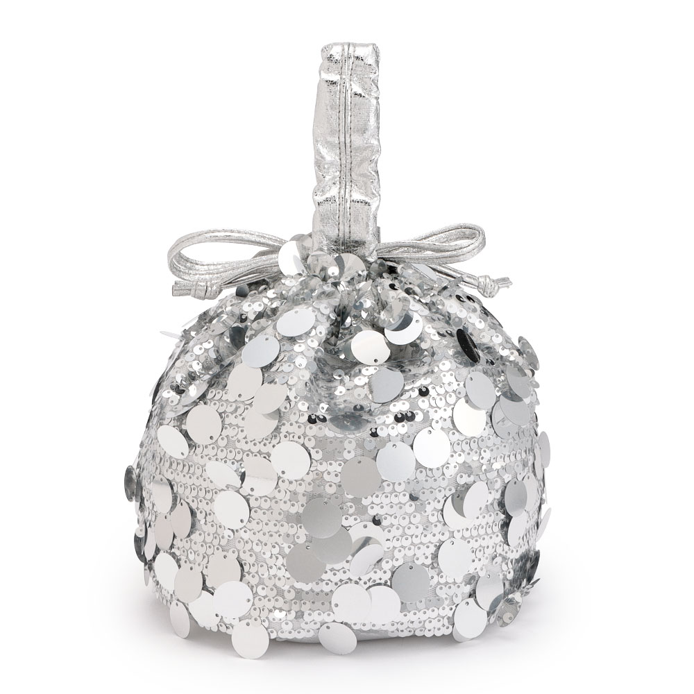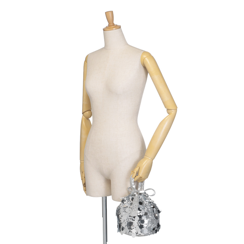 大小2種類のスパンコールをランダムにミックスし、華やかさと立体感を演出。巾着の口に配した紐と持ち手は同色のメタリック生地を使い統一感を。コンパクトながらマチがあり収納力も十分。≫ POINT巾着&小さいバッグが大好き!ミラーのようなキラキラ感が装いを輝かせてくれます。