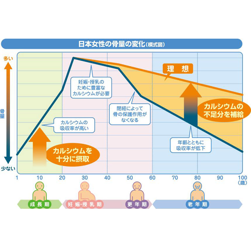 女性の骨は40歳を過ぎるとピンチ! 成長とともに骨量が増えて20歳でピークを迎え、40歳を過ぎると急激に低下!だから40歳を過ぎたらカルシウムを意識的に摂ることが大切です。