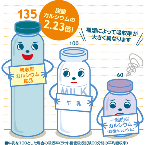 カルシウムは吸収しづらい栄養素。ユニカルの吸収率は食べ物の中で最も高い(※2)と言われる牛乳の約1.35倍! ※2:兼松重幸「成人に於ける各種食品中のカルシウム利用並にカルシウム所要量に関する研究」栄養と食糧Vol.6:135-147、1953年