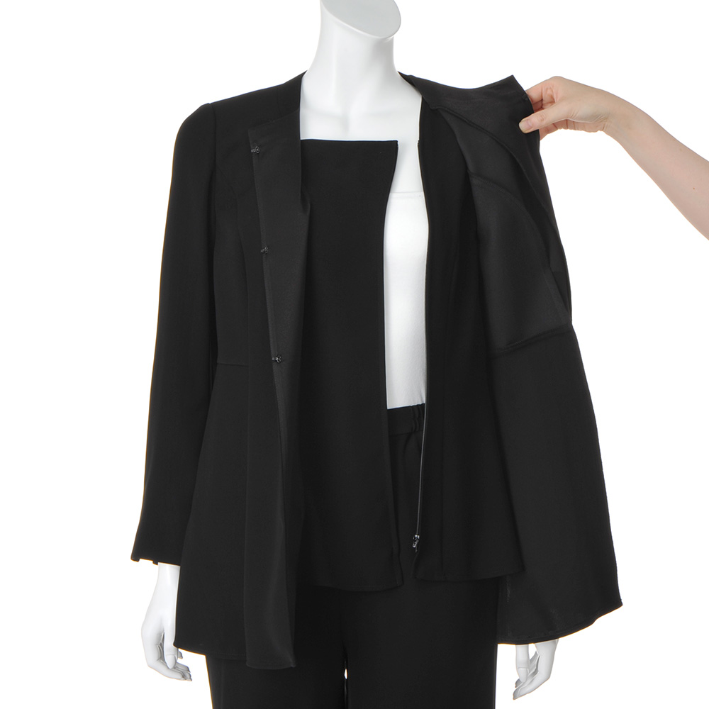 ジャケットの前立てを開けたブラウスの左胸部分にファスナーを配し、着脱◎。