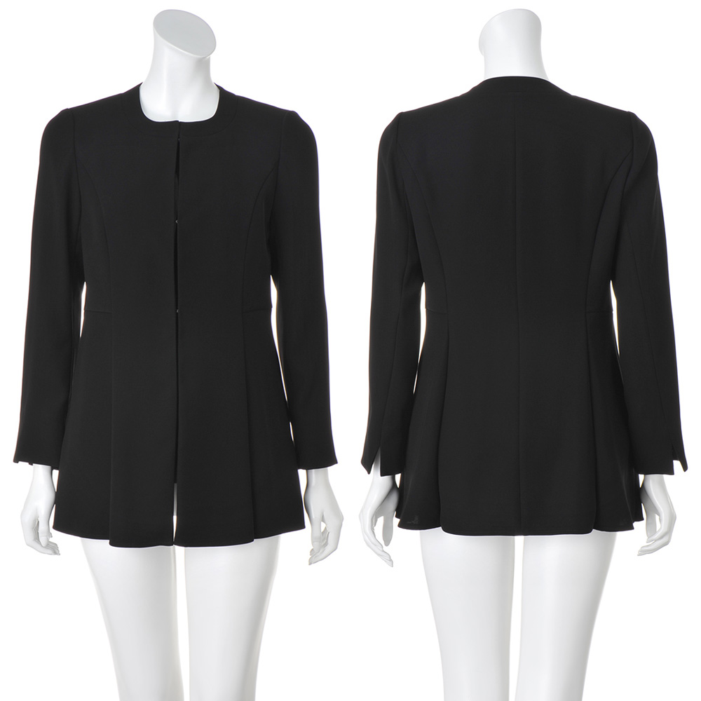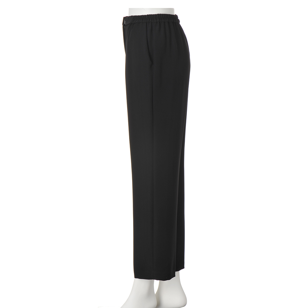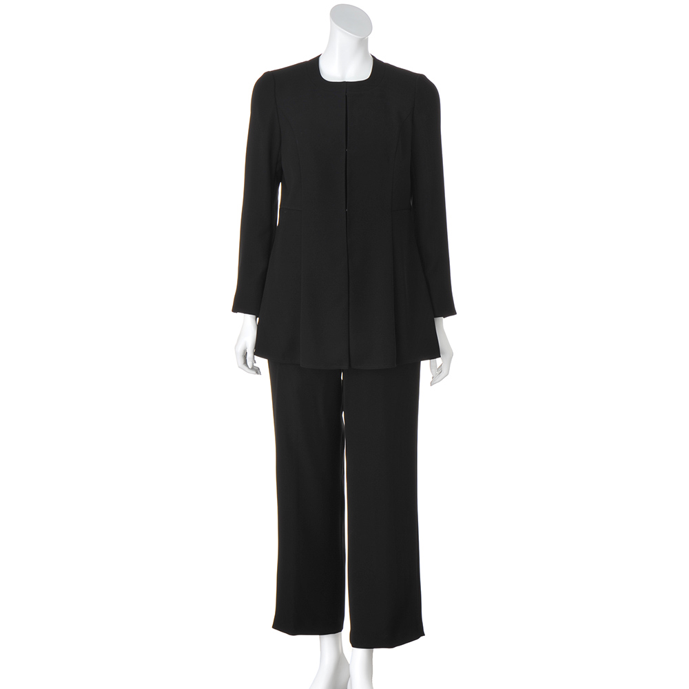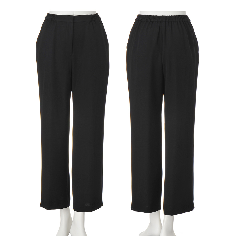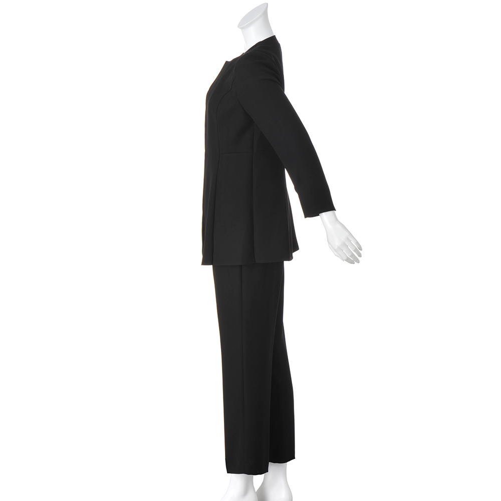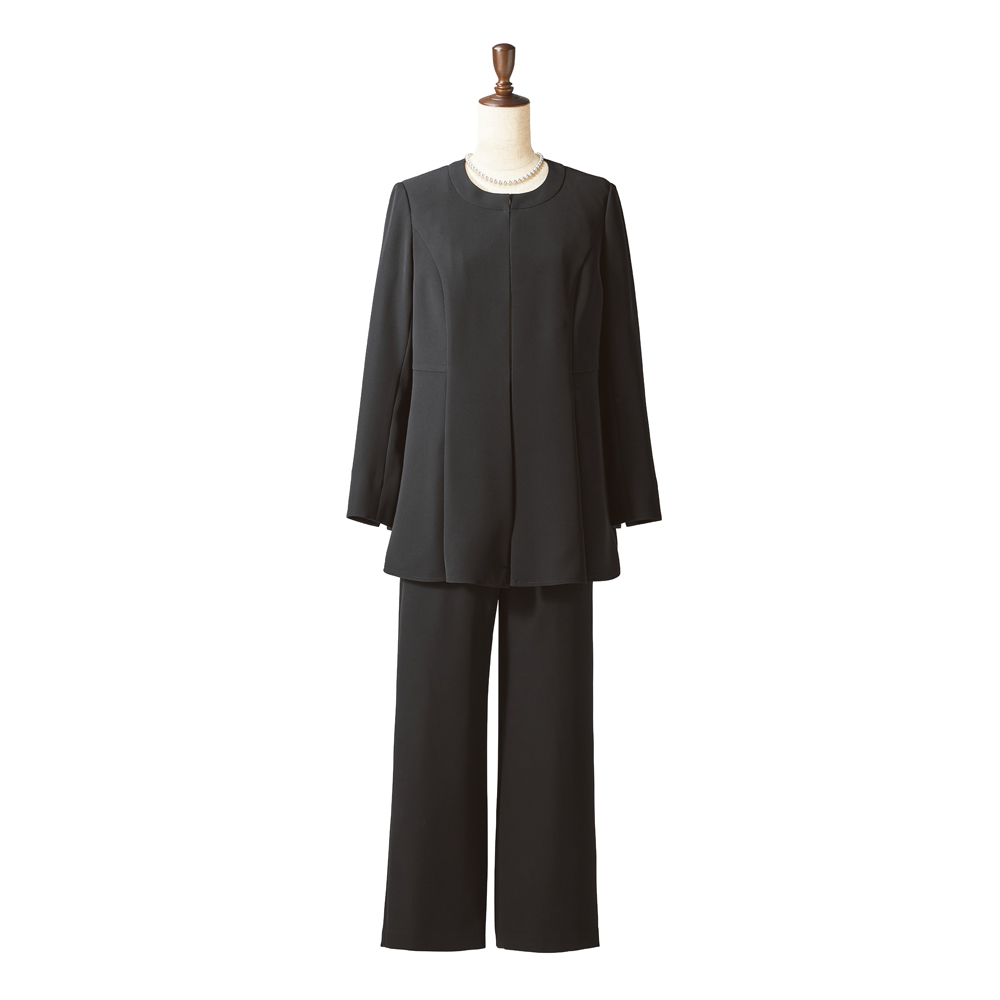 ELEGANT BLACKフォーマルはもちろんデイリーにもフォーマルな場にふさわしい品格を備えつつ、堅苦しさを感じさせない着心地とデザイン。日常にも活躍し、自宅で簡単にケアできる最旬ブラックフォーマルをご紹介します。品格を保ちつつ、着心地良くブラウス一体型ジャケットとパンツのセット。ジャケットは中にブラウスをレイヤードしている風のデザイン。パンツはストレートシルエットで長時間の着席や正座も楽らく。▼フォーマルブラックとは冠婚葬祭など礼節を重んじる場で着用される2度染めした黒のこと。一般的な黒より深みのある漆黒に近く、光沢をおさえた落ち着いた色味が特徴。
