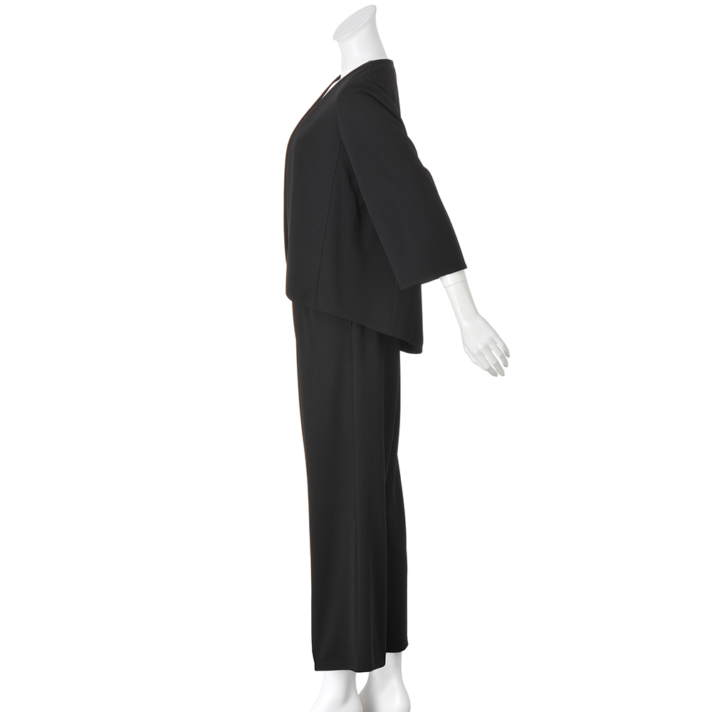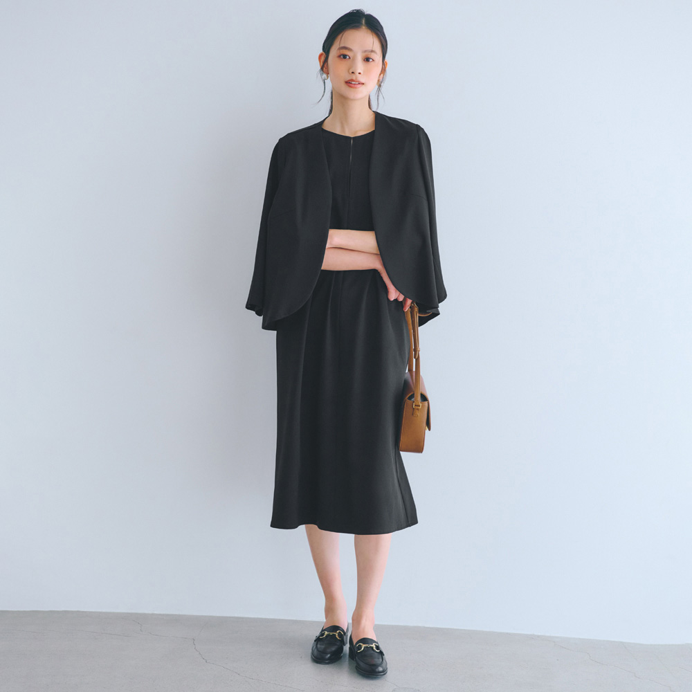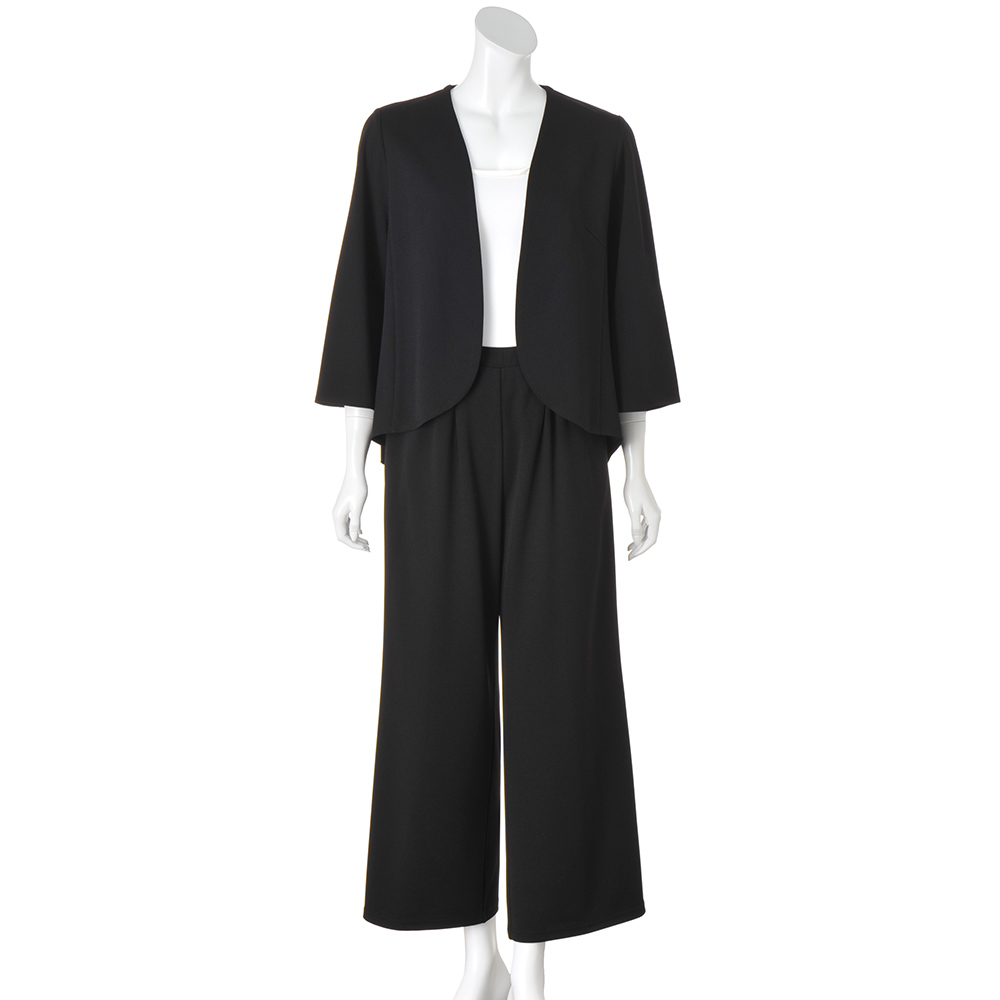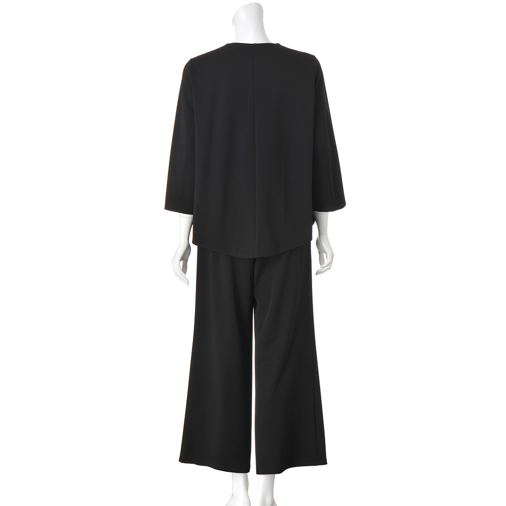 ジャージージョーゼット3点セット横ストレッチで伸びやか、心地よさときちんと感を両立。裏側はさらりとした肌ざわりで着心地◎。UVカット機能付きでシーズンレスに着用でき、自宅で洗濯可能。お手入れが簡単です。[ウォッシャブル|横ストレッチ|UVカット]布帛見えする伸びやかなジャージー生地でジャケット、2ウェイドレス、パンツの3点セットを作りました。きちんと感のなかにもラフさがあり、大人の余裕を感じられるような3点セットです。着回し力抜群でカジュアルからフォーマルまで、幅広いシーンに対応します。JACKETジャケットはノーカラーでナチュラルな着流しデザイン。抜け感のある短め袖で、ゆったりしたアームホールと袖幅がポイント。着心地のよさときちんと感を両立した便利なアイテムです。DRESSミニマルなデザインのドレスは前後で着用可能。ゆったりしたストレートラインでお腹まわりやヒップをカバー。寒くなってきたらタートルネックと合わせるのもおすすめです。PANTS落ち感のあるパンツは、はき心地のよいウエストゴム仕様に。程よいセミワイドシルエットで足のラインをやさしくカバーし、すっきり見せてくれます。両サイドにはポケットがつき、実用性にも配慮。