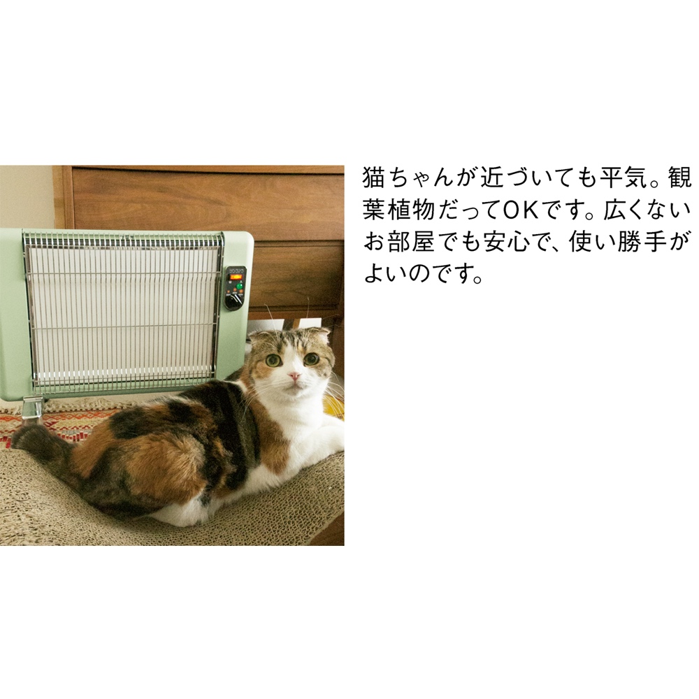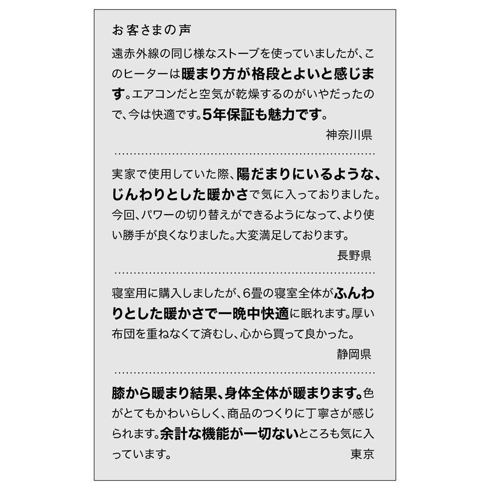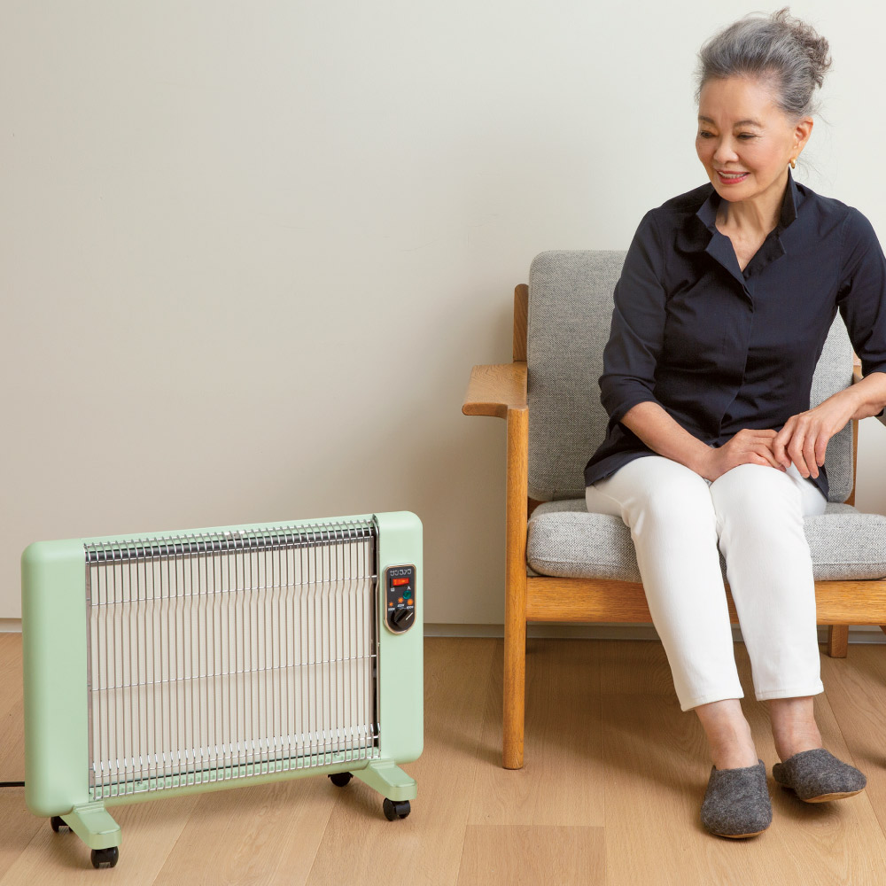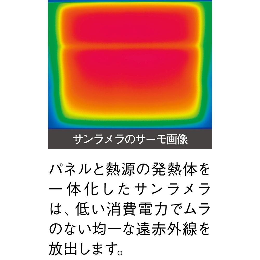 有元葉子さんおすすめ。陽だまりの暖かさ。空気も汚さず省電力。安心の日本製。「国産でこんなに良い暖房器具があったなんて、知りませんでした。ホッとするような、気持ちのいい暖かさなんです」ディノス限定カラーのスチールブルーがオススメ!有元葉子さんおすすめ。陽だまりの暖かさ。「国産でこんなに良い暖房器具があったなんて、知りませんでした。ホッとするような、気持ちのいい暖かさなんです」ディノス限定カラーのスチールブルーがオススメ!家の隅々まで暖かく、快適な空間を遠赤外線を利用して、部屋全体を均等に暖めることができます。特殊なセラミックパネルが暖かさを部屋の隅々まで行き渡らせ、冷暖の差を防ぎます。常に足元は暖かく、頭は爽やかに保たれる快適な空間を提供します。家族全員に優しい安全設計前面のガード部分は触っても熱くならず、お子様やペットが近づいても安心です。防止金具でガードの外れを防ぎ、過熱防止サーモスタットや倒れた際の通電ストップセンサーで二重の安全装置を完備しています。この高い安全性により発売以来30年以上に渡り火災事故失火原因ゼロの実績に繋がっています。さらに遠赤外線の輻射熱で暖めるので空気を汚さず、換気の必要もありません。また、温風を吹出させないため、床や空気中のホコリ等が舞い上がることがありません。経済的にも優れた省エネ設計600Wタイプは、1時間の電気代が約18.6円※と非常に経済的です。ニクロム線を使用した一般的なセラミックヒーターとは異なり、発熱体をパネルへ面状に焼き付ける技術により、低い消費電力で大量の遠赤外線を放出します。これにより、電気代を抑えつつ部屋全体を暖めることが可能です。※1kW/h=31円で計算。どこにでもフィットするスタイリッシュデザインコンパクトなデザインで、どんな部屋にもフィットします。リビングや寝室、オフィスなど、様々な場所に簡単に設置でき、移動も手軽。使い勝手が良く、あらゆるシーンで快適な暖かさを提供します。日本の技術が生んだロングセラー暖房器日本の匠の技術で生まれた「サンラメラ」は、38年間のロングセラーを誇ります。セラミックパネルと面状発熱体の特許技術を、熟練の職人が手作業で仕上げた高品質な暖房器です。料理研究家 有元葉子さん100冊以上の著書を持ち、雑誌やテレビなど幅広く活躍。おいしい料理はもちろん、長く使える本当にいいものを見る目や、すっきりとした快適な暮らしぶりに憧れるファンが多い。使いやすく手入れがラクでデザインが美しい、台所道具のシリーズ『ラバーゼ』のディレクター。