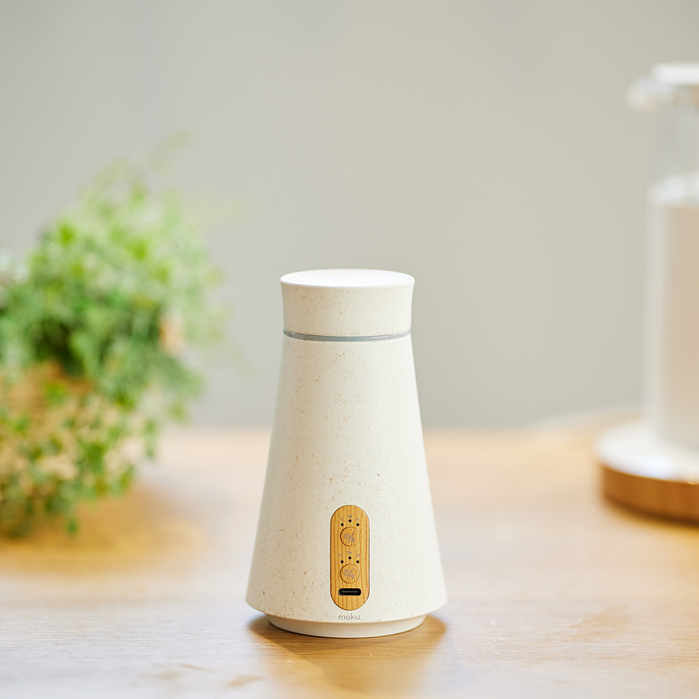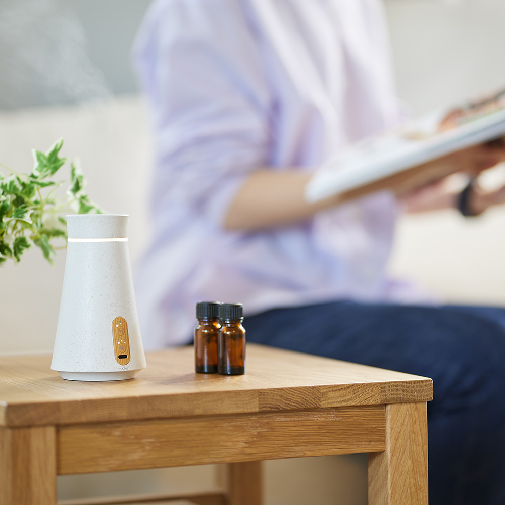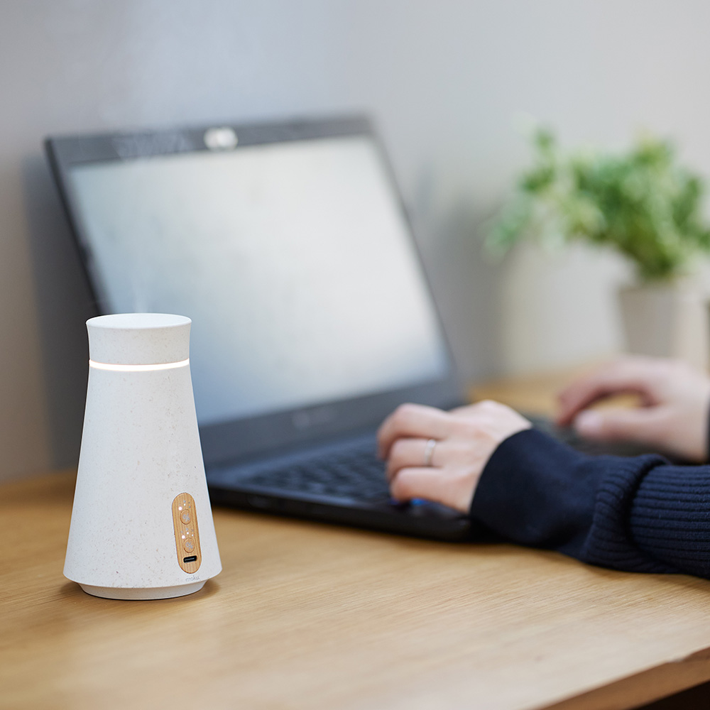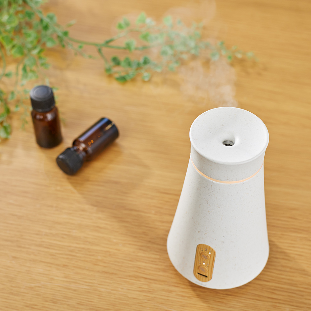 再生資源であるバイオマスを使用した環境に優しいアロマ噴霧器★コードレスなのでどこでも使えます★温かみのある木目調パネルとLEDライトが安らぎを与えます★細かい粒子で、すばやく空間に拡散。粒子が落下しないため机や周囲の家具を濡らしません★静音運転、使用までのセットも簡単、水を使わないのでお手入れも簡単です