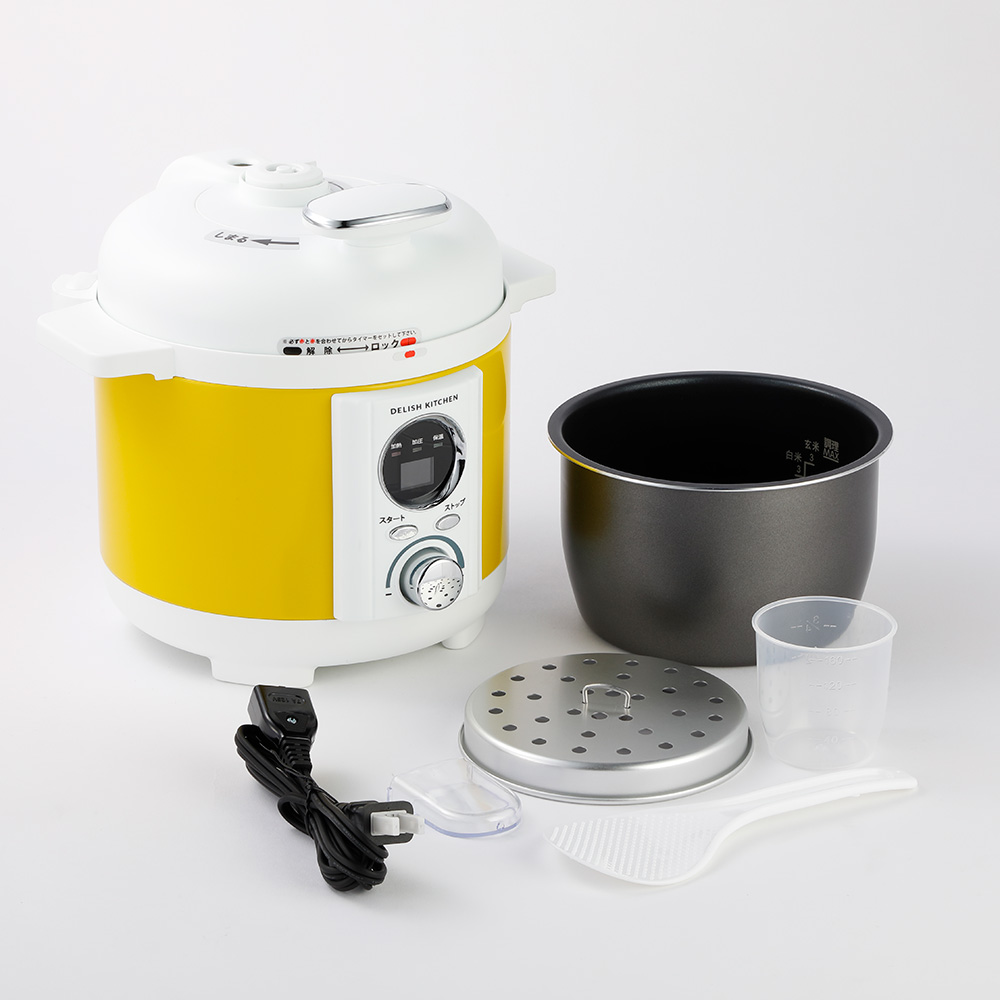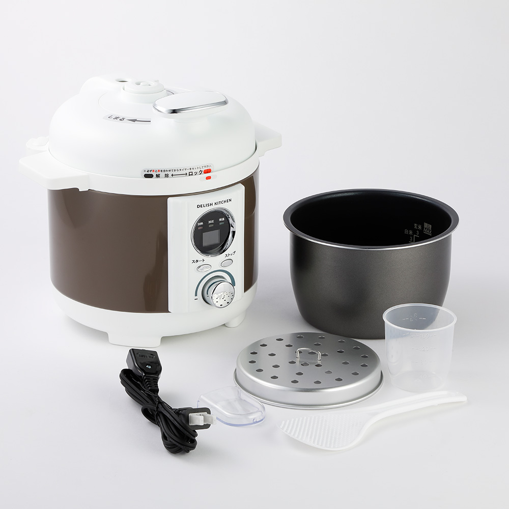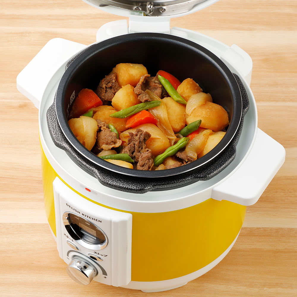 年末年始のおもてなし、おせち作りに大活躍!スイッチを押したらほったらかし。時短で簡単調理の電気圧力鍋。人気のレシピ動画メディア「DELISH KITCHEN」が手がける、電気の圧力鍋スピードクック!年末年始の味方として頼れる電気圧力鍋が登場!火を使わず、材料を入れてスイッチを押すだけで、加熱から加圧、減圧まで全自動で調理が完了する電気圧力鍋。忙しい年末年始のおもてなし料理や、おでん、おせち作りに、まさに心強い味方です。失敗することもなく、時短で美味しく!家族や大切な人との食事がもっと楽しくなります♪材料を入れてタイマーセット、あとはゆったり待つだけの簡単調理圧力鍋は難しそう、怖いというイメージをお持ちの方も多いかもしれませんが、この電気圧力鍋なら安心。材料を入れてスイッチオンで、あとはほったらかしで本格的な味わいが楽しめます。忙しい日々の中でも、手軽にホカホカの温かい美味しい料理が完成します!デリッシュキッチン監修の50レシピ付きで、毎日の献立も楽しく付属のレシピブックには、デリッシュキッチン監修の50種類のレシピが掲載されています。さらに、レシピ横のQRコードをスマホで読み込めば、わかりやすい動画で作り方を確認できるので、料理が苦手な方でも安心してチャレンジできます。いつも買ってきていたモツの煮込みやおでん、サラダチキンなど手作りは無理、、と思っていた料理も自宅で作れるんです!無添加でしかも、ずっと美味しい!家族みんなに驚かれること間違いなしです。2〜3人分にぴったりの1.2Lサイズ、平日の作り置きにも最適2〜3人分にちょうど良い1.2Lタイプは、少人数のご家庭や平日の作り置きにぴったりのサイズ感。調理容量は最大1.2L、豆類は0.6Lまで対応しているので、無駄なく使い切れます。毎日の食事準備がぐっと楽になりますよ。丸洗いできていつも清潔、使いやすさも◎ですフタや内釜は取り外して丸洗いできるので、いつでも清潔に保てます。洗うパーツが少なく、使いやすさにもこだわりました。毎日のお手入れが簡単だから、長く快適にお使いいただけます。安心・安全の証、SGマーク・S-JETマーク取得済み安全面も万全。SGマークとS-JETマークを取得しているので、安心してお使いいただけます。大切なご家族のために、信頼できる調理器具を選びたい方におすすめです。