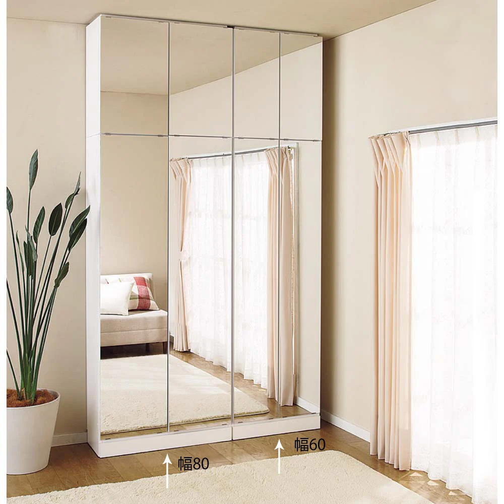 ≪組合せ例≫(ア)前面:ミラー・本体:ホワイト 写真は奥行44cm、幅60、80cm(各2本)の本体と幅60、80cm(各2本)の上置きとの組合せ例です。 ※写真の天井高さ240cm。