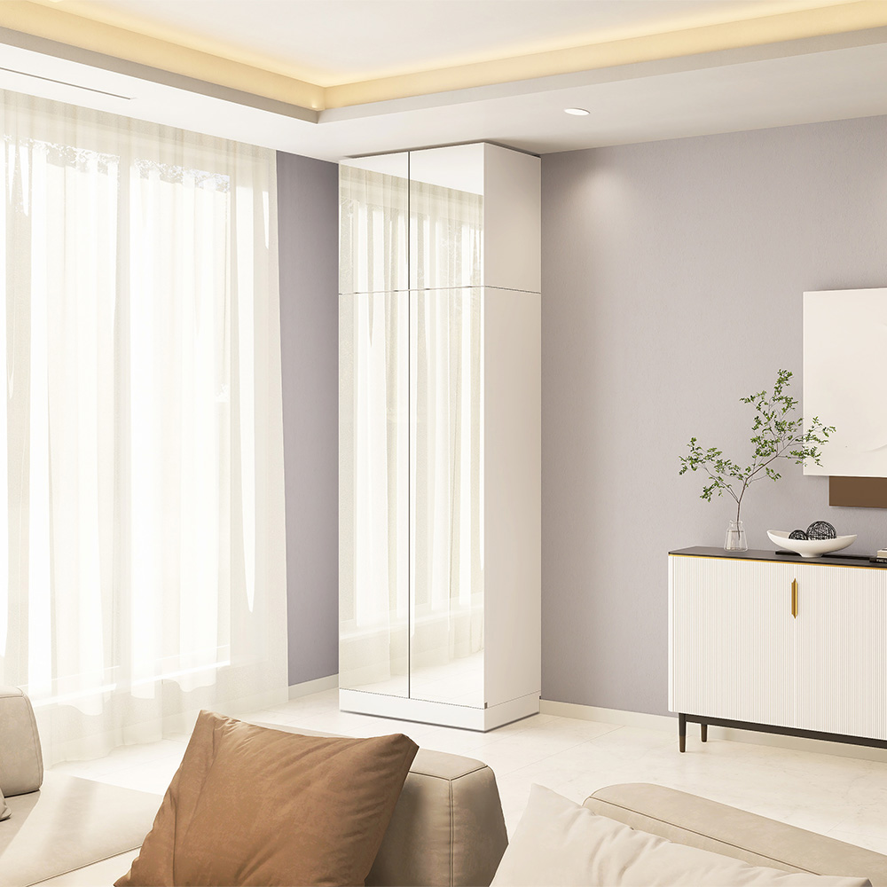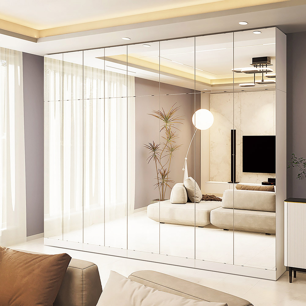 ≪組合せ例≫(ア)前面:ミラー・本体:ホワイト ミラータイプはお部屋を広く演出します。 ※写真は本体と上置きの組合せです。 ※写真は天井高さ240cmです。