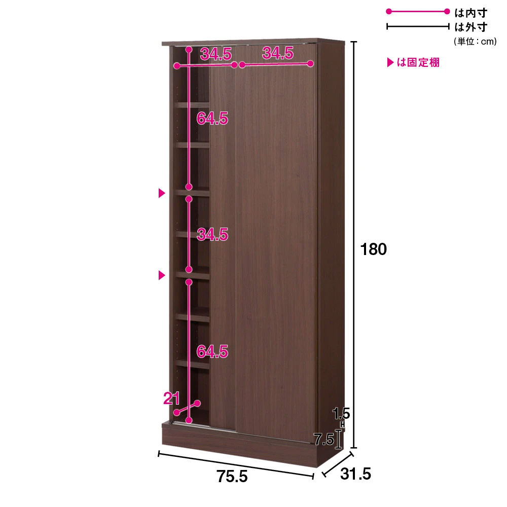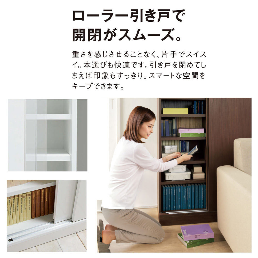 [組立不要][省スペース][人気のロングセラー商品]開閉スペースのいらない引き戸タイプ。シンプルなデザインでスッキリとした印象のブックシェルフ。頑丈棚板で大量収納が叶います。サイズオーダー上置き(別売)と組み合わせれば、壁面収納が実現。お部屋を広く見せるミラータイプも大きな魅力です。【POINT 1】頑丈で大量収納OK。●棚板1枚当たりの耐荷重約30kg。●棚板は厚み3cmの積層合板でガッチリ頑丈な仕様です。●3cmピッチの棚板で、お客様の用途に合わせた調節が可能です。【POINT 2】しかも、省スペース。●開閉に場所をとらない、省スペースの引き戸式ラック。●薄型スリムで、廊下やリビング、寝室でお使い頂くのもおすすめです。●ローラー仕様の引き戸のため、つっかかりがなくスムーズに開閉できます。●文庫本、コミック、雑誌、CD・DVDなどをすっきり収納するのに便利です。●廊下や玄関でシューズボックスとしても活躍します。【POINT 3】女性も安心!組立不要の完成品でお届けします!●面倒な組立は不要。届いてすぐにお使い頂ける、人気の完成品タイプです。●オフィス、書斎、リビングやキッズルームにある大量の本を、一気に収納してすっきりできます。●安心の日本製(国産)。職人が心を込めて丁寧に仕上げます。【POINT 4】まるで造り付け家具のように、美しく。●シンプルでお部屋に馴染みやすく、リフォームしたような空間が叶う壁面収納書棚です。●前面扉のをタイプを選べるのが人気のポイント。●前面をミラーすれば、開放感のある広々としたお部屋になります。●前面を本体色(ホワイト・ダークブラウン)に合わせるれば、壁と馴染んですっきりとしたお部屋に。●高さがオーダーできる上置き(別売)と合わせれば、天井まで無駄なく大量収納できるシェルフです。●幅木対応で壁にぴったりと設置できます。