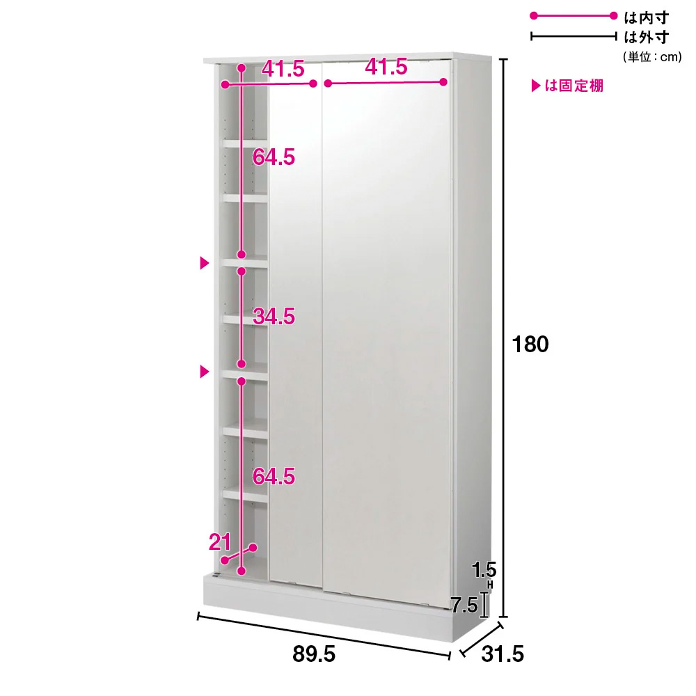商品イメージ(ア)前面:ミラー・本体:ホワイト 写真は幅89.5cmタイプです。