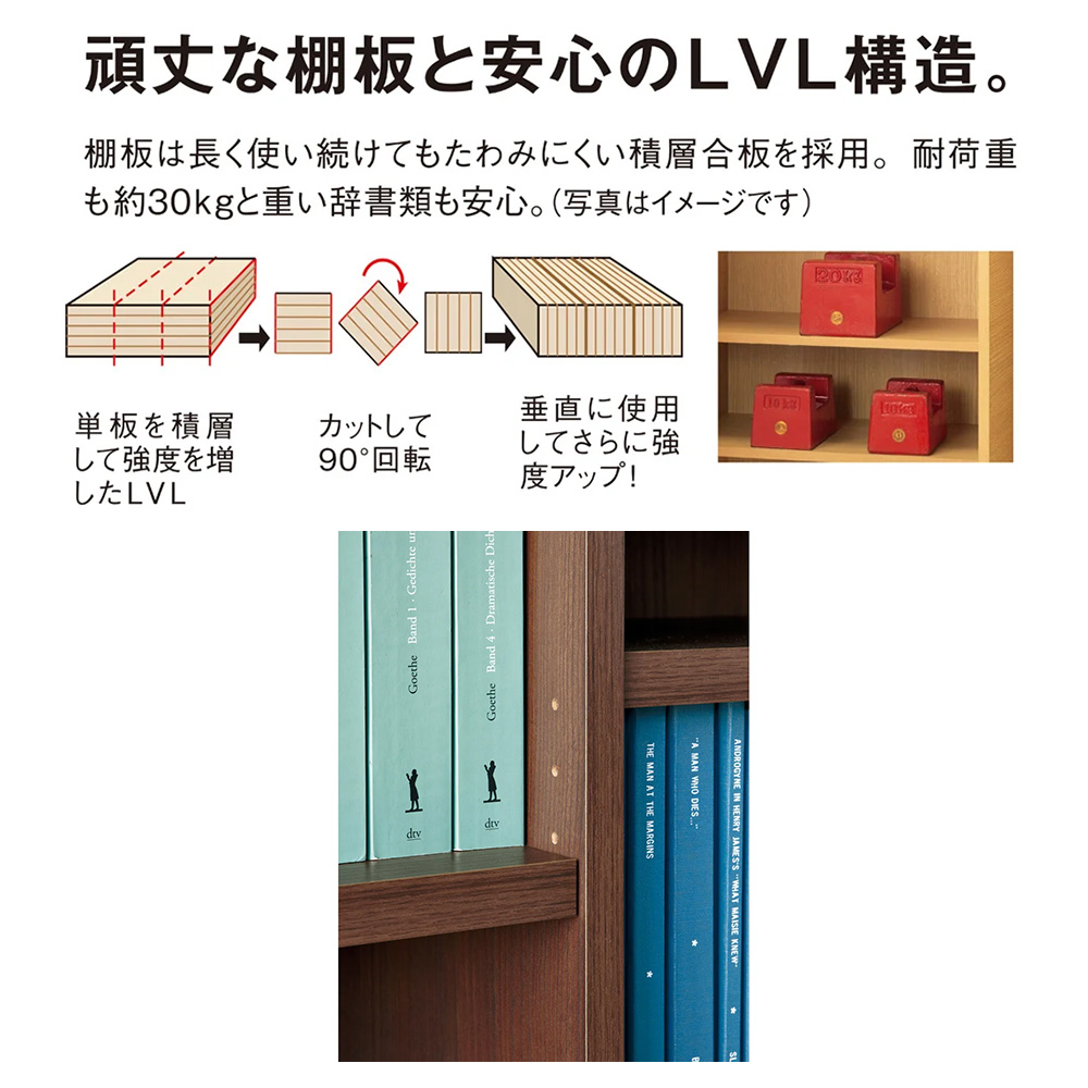 棚板はLVLを使用し、厚さも2.5cmの頑丈さ。重たい本類も安心して収納できます。 ※棚板耐荷重は1枚当たり約30kg