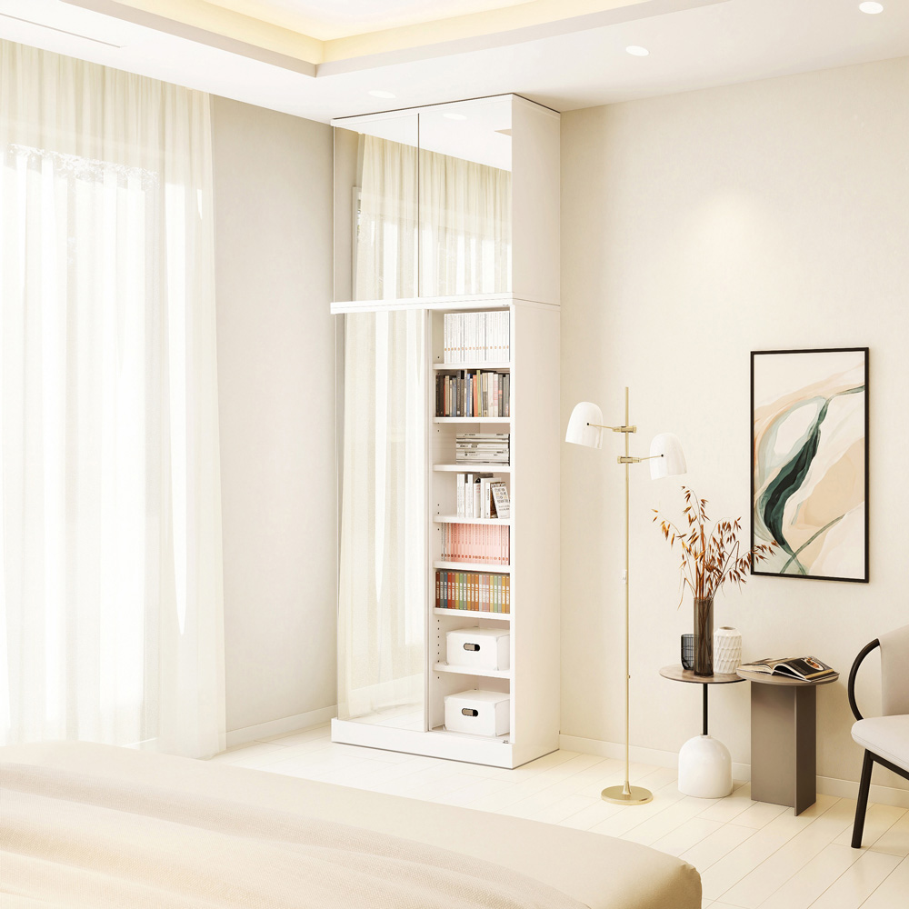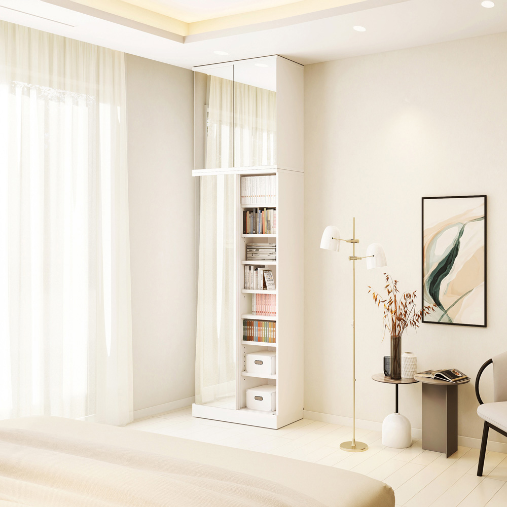 コーディネート例 開閉スペースいらずの引き戸式。ミラータイプはお部屋を広く演出します。 ※(ア)前面:ミラー・本体:ホワイト ※写真は奥行44cmタイプです。