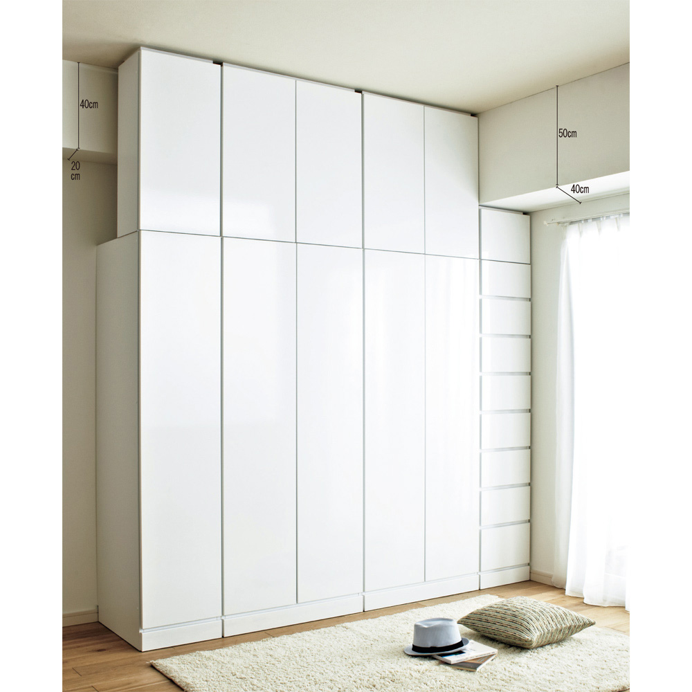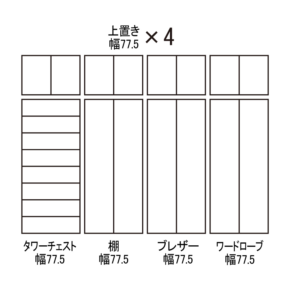 豊富なサイズ、前面ミラー貼り等、多彩なラインナップからご自宅に合わせてオーダー感覚で選べる収納家具シリーズ。別売りのオーダー上置きを追加して、壁一面に造り付けのクローゼット収納のように美しい国産家具。豊富なサイズ、板扉とミラー扉から選べる表面材、クローゼットハンガー・ブレザー・棚・タワーチェストから選べる内部構造、多彩なラインナップから、自由に組み合わせて頂ける人気のシリーズ!組み合わせ次第で、壁一面に大容量のクローゼットが完成します。表面材の仕様は、寝室などの設置しても空間が広く見えるミラー扉タイプ、美しい光沢のホワイト色の板扉タイプからお選びいただけます。クローゼットにはハンガー掛けの衣類や、畳ものの衣類やタオル、バッグや収納ケースなどさまざまなサイズのものを収納します。狭いスペースでも最大限に効率収納する為に、ハンガーラック・ハイチェスト(多段チェスト)・棚収納と豊富なタイプをご用意しております。【使い心地の良さを追求した機能性のポイント】●お手入れがしやすく、インテリアに馴染む表面材を使用しています空間が広々と見えて、姿見としても便利なミラー扉タイプ、光沢が美しいホワイト色の板扉タイプからお選びいただけます。ミラー扉タイプには3mmの厚さのミラーを扉に貼り付けた仕様。板扉タイプはキズに強く、汚れてもお手入れが楽な素材を使用しています。●8段の引き出しで大量収納!衣替えも楽々高さ180cm全段引き出しのタワーチェスト畳んだ衣類やタオルが大量に収納できます。引き出しの内部は衣類にやさしい化粧仕上げです。最下段の深引き以外の7段の引き出しは全てサイズが同じなので、引き出しごと入れ替え可能で衣替えも楽チンです。●商品同士はしっかり連結できるのですき間なく美しい仕上がり本体同士、上置きと本体は付属のジョイントネジで上下・左右に連結可能。ずれやゆがみを防ぎ、すき間なく美しく配置。●天井までピッタリ美しく!梁がある場所にも設置できます同シリーズの突っ張り上置き(別売)は、ご自宅の天井の高さに合わせて天井高さ202〜272cmの範囲で、1cm単位で高さサイズオーダーを承ります。また梁がある場所にも設置できるよう、奥行26cmの上置きもご用意。最大奥行30cmまでの梁を避けて設置が可能です。また上置きの突っ張り部分の金具が見えないよう、幕板で四方囲んで隠しているので美しい仕上がりです。〜お客様から続々と喜びの声が届いています●鏡タイプなので、大きい割に圧迫感がなくて気に入っています。(ハンガー幅77.5cmタイプを購入 兵庫県)●子供部屋の仕切りで購入。立ち鏡、収納天井にある梁までの部分まで埋まる収納という要望をオーダーで応えてくれて満足しています。(棚 幅39センチタイプを購入 東京都)●デザインが良く、引き出しの奥行きも高さも十分あるので、衣類が入れやすいです。家では洗面脱衣所においていますが、洗面台の横に肌着や細々したものが収納できて大満足です。(タワーチェスト幅39cmタイプを購入 大阪府)