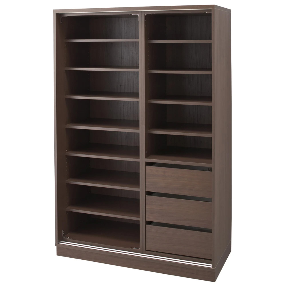 コーディネート例(ウ)前板:ミラー・本体:ダークブラウン ※お届けは写真中央の幅118cm棚タイプです。 ※写真は別売りの幅148cmハンガータイプ、幅88cmハンガータイプ、上置き3本との組合せです。 ※天井高さ260cmで撮影しています。
